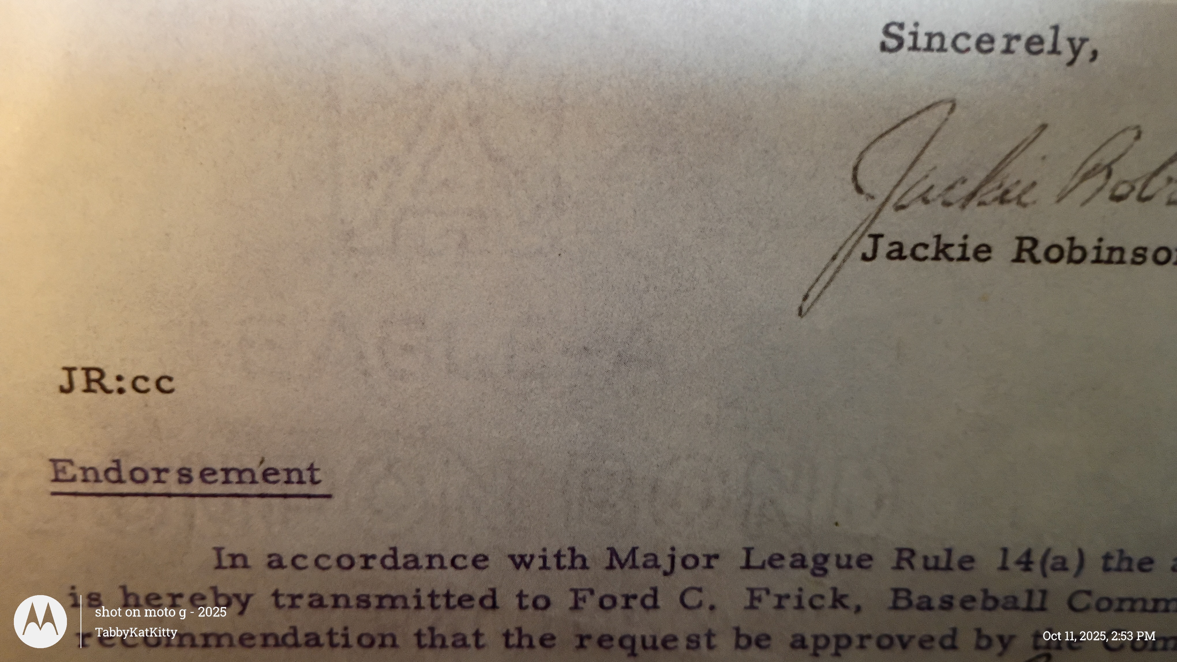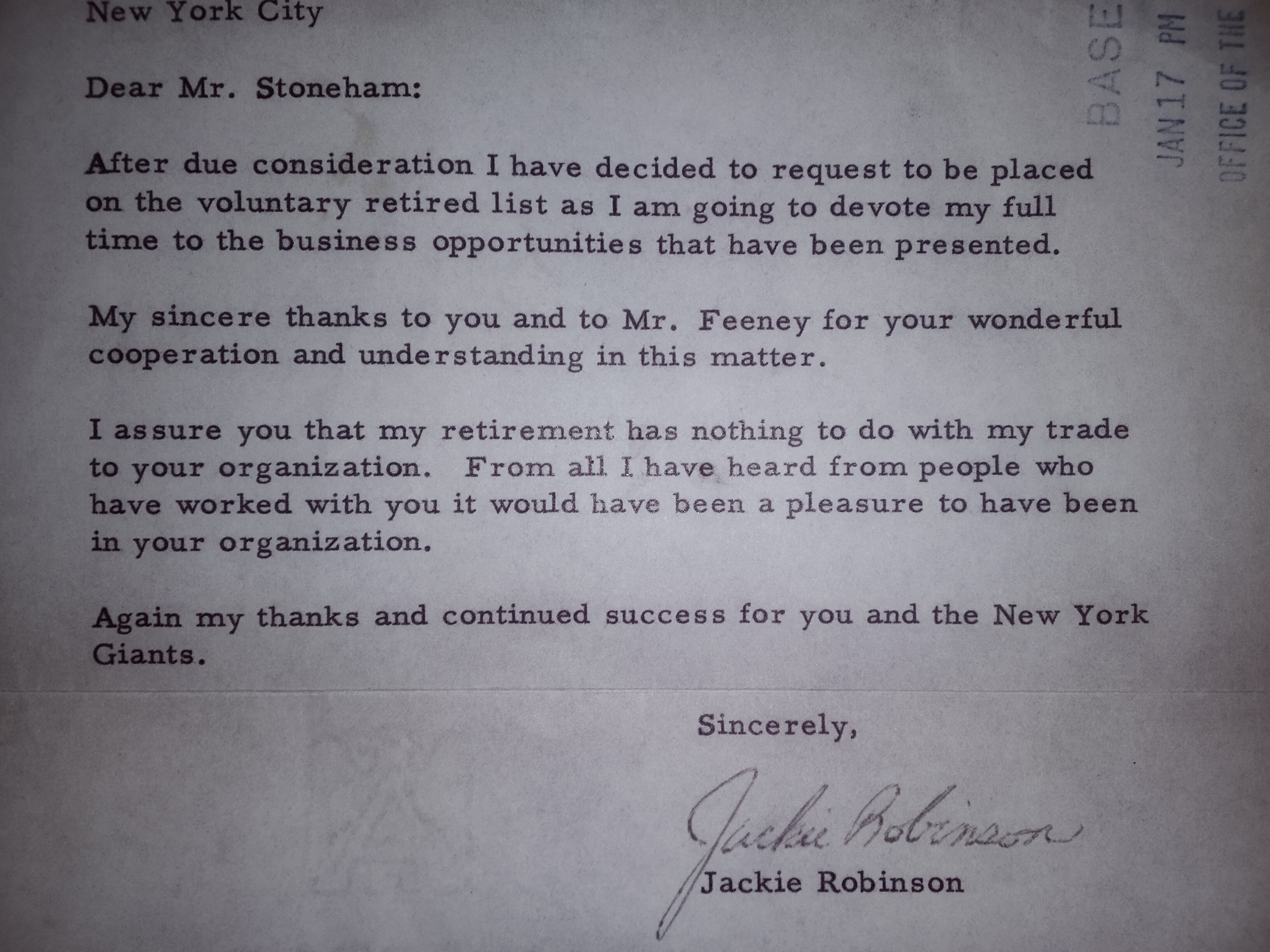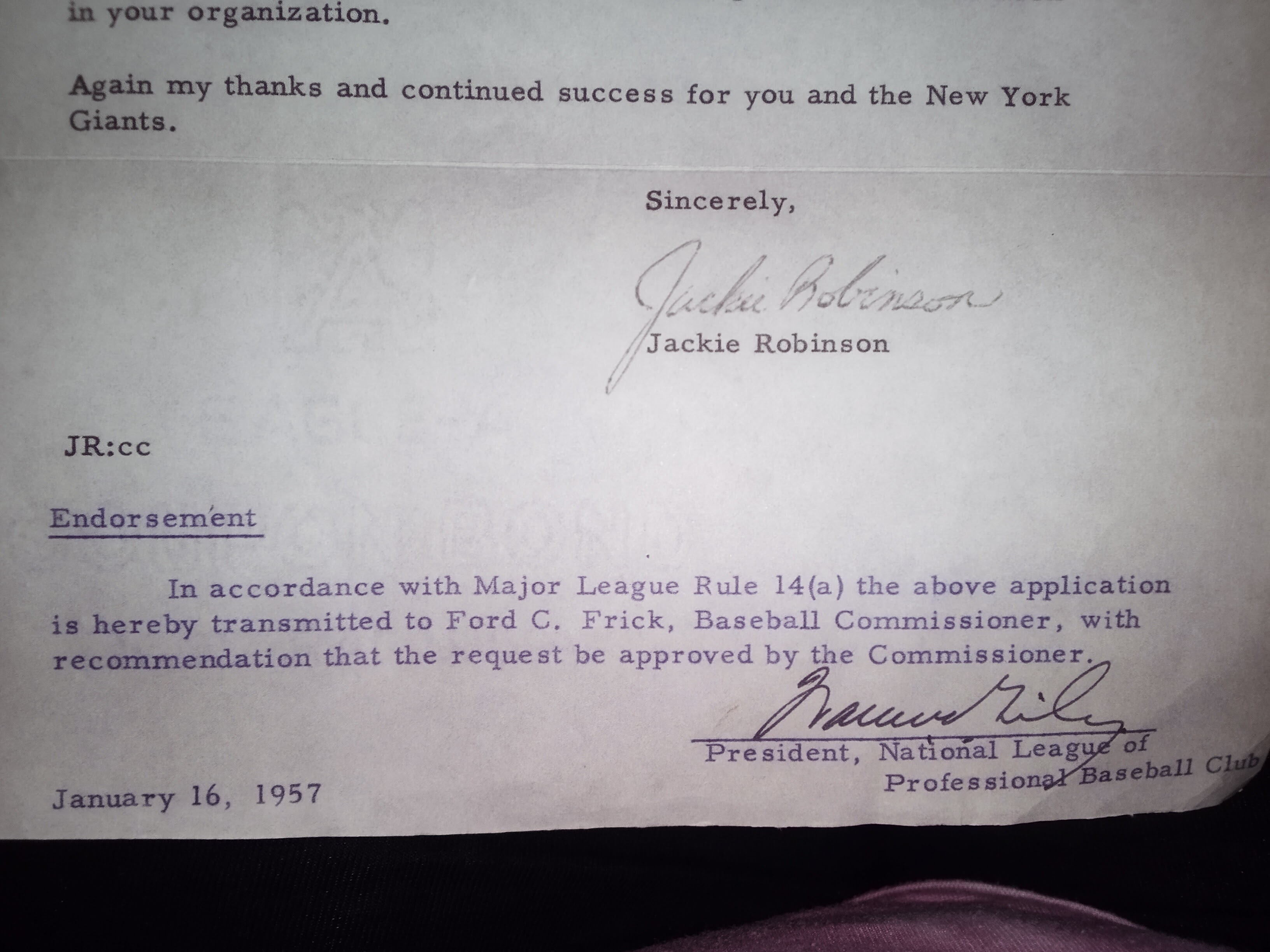 Jackie Robinson retirement letter autographed & approved by Warren Giles
