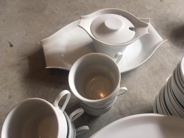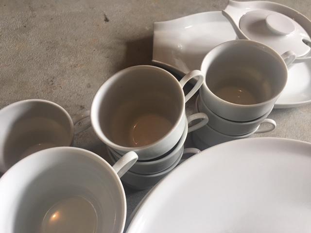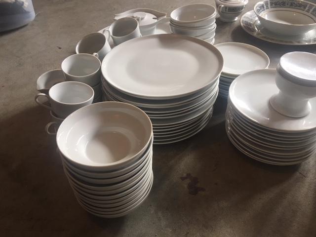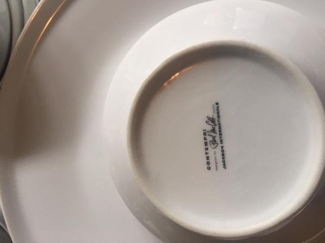 Set of Jackson Internationale Mid Century Contempri dishes by Paul McCobb. Set of 12 dinner plates, salad plates, teacups, saucers, bowls and dessert bowls. Also a covered sugar bowl, platter, gravy boat, larger covered bowl with cover and slot in cover.
