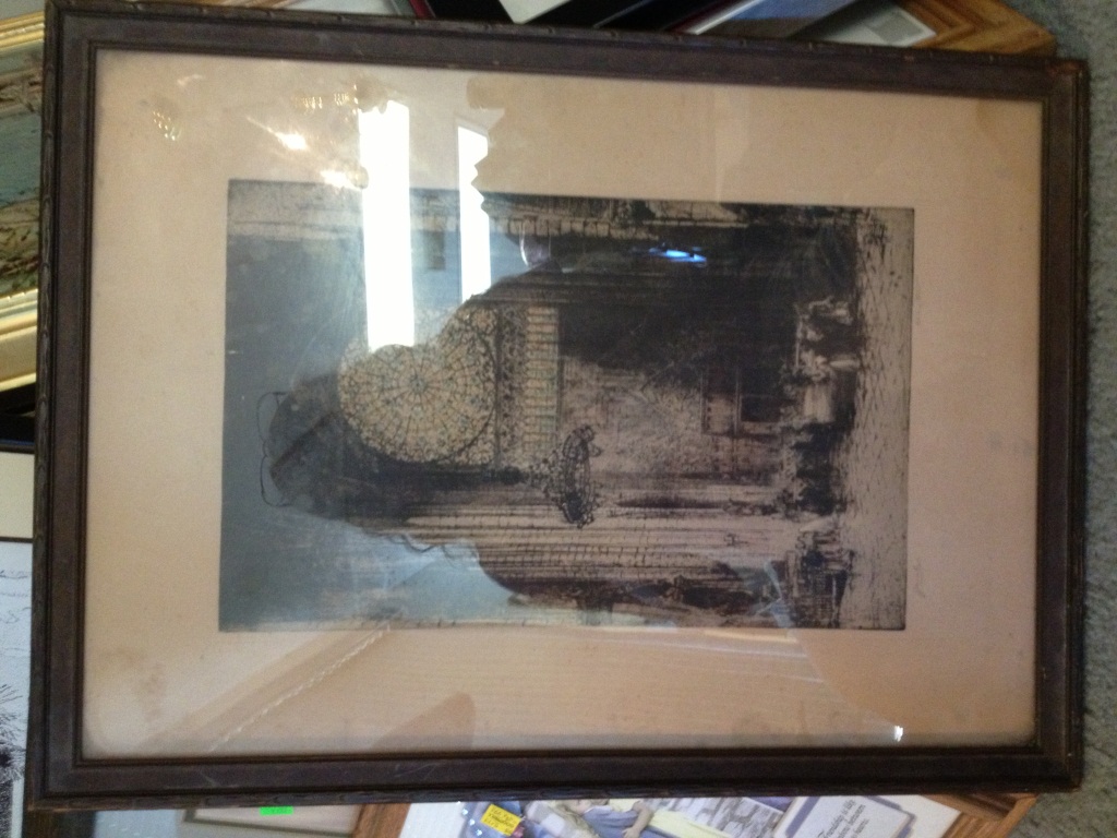 A "Jacobi Reproof" titled "Rose Window Notre Dame", "after a Signed Proof Etching by Hedley Fitton R.E." The piece is signed "Jacobi" and Hadley Fitton on the front. On the back on a typeset description of the Cathedral of Notre Dame secured to the paper of the frame there is the following handwritten items (without quotations): "2636", "8/10", "Reproof" and then the signature "Jacobi" again.