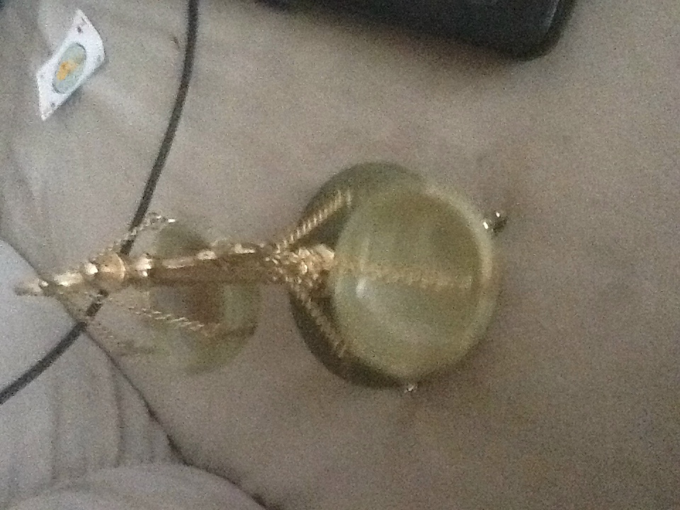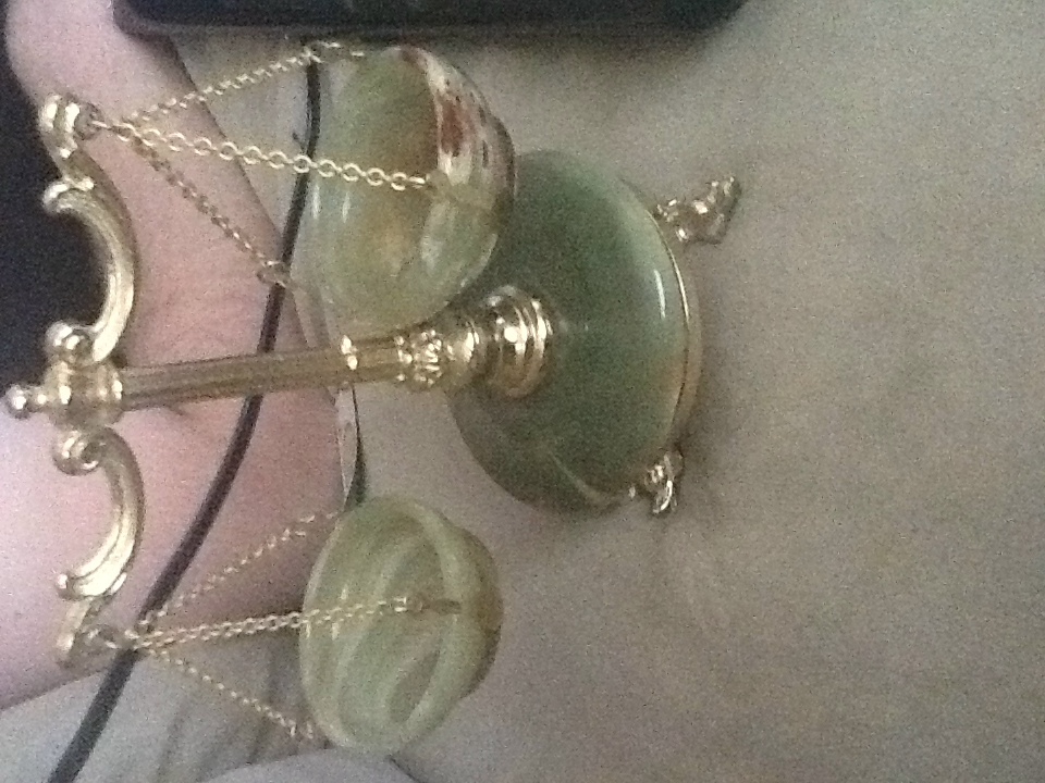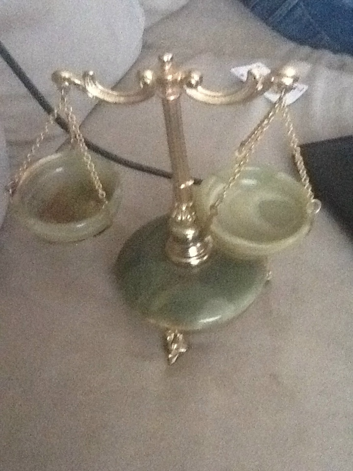 This item is a decorative balance scale that has a jade base and bowls. the rest is made of a gold color material. The legs are shaped into sea dragons. There are no marks on the piece except for a sticker on the bottom which has a written number.