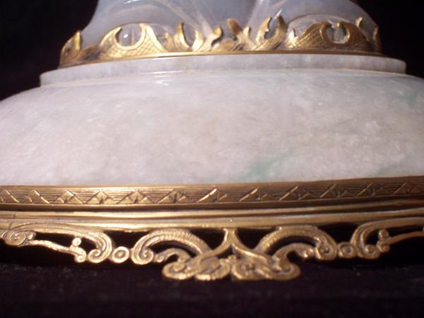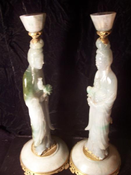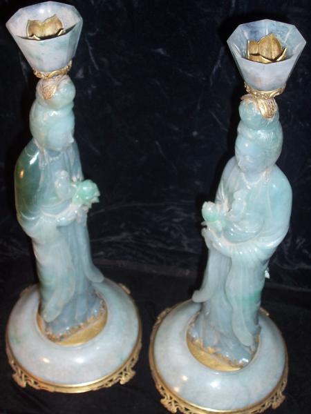 These two hand carved jade figurines are 15.5" tall. Edward I Farmer, NYC is stamped on the bottom. The accents are brass.