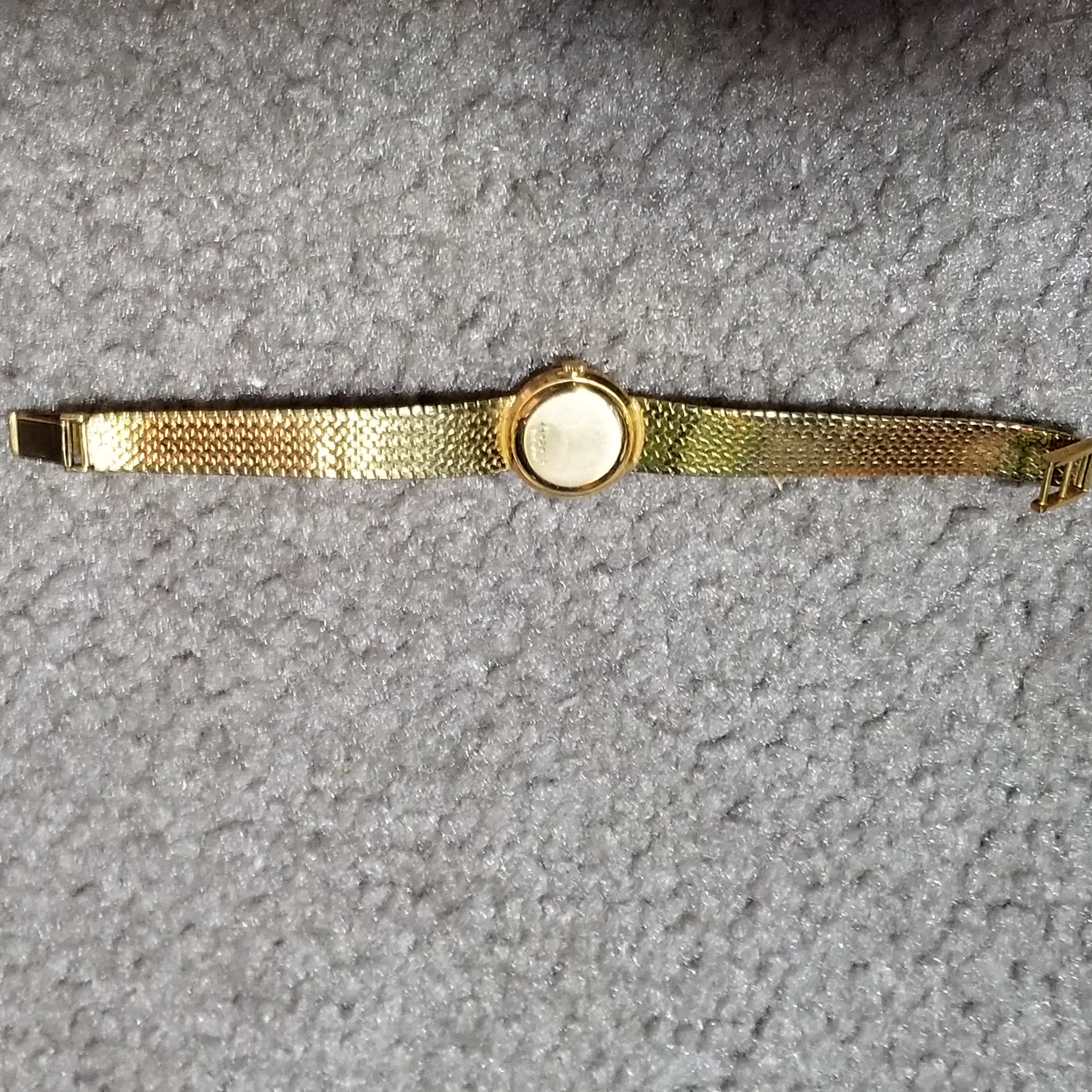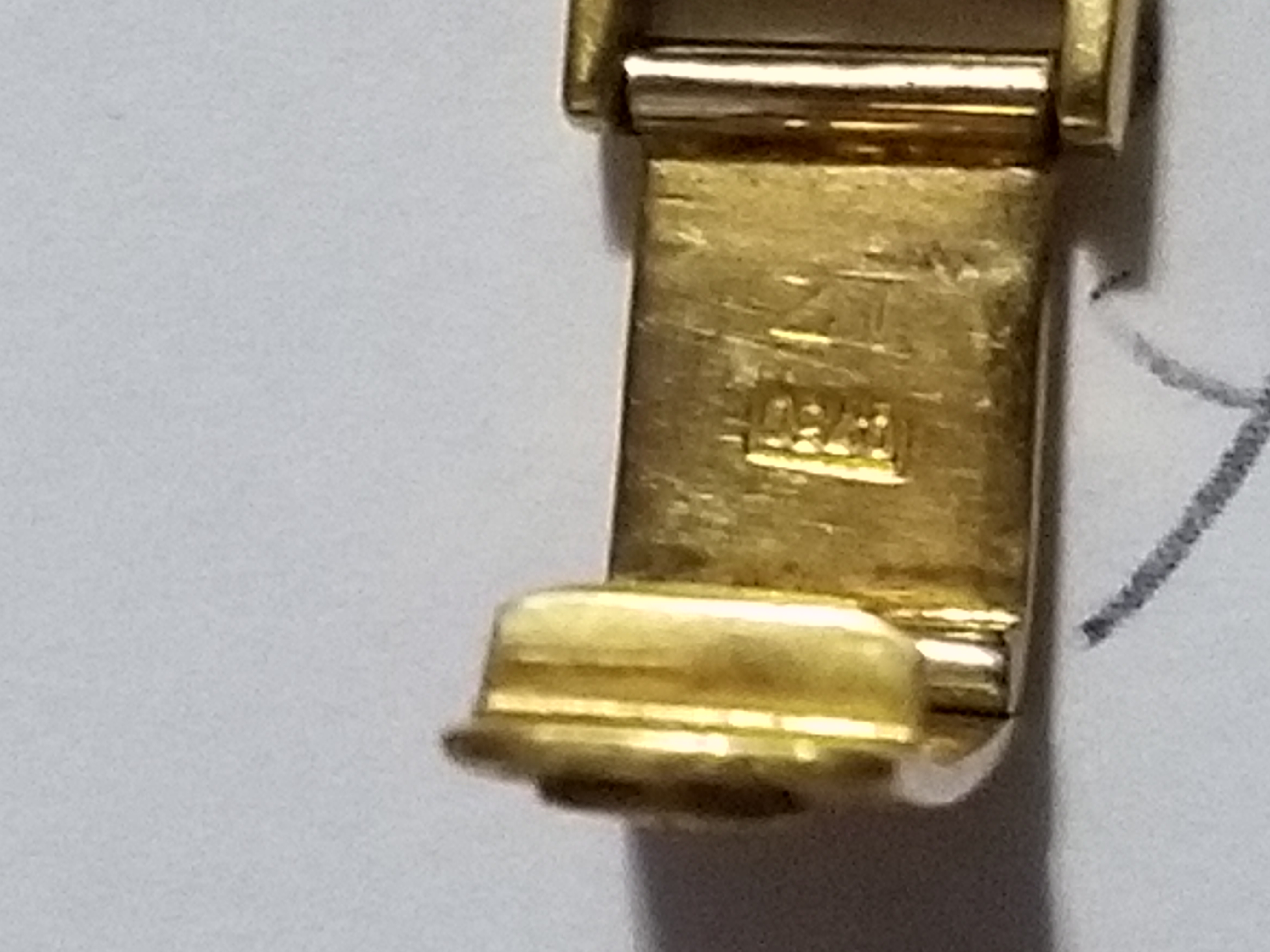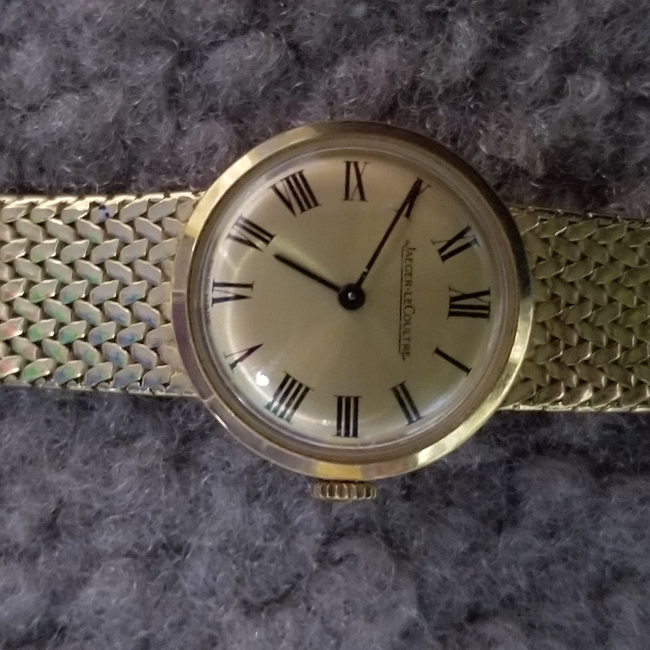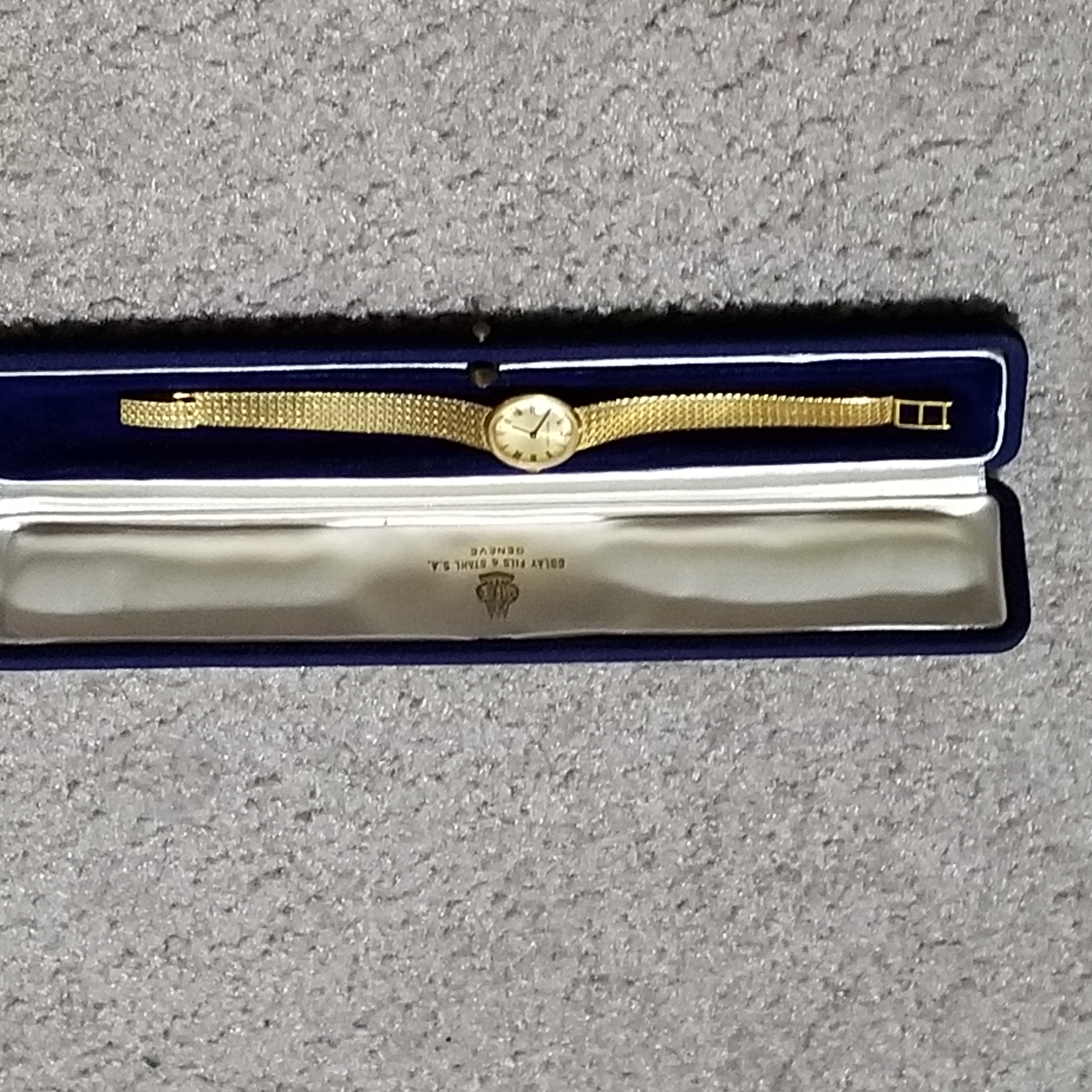 Jeager LeCoultre Gold Ladies Wrist Watch in a Golay Fills & Stahl S.A. Geneve box. Number 1120228 on back of watch. #750 on clasp I think