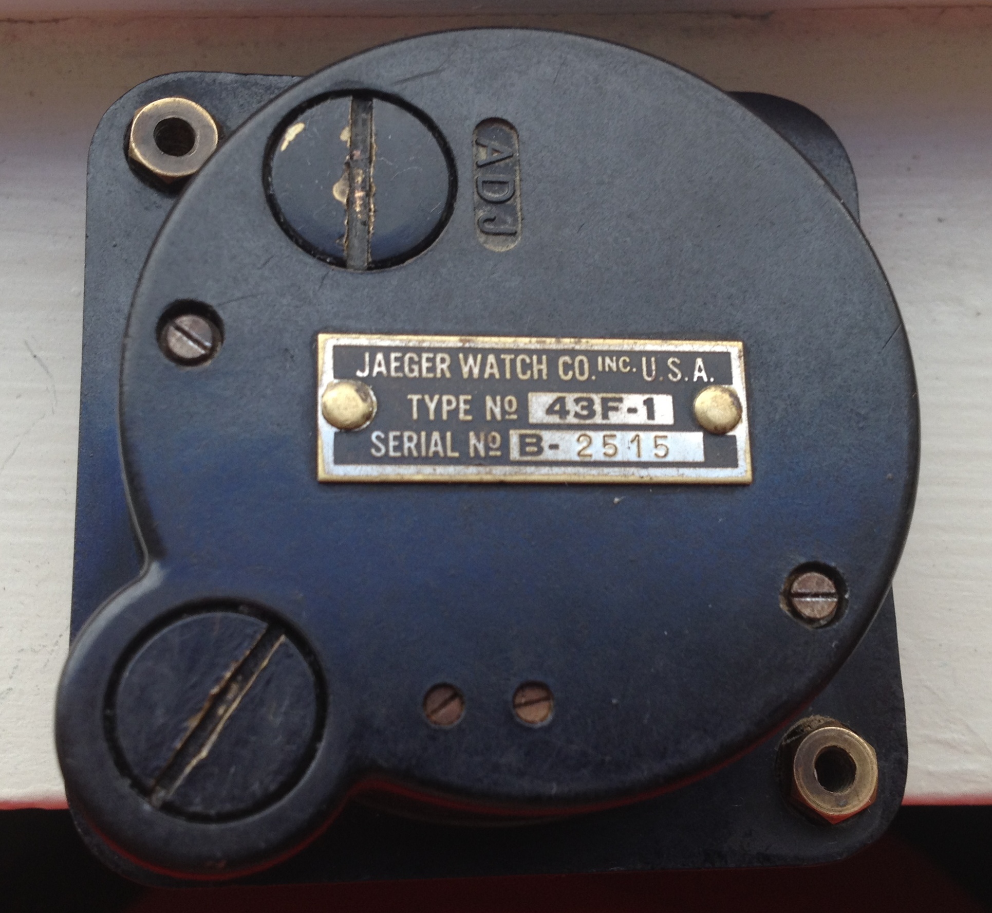 The clock is signed "JAEGER WATCH CO. INC. U.S.A. TYPE No. 43F-1, Serial No.B-2515".
