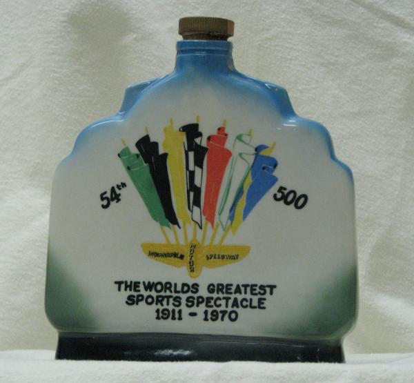 On one side the decanter is shaped like a shell in shades from white to medium blue.In the center is an emblem of different racing flags, and it says 54th 500 Worlds Greatest Sports Spectacle 1911-1970. On the reverse side the shape is rectangle with a racing car and banners saying "First Race 1911, and another saying May 30th 1970.