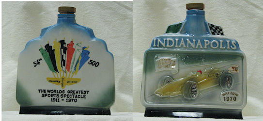 On one side the decanter is shaped like a shell in shades from white to medium blue.In the center is an emblem of different racing flags, and it says 54th 500 Worlds Greatest Sports Spectacle 1911-1970. On the reverse side the shape is rectangle with a racing car and banners saying "First Race 1911, and another saying May 30th 1970.