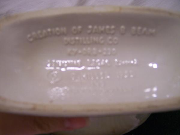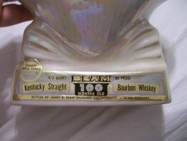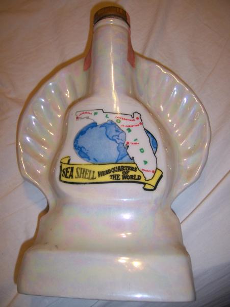 The bottle is white with an irridescent glaze. I see pinks, greens and blues in the glaze. It has the scalloping of a sea shell and on the front of the bottle is a Florida map overlaying a globe. Directly unerneath is a banner that says "SEA SHELL HEADQUARTERS OF THE WORLD" On the back of the bottle is a paper label that identifies it as 86 proof Kentuck Straight Burbon Whiskey 100 months old. The bottom of the bottle has the following in raised letters as part of the crafting "James B Beam Distilling Co KY-DRB-230 Genuine Regal China C. Miller 1968 145 Liquor Bottle" Off to the side at an angle are the letters: DHN
