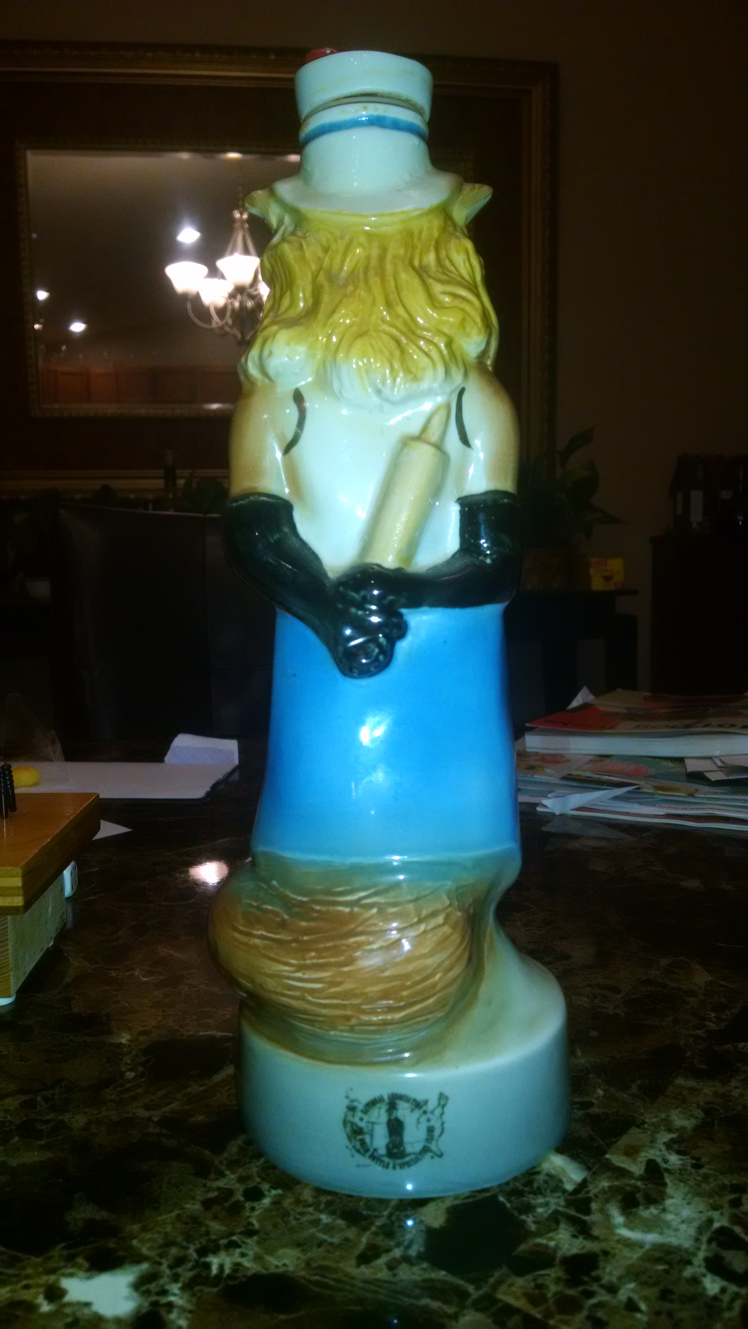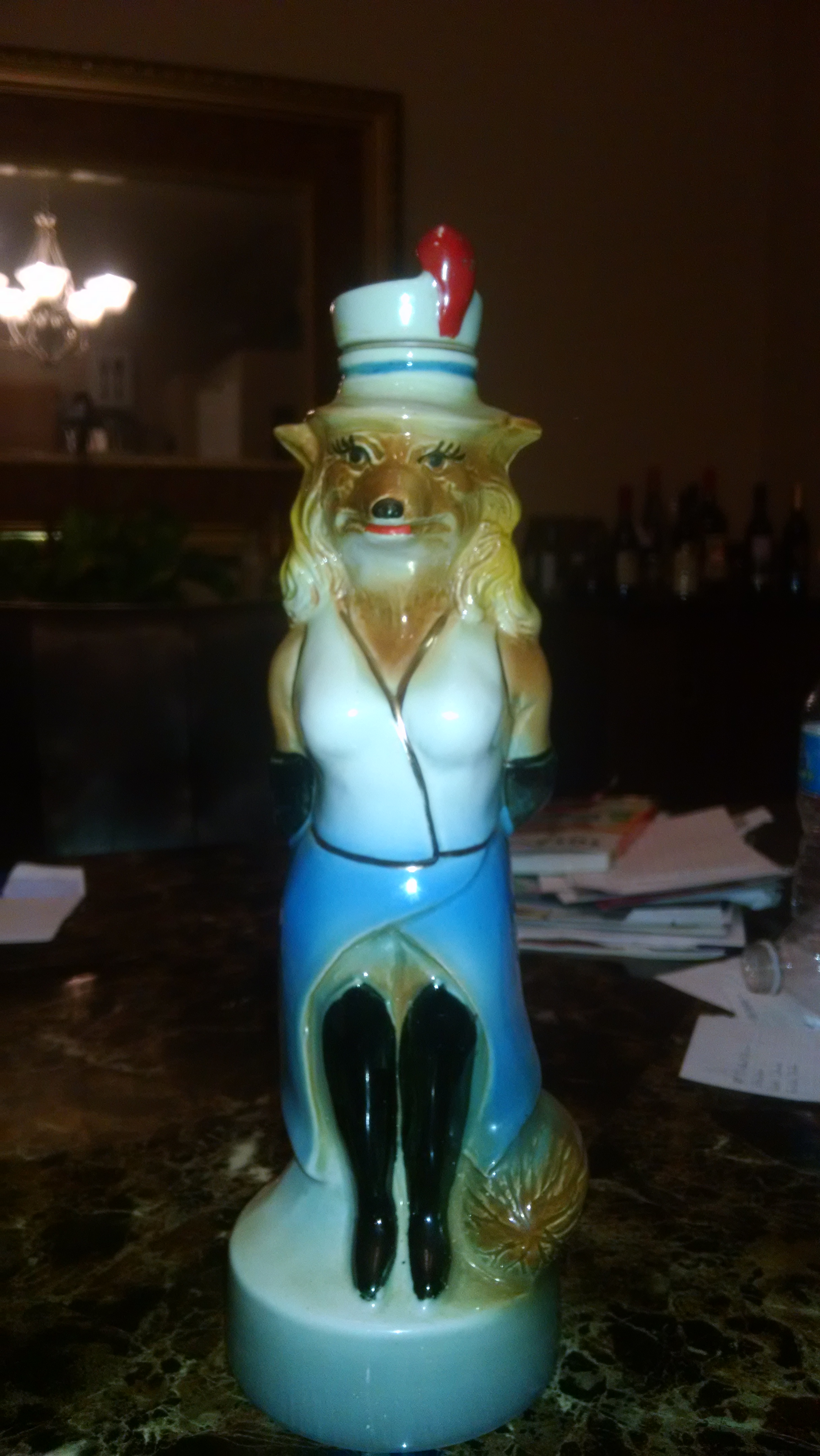 Fox liquor bottle about 12inches tall, she is marked on bottom as creation of James B Beam KY-DRB-230. Genuine Regal China 1974 C.Miller 145. Painted.Wearing a blue and white dress, black gloves and boots holding a rolling pin behind her back,