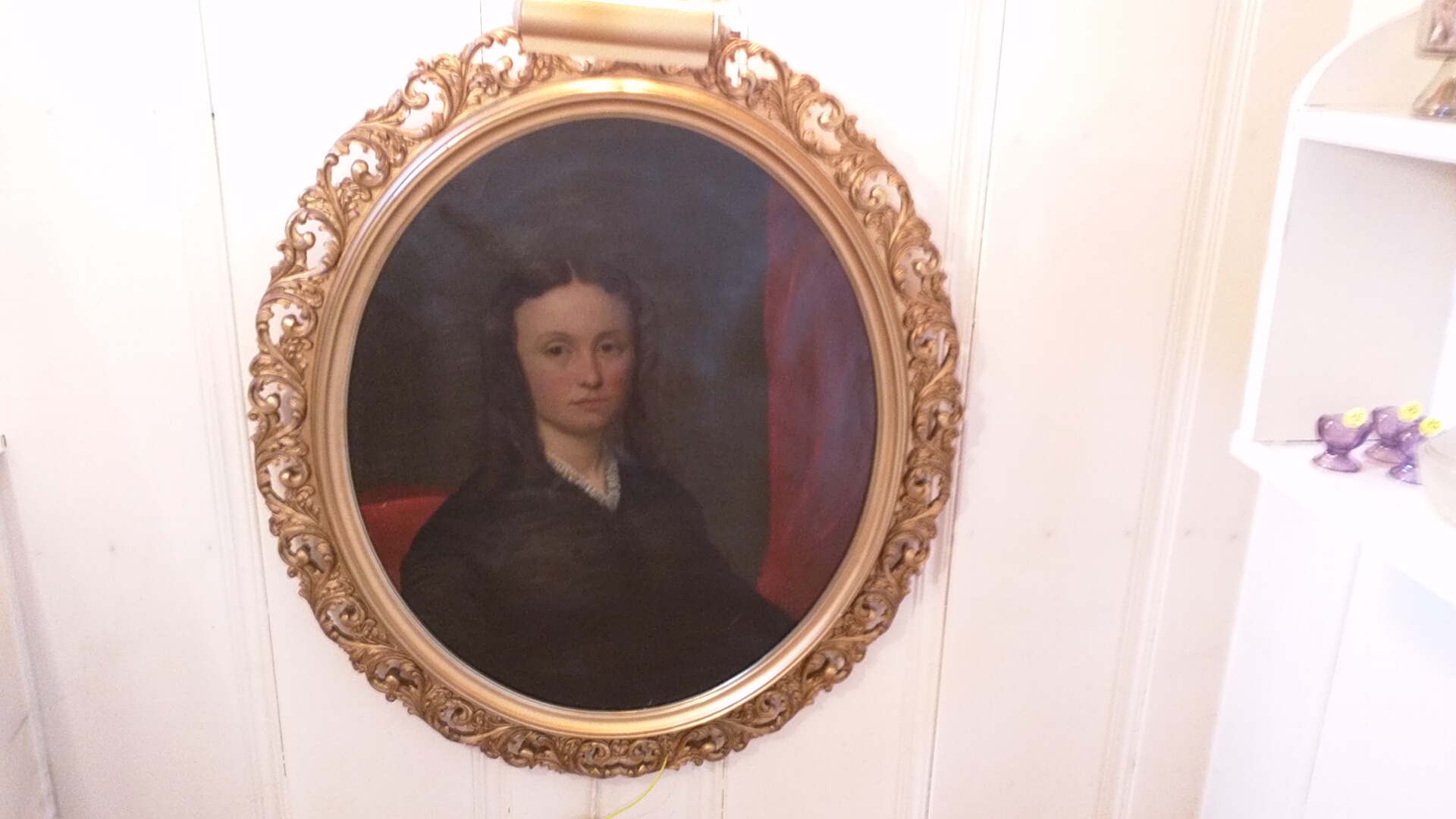Jane Portrait Oil Painting with oval ornate wood frame painted gold.