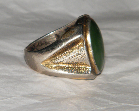 This is for a mens sterling silver ring signed Jane Yikaazba Popovitch (with of course the stamp of a circle the word 'sterling' and the interlocking 'JP"), jade ring. The jade cabochon is 20 mm by 15 mm about 15 carats, the ring is heavy about 30 grams and looks to have been gold washed when made. I bought it in Etsy for $40.40. Ill include the pics here . I would just like to know as much about the ring and it's history as possible, it's heritage, and how common jade is used in Native American jewelry.. I know she was a prominant silversmith, but not much else other than the fact her son, an eco-activist was found dead in his van on a dirt road on the reservation and though ruled accident and or suicide, many believe he was murdered by those working for the logging companies.