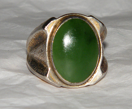 The jade cabochon is 20 mm by 15 mm about 15 carats, the ring is heavy about 30 grams and looks to have been gold washed when made.