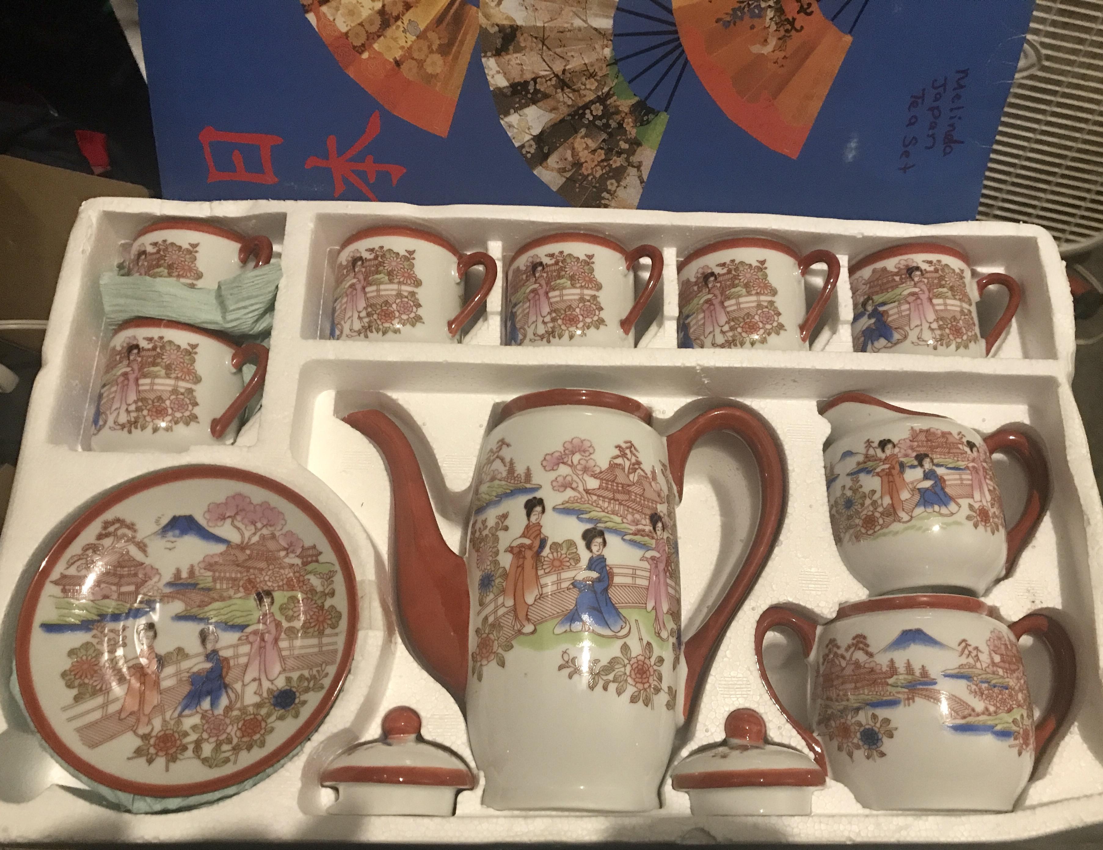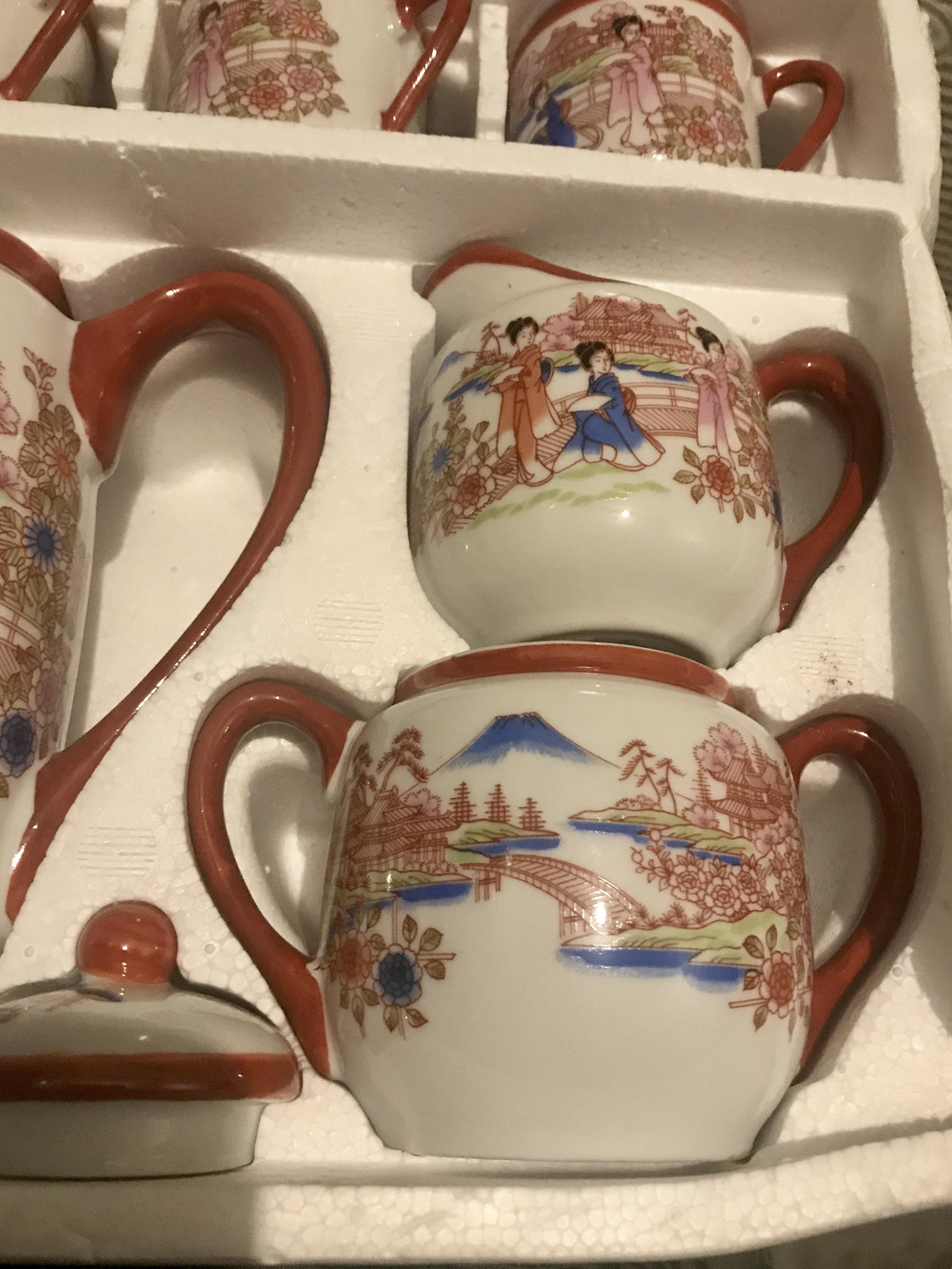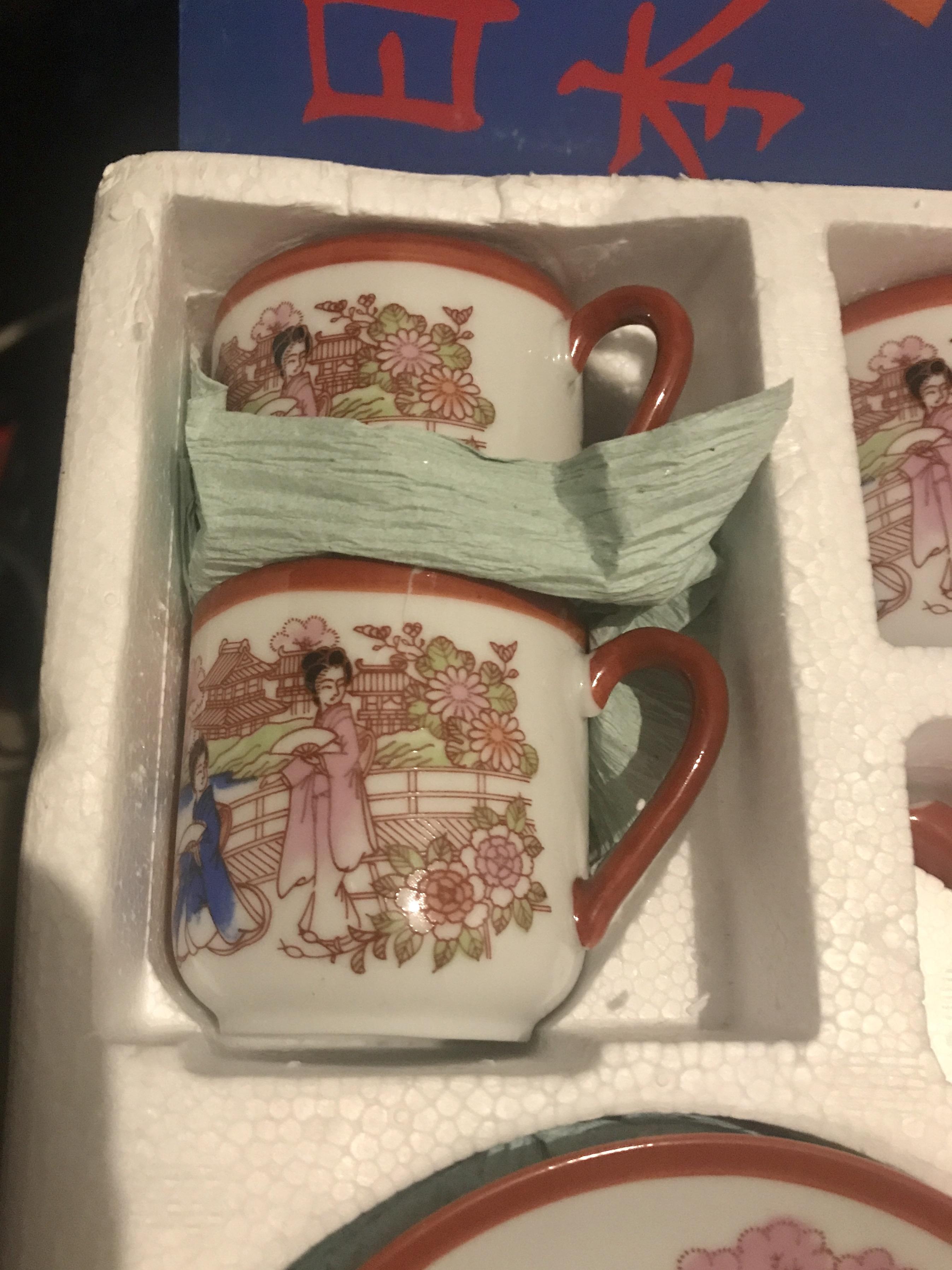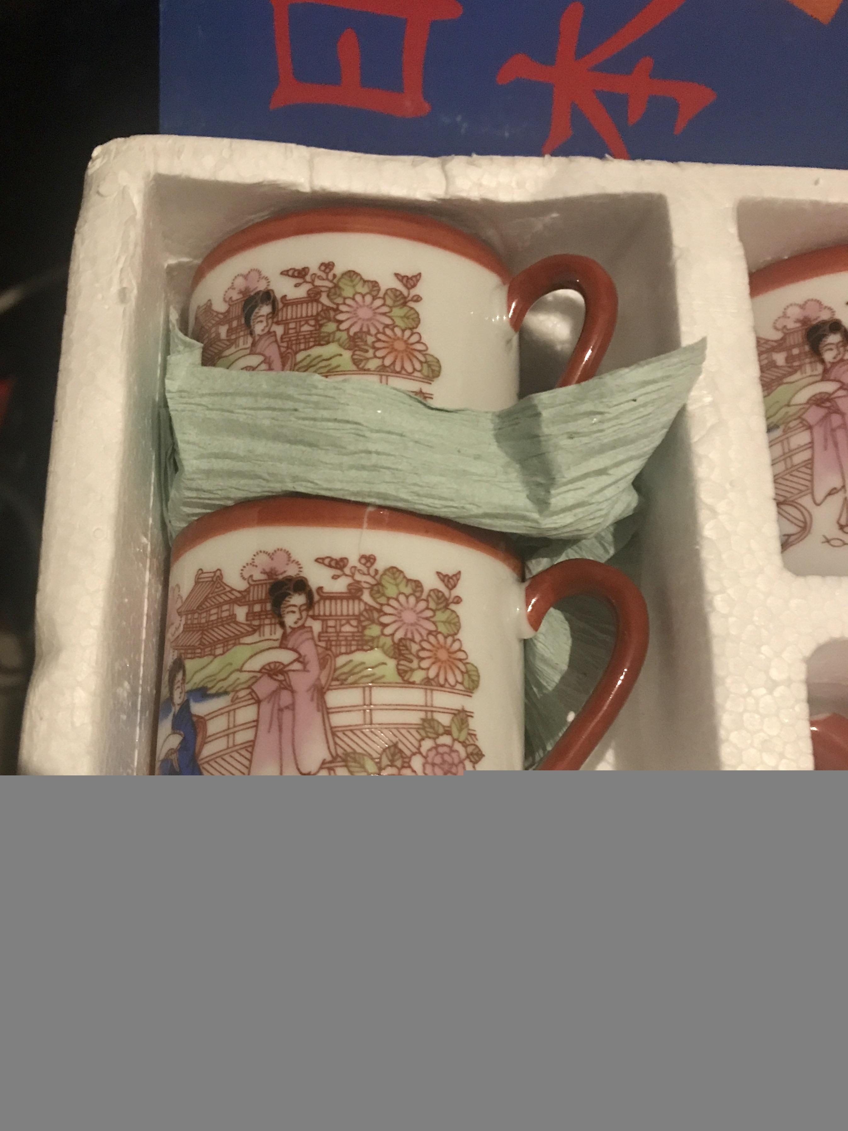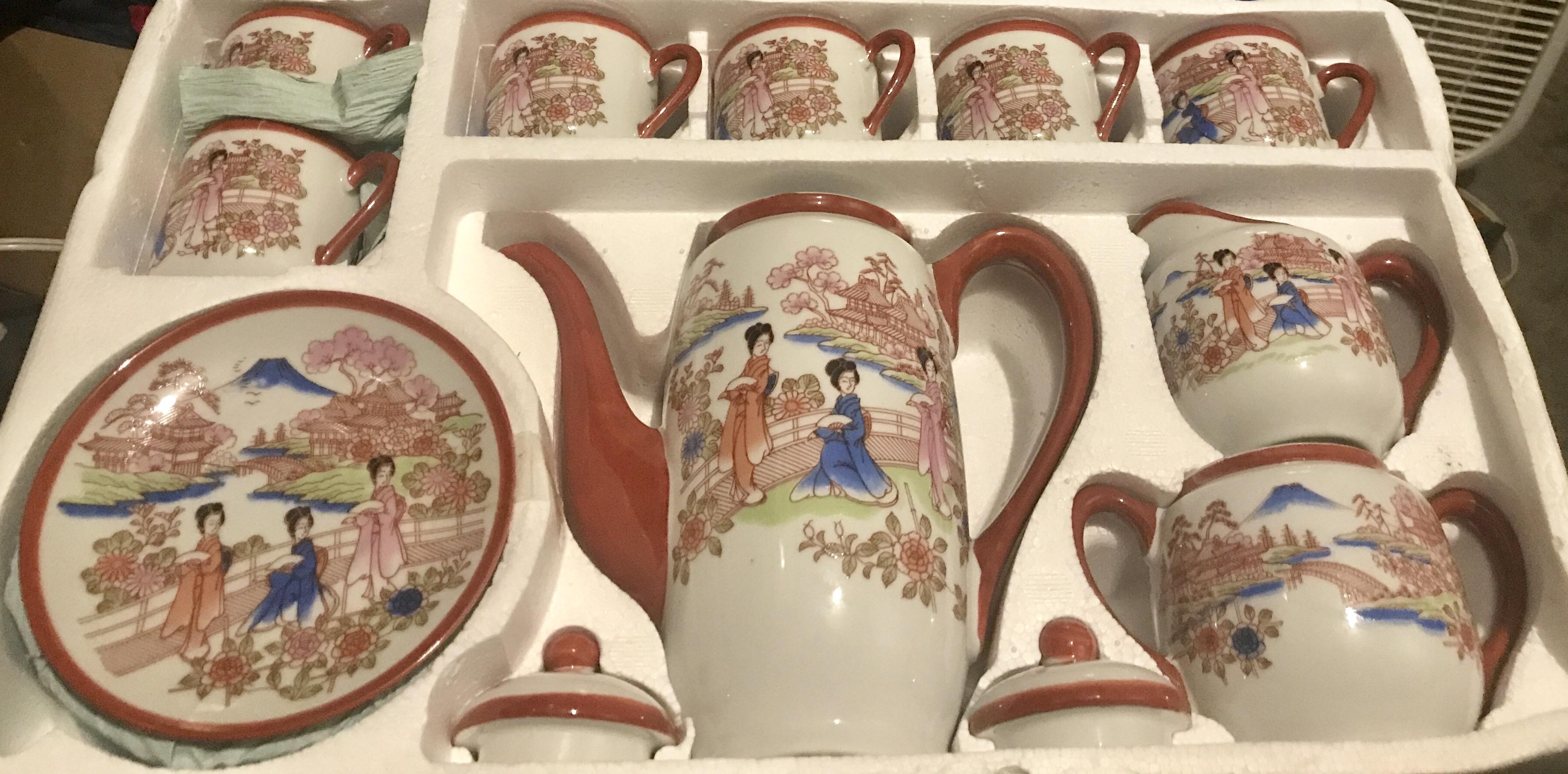 I came across this box at a house where the owner passed away. It says coffee set on the box & made in Japan on the bottom of each item. The set hasn't been used or handled there is still protective wrap in between each piece. On the inside of the cups is an outline woman's face.
