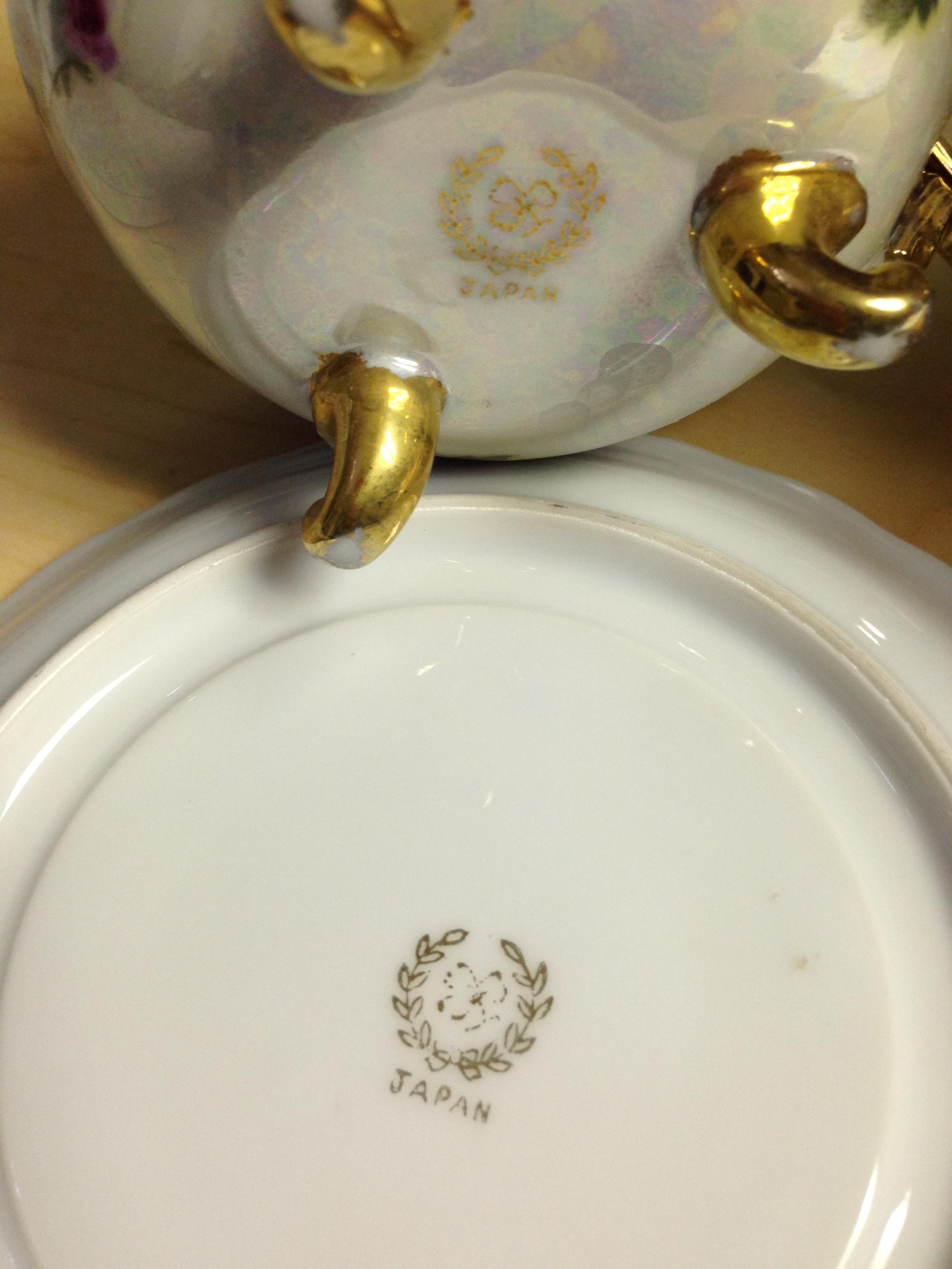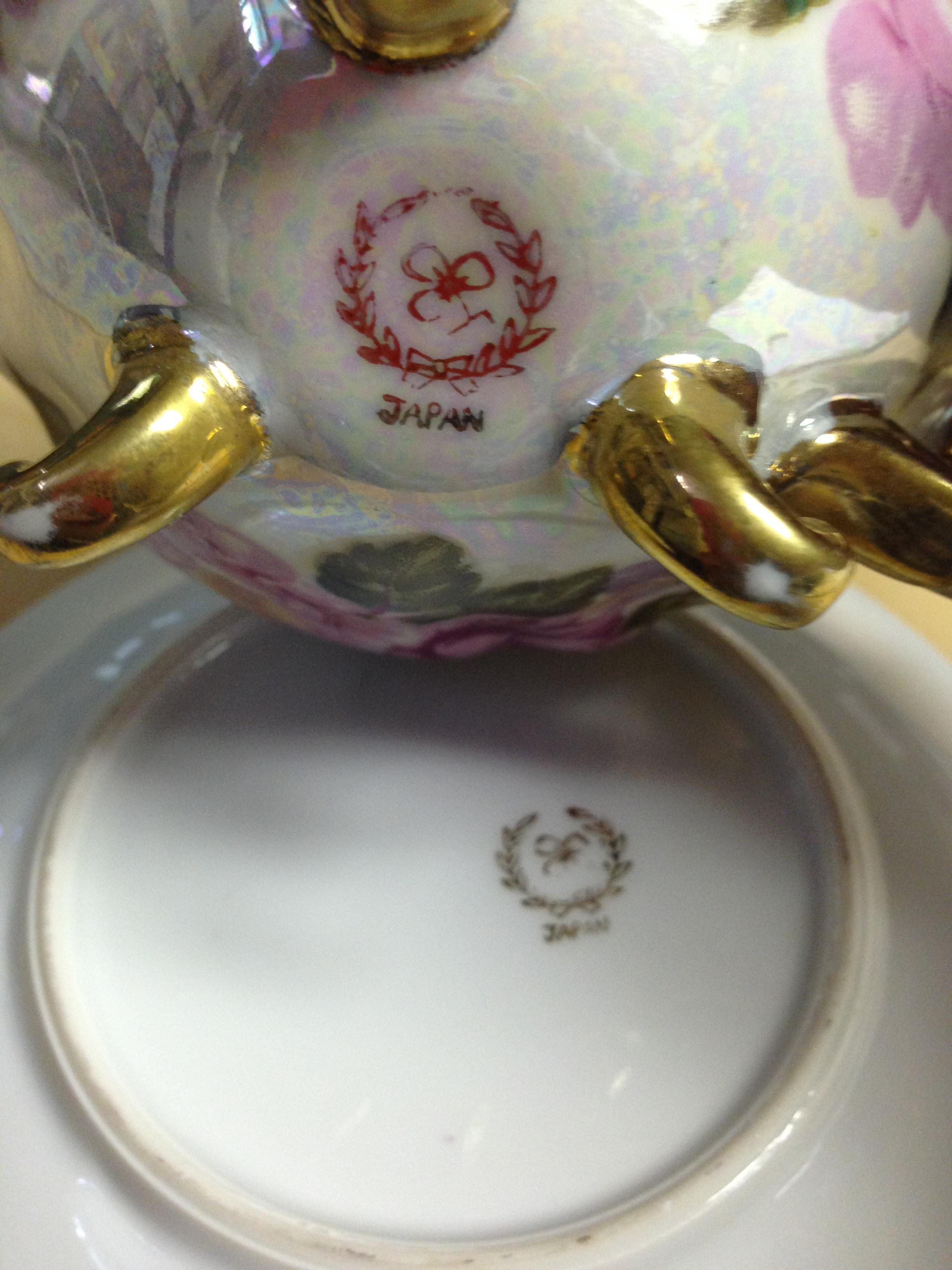 Two teacup and saucer sets with gold inside the teacups, stamped Japan and a small symbol. The cups have 3 gold legs on each and the handles on each are gold as well. they both have floral designs on the cups and saucers one is a pivk rose design and the other seems to be a pink/purple/yellow pansy type of flower design. I am curious if they are worth anything.