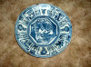 Japanese Arita Blue & White porcelain charger, 18th-19th century (?). 18" diameter, 2" high. Has been repaired with staples in the back. The interior is decorated with a landscape scene, the rim painted with a view of Mount Fuji, the landscape consisting of trees, rocks and lakes framed by supine dragons. The reverse is painted with Chinese characters reading "da ming Chenghua." piece