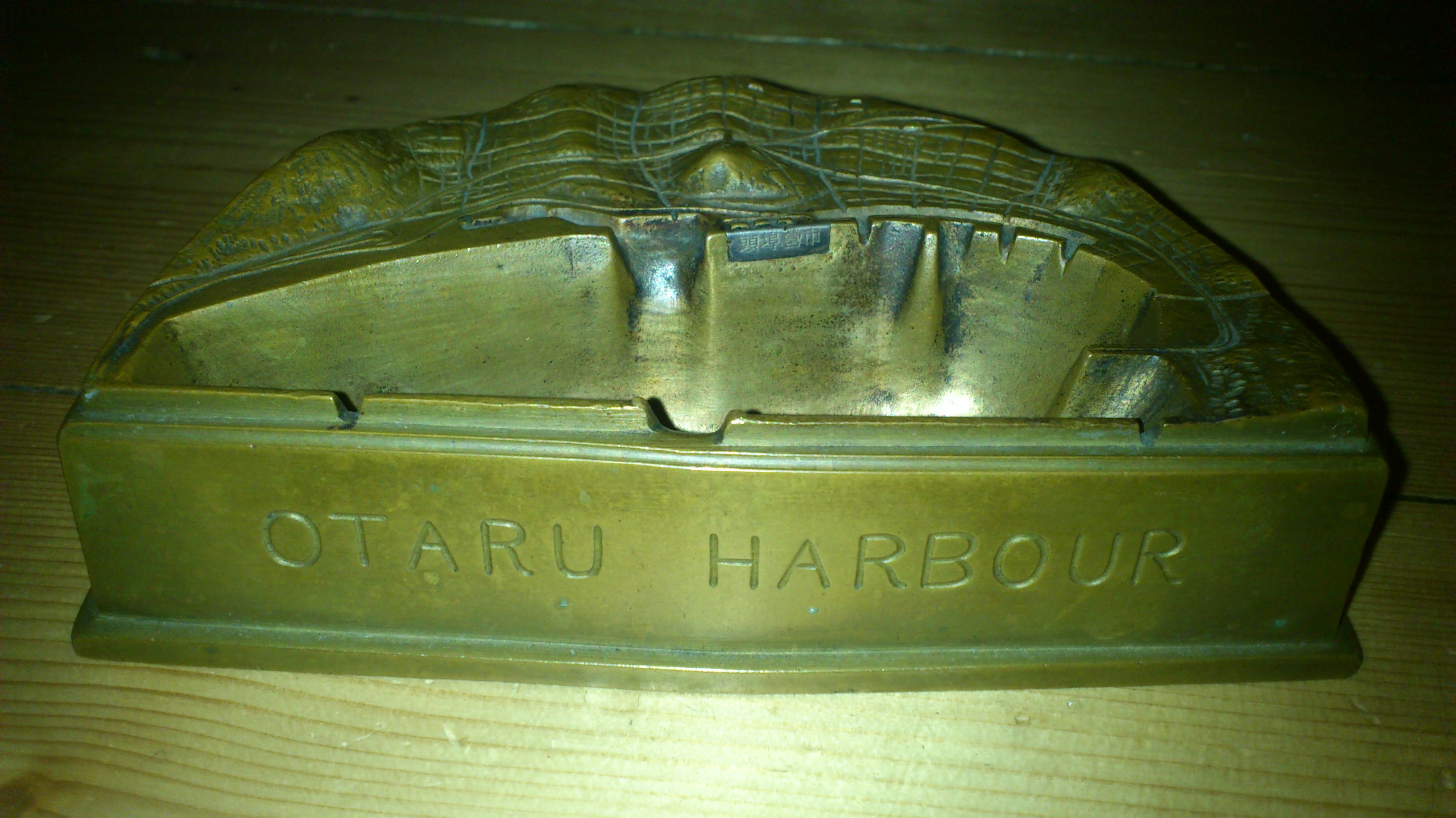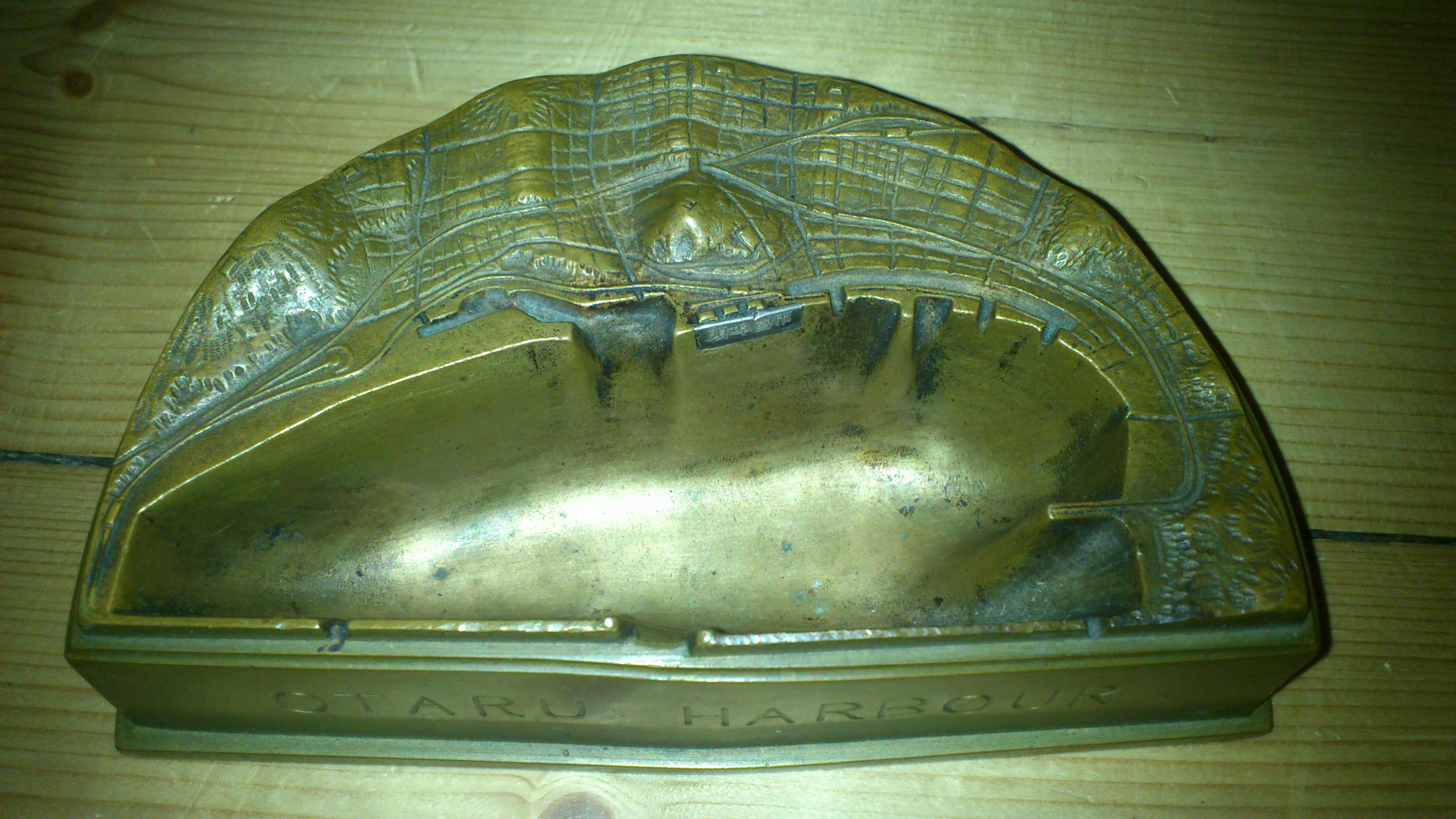 It appears to be an ashtray, it has certainly been used as one. It is a bronze representation of Otaru Harour (an aerial view) and is quite detailed. It has some makers marks underneath but I have no idea what the characters mean.