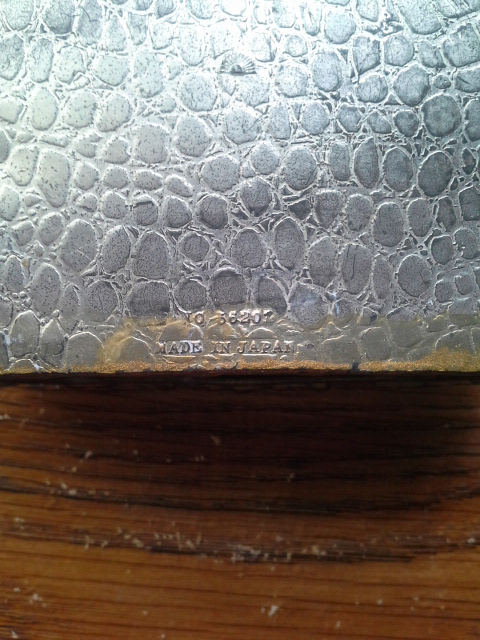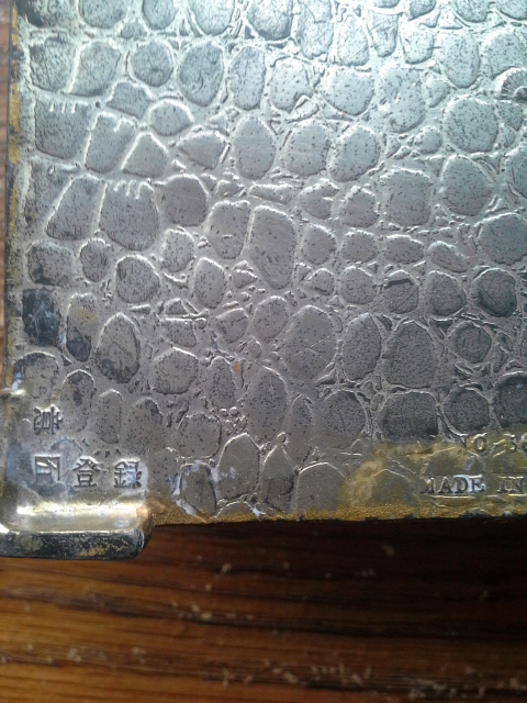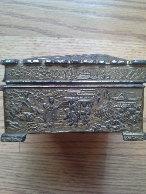 I found this at a gargae sale a few years back. It says Made in Japan on the bottom (photo) as well as a few other Japanese symbols (photo). Does anyone know what it says? It is inlaid with wood. It measures 4 in long, 2 inches high and 3 1/2 inches wide. It weighs about 12 ounces. The lid looks like it was attached at one time but it's been loose ever since I got it. Any ideas as to it's value if any?