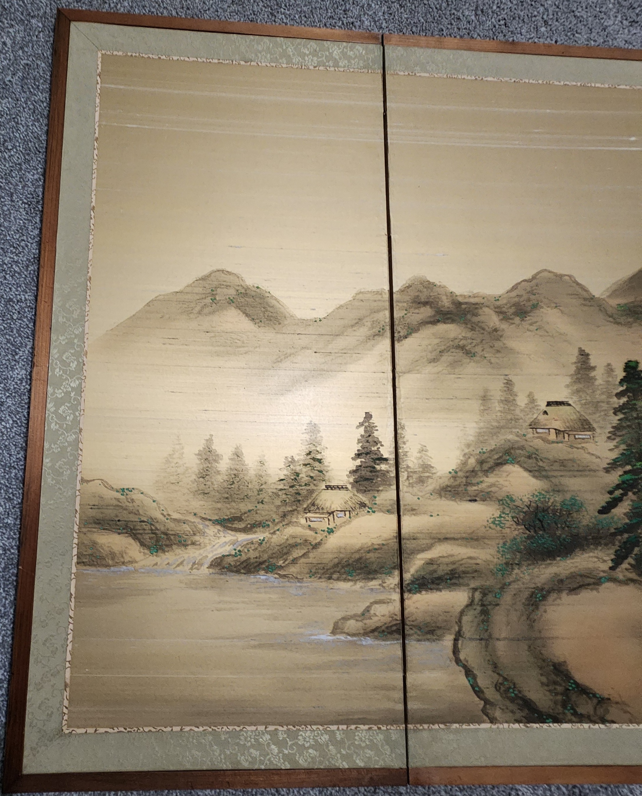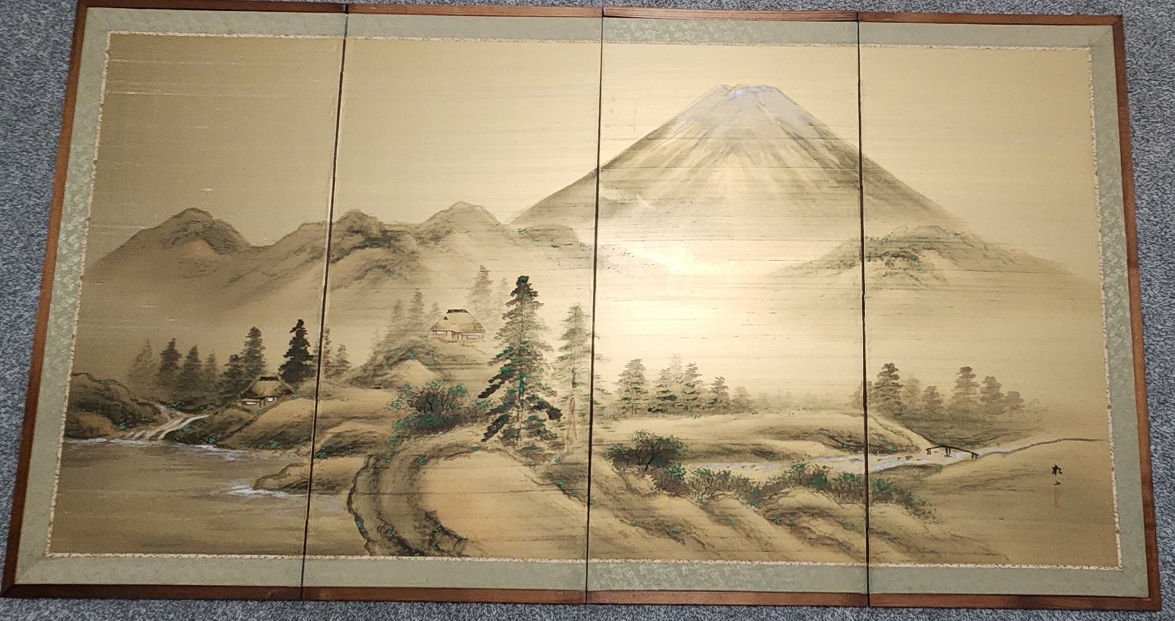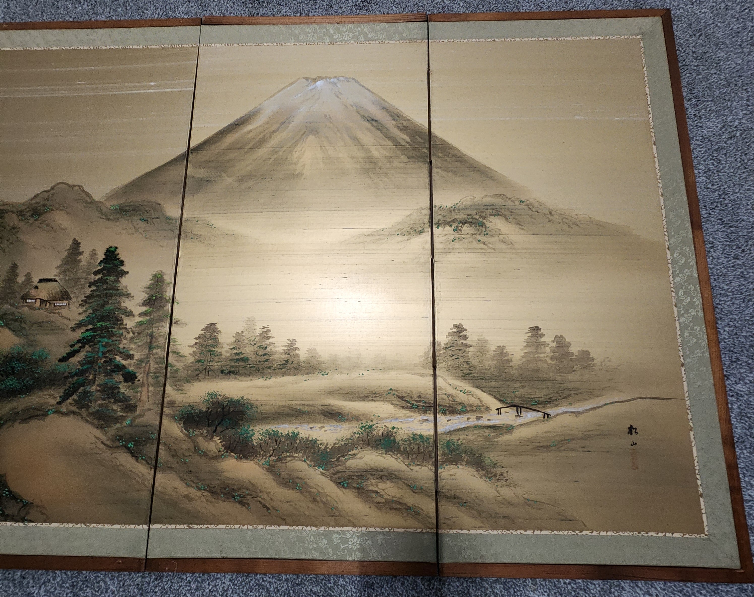 Physical Description: This Japanese koshi-byobu (folding screen) features a beautiful landscape scene, likely depicting Mount Fuji, with intricate details of trees, houses, and a river. The screen is composed of multiple panels, with a total width of approximately 147 cm and a height of about 94.5 cm. When folded, the width is approximately 37.5 cm and the thickness is around 8 cm. The materials appear to be wood and silk, with a gold-leaf background enhancing the visual appeal.