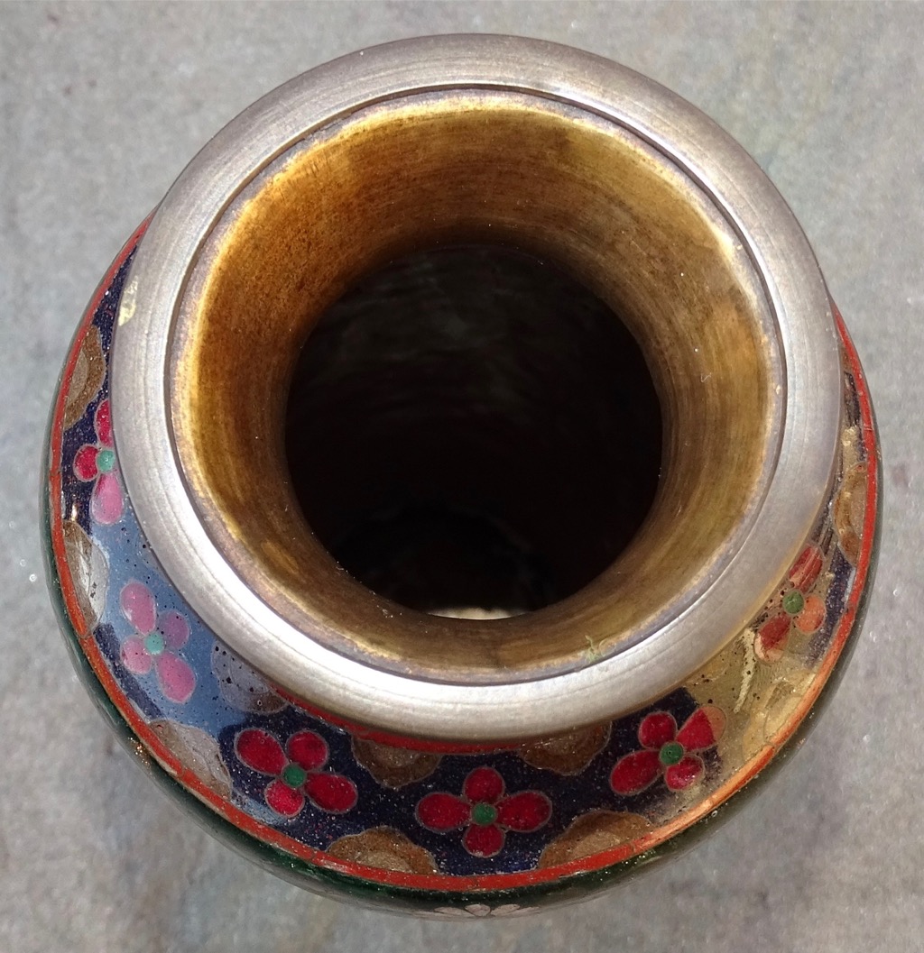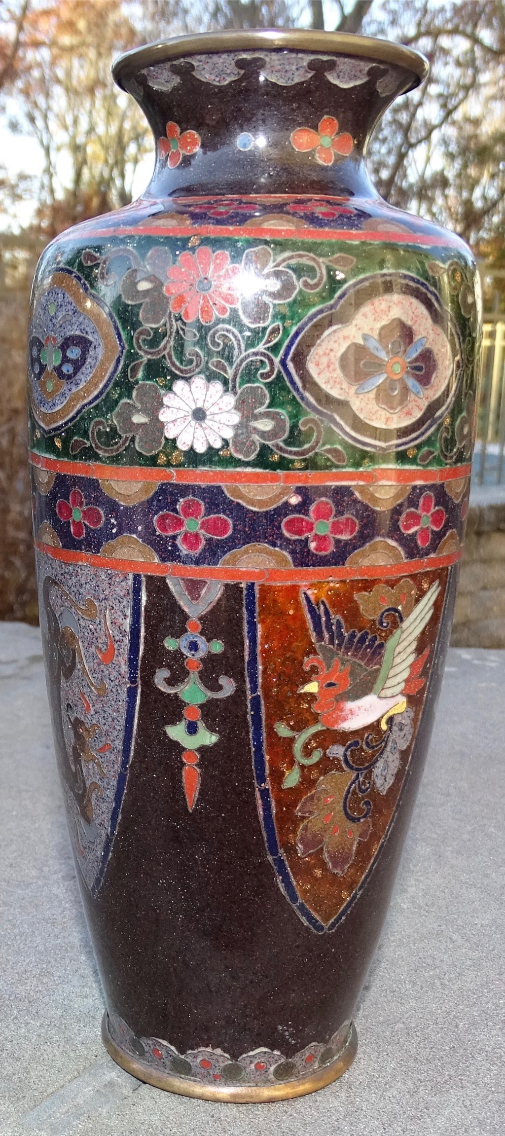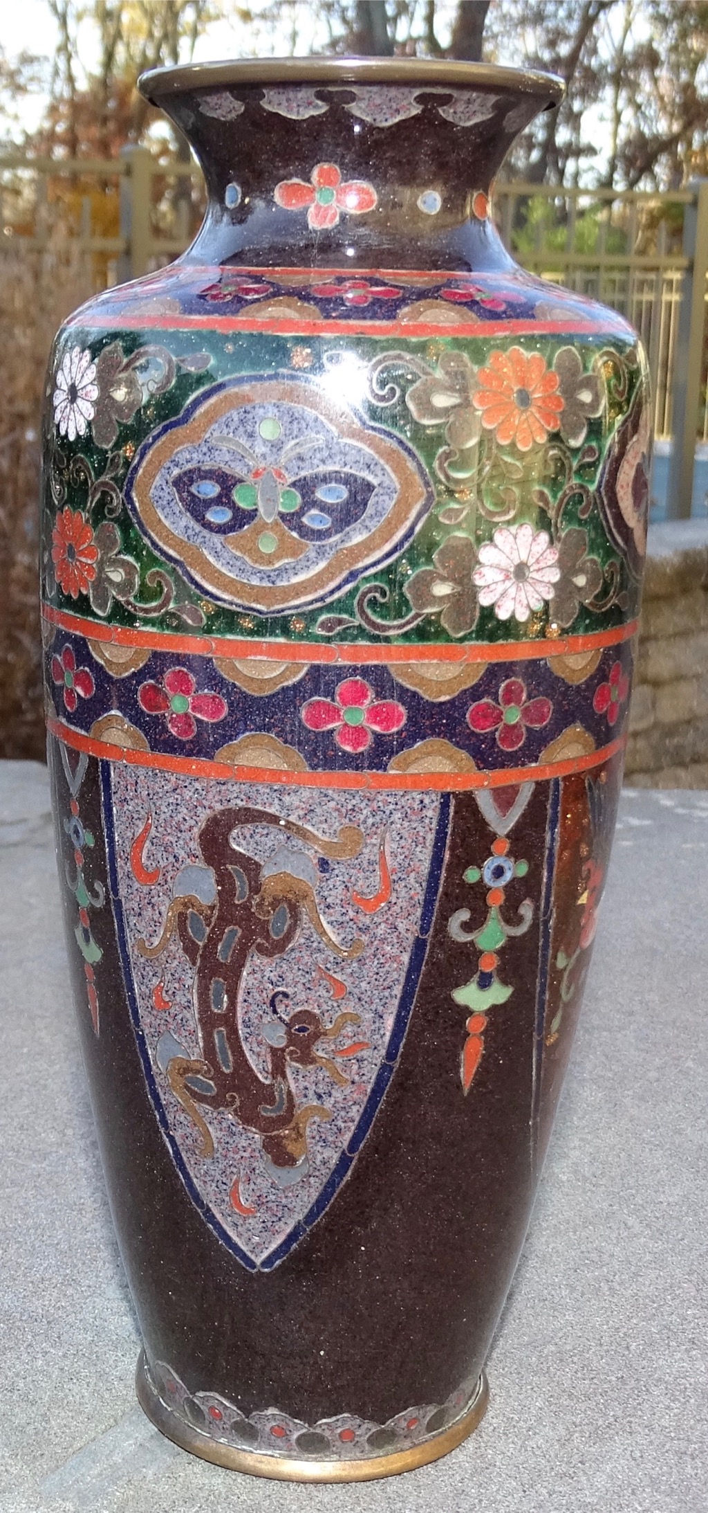 Black Cloisonne vase with sterling stamped on bottom. Various pictures of animals and copper specks that sparkle.