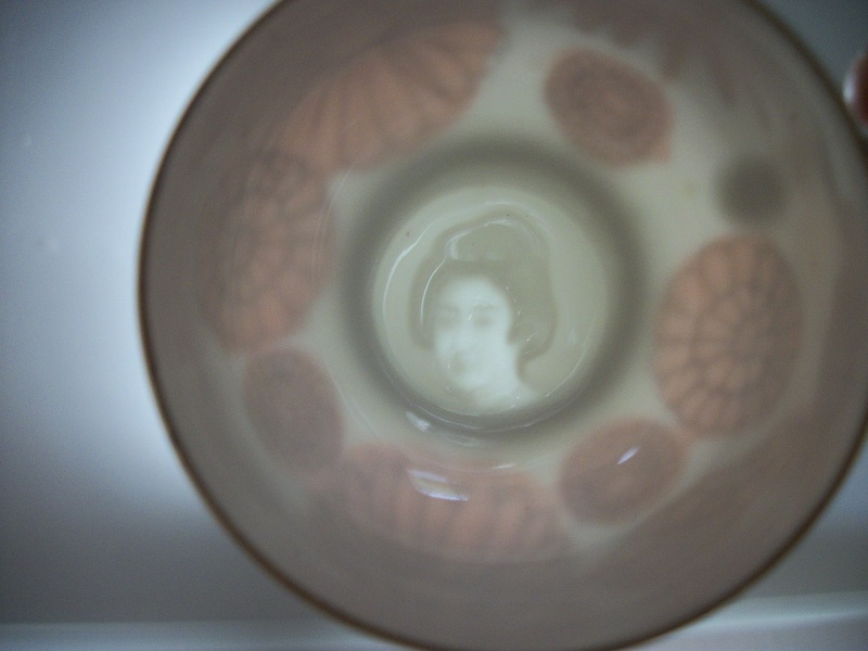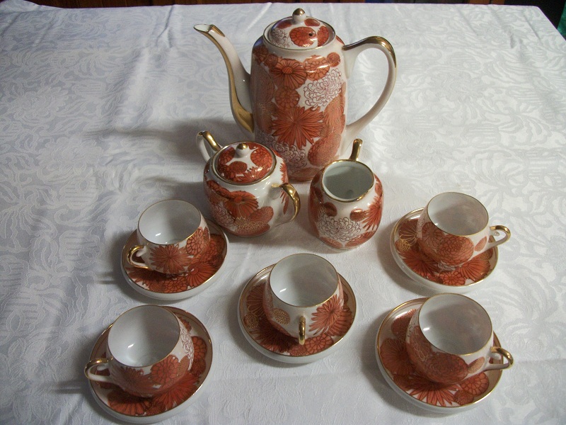 Delicate eggshell china service.  Handpainted, guilded flower designs. There is a raised geishas' face feature in the bottom of each cup.  Beautiful Service in excellent condition.