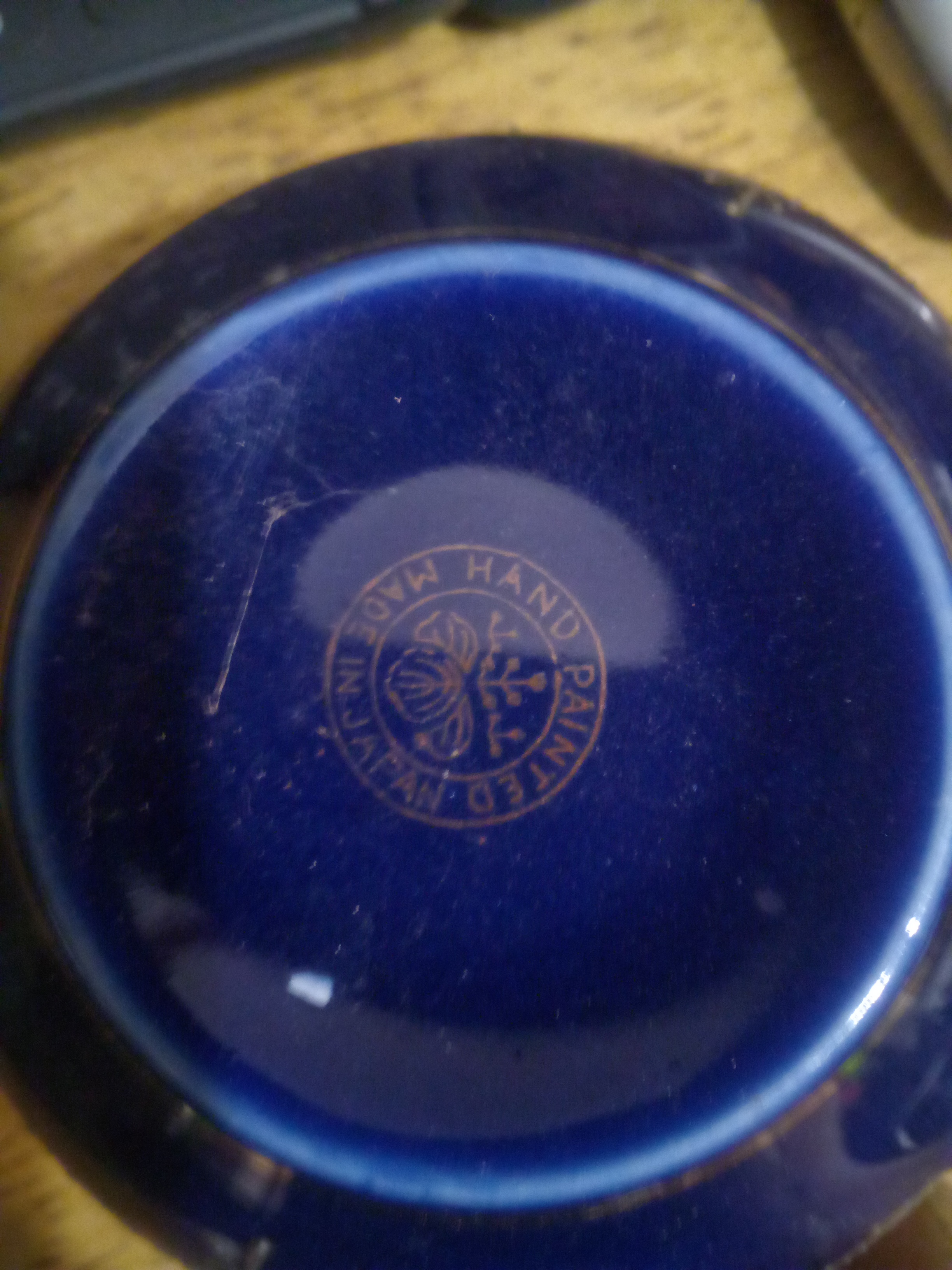 Physical Description: This Japanese cup is made of porcelain, featuring a rich cobalt blue glaze with intricate gold detailing. It stands at 2 inches tall and has a round diameter of 2 inches. The cup is adorned with a decorative pattern that includes floral motifs, likely hand-painted. The base bears a mark indicating it was hand-painted in Japan, which adds to its authenticity and appeal.
