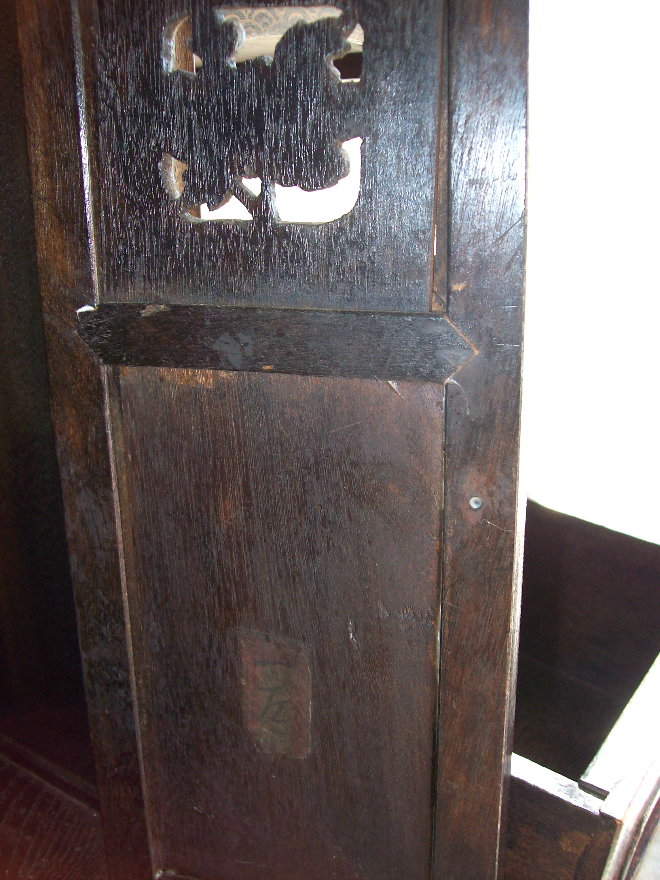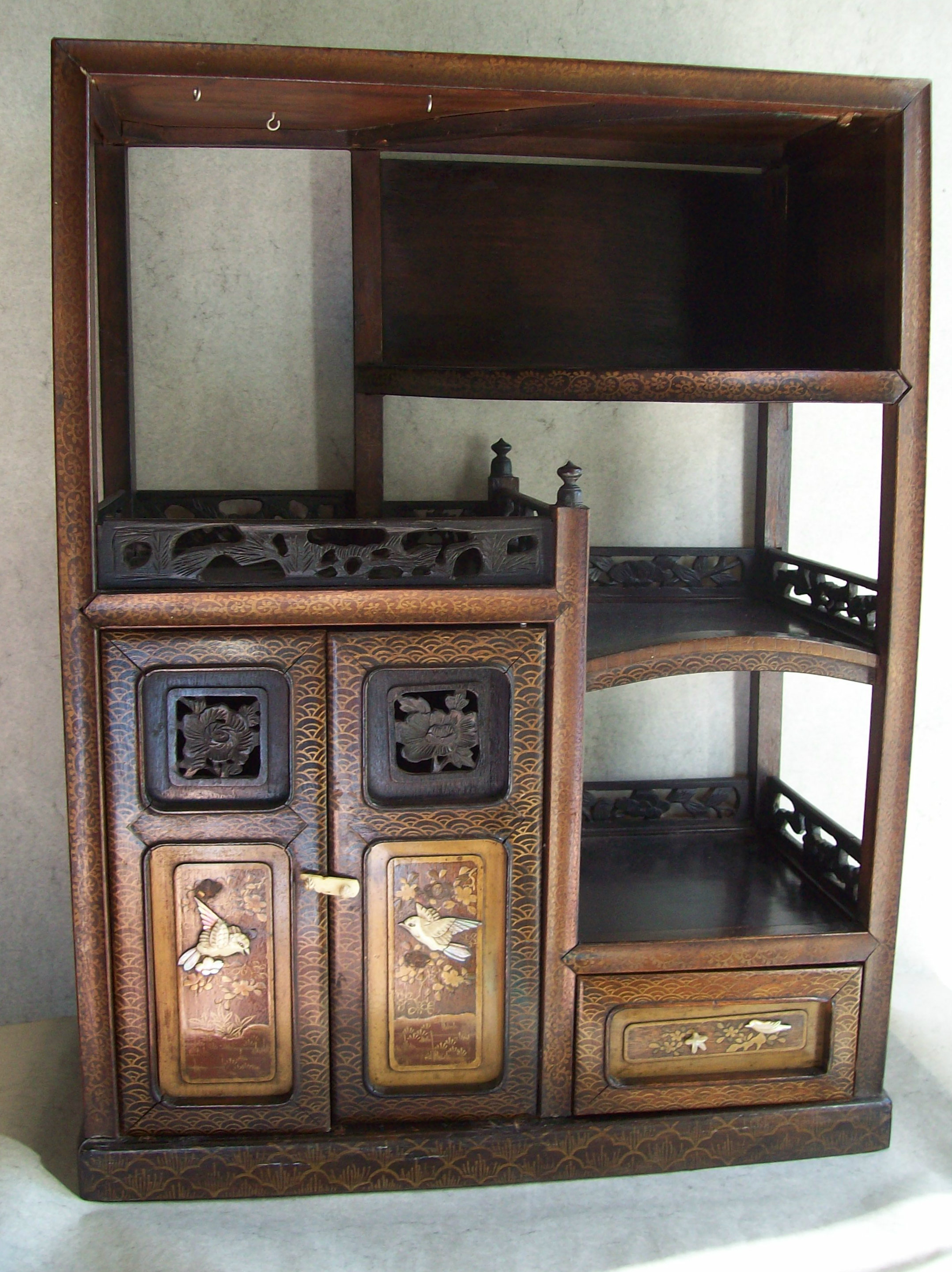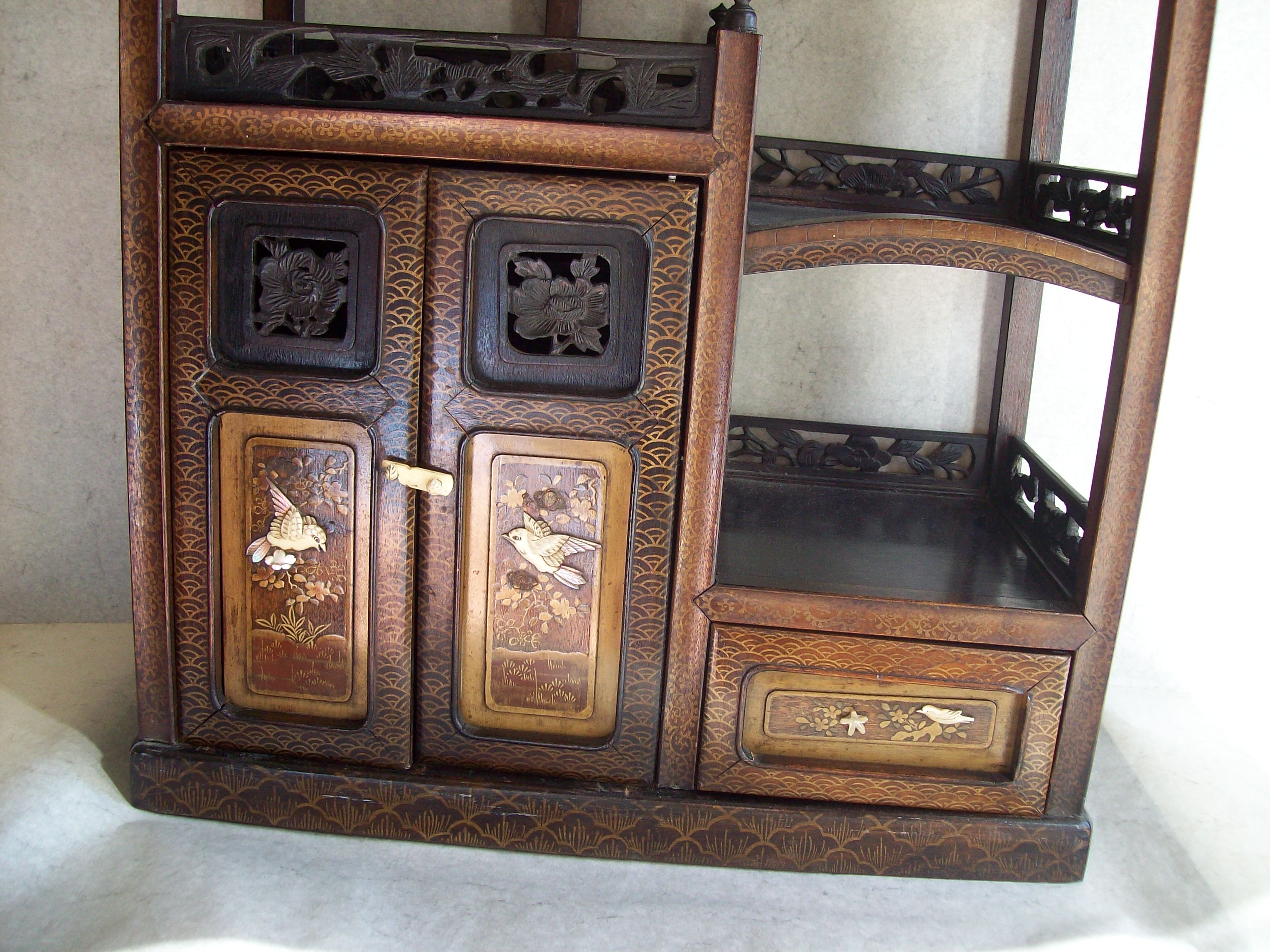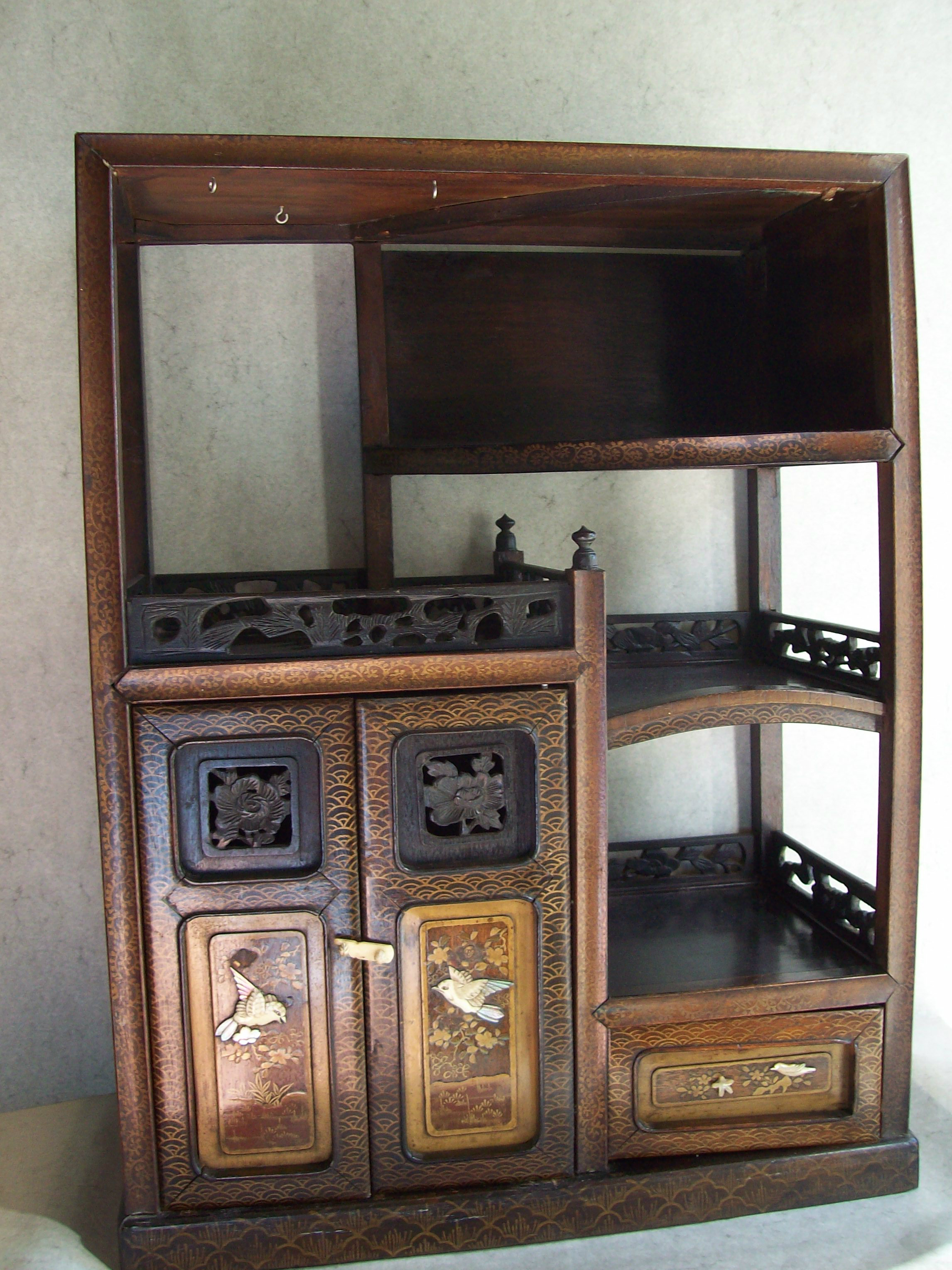 Japanese Gilt Hardwood Cabinet. The alternating shelves and compartments with aprons and spandrels carved in openwork with leafy floral decorations, the hinged compartment doors and drawers idecorated with carved mother-of-pearl to depict scenes of birds and flowers within gilt-painted landscapes, each surrounded by gilt-painted stenciled pattern borders. The uppermost open compartment has a series of metal wire hooks (possibly for prayer beads??) The hinged doors have had the original wood hinge replaced with temporary metal pins on the left door. The entire cabinet is fit together rather loosely mostly without nails. The panels slide and the one on the top right back behind the curved shelf has slipped down to show daylight at the top. This may be due to age related shrinkage of the wood possibly? The inside of each hinged door has an old varnish-covered paper label with hand inked Japanese or Chinese characters (need translation). Likely Meiji Period.
