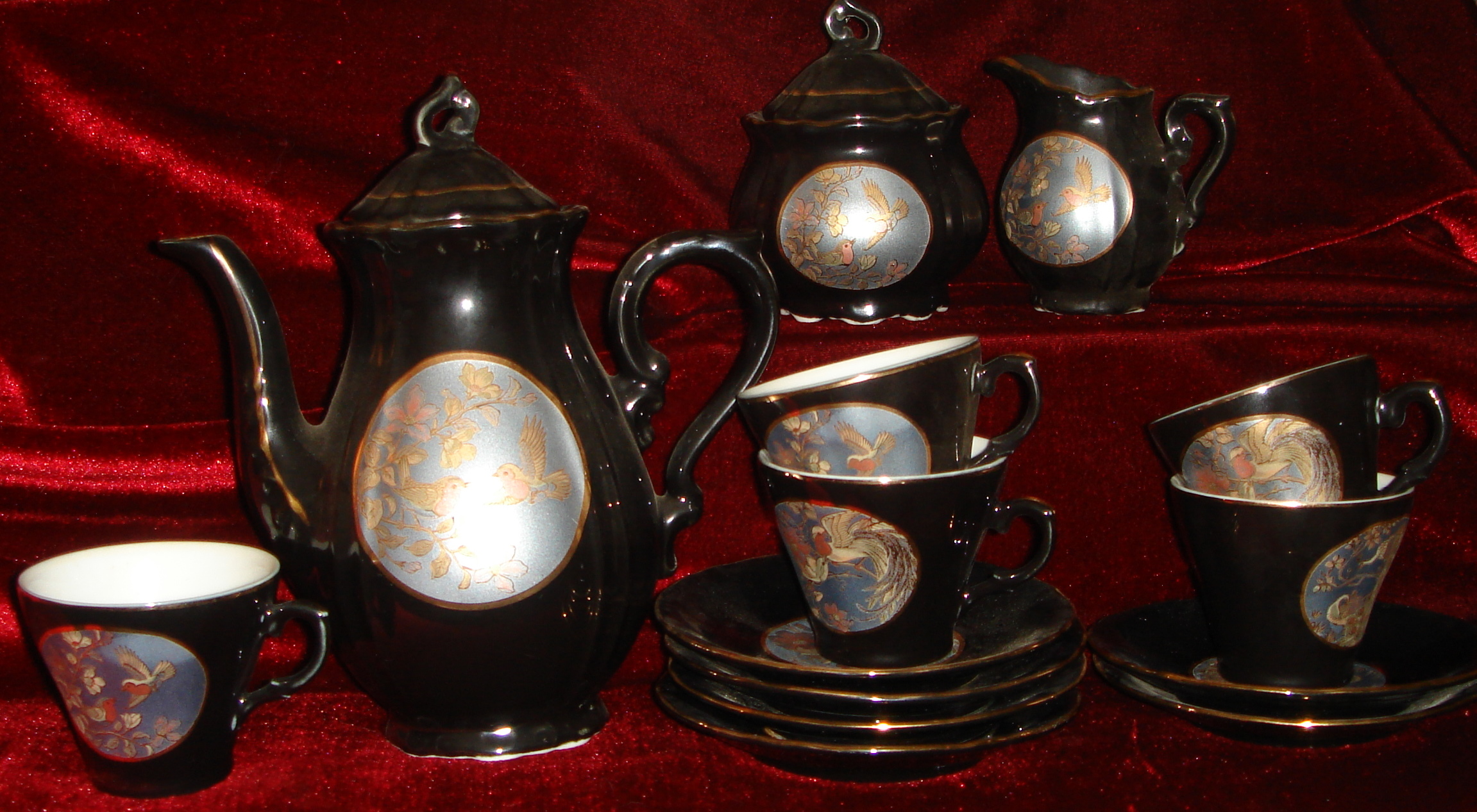 Coffee pot, sugar pot, creamer, 6 saucers and 5 cups. Silver metalic pictures of different birds.
