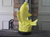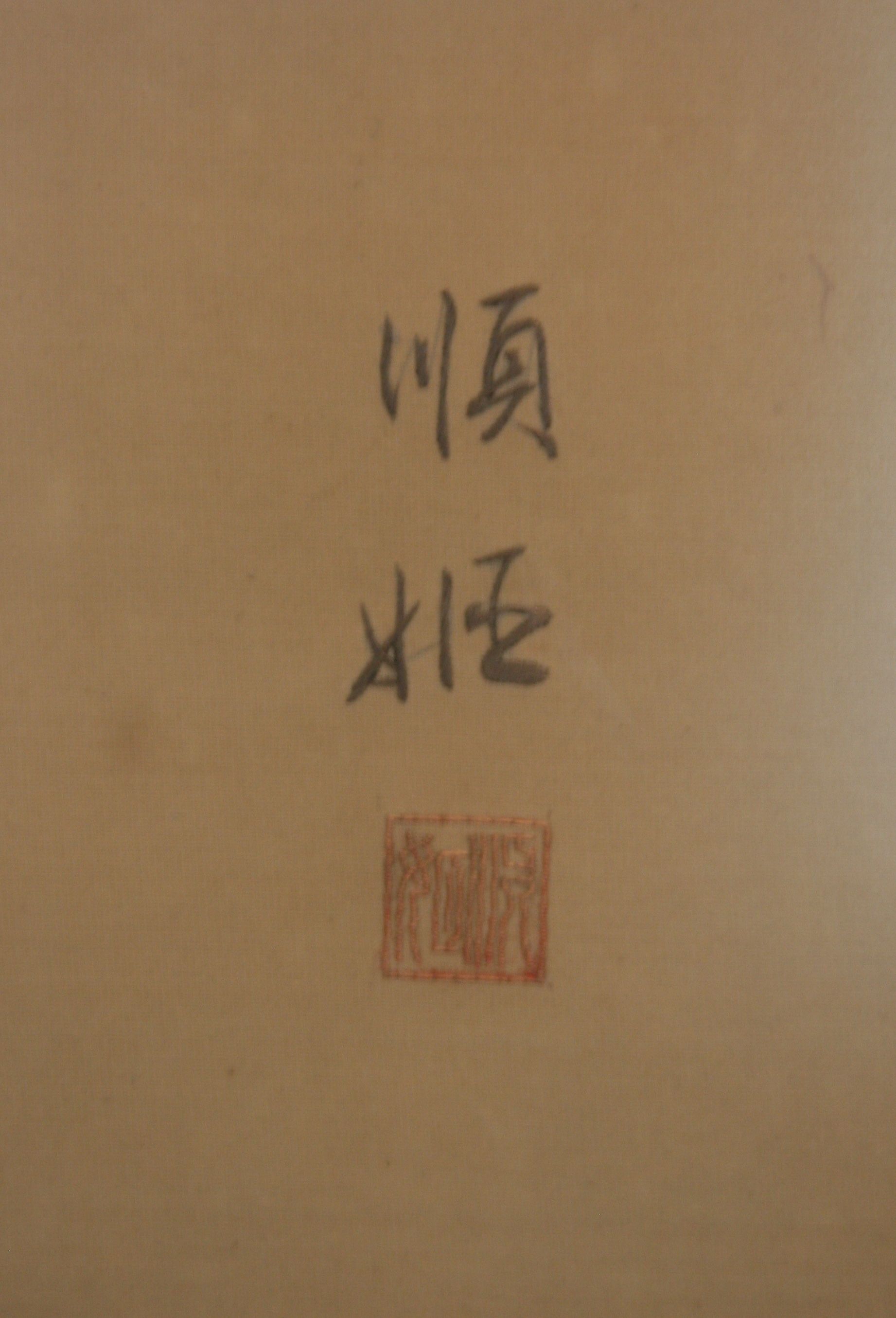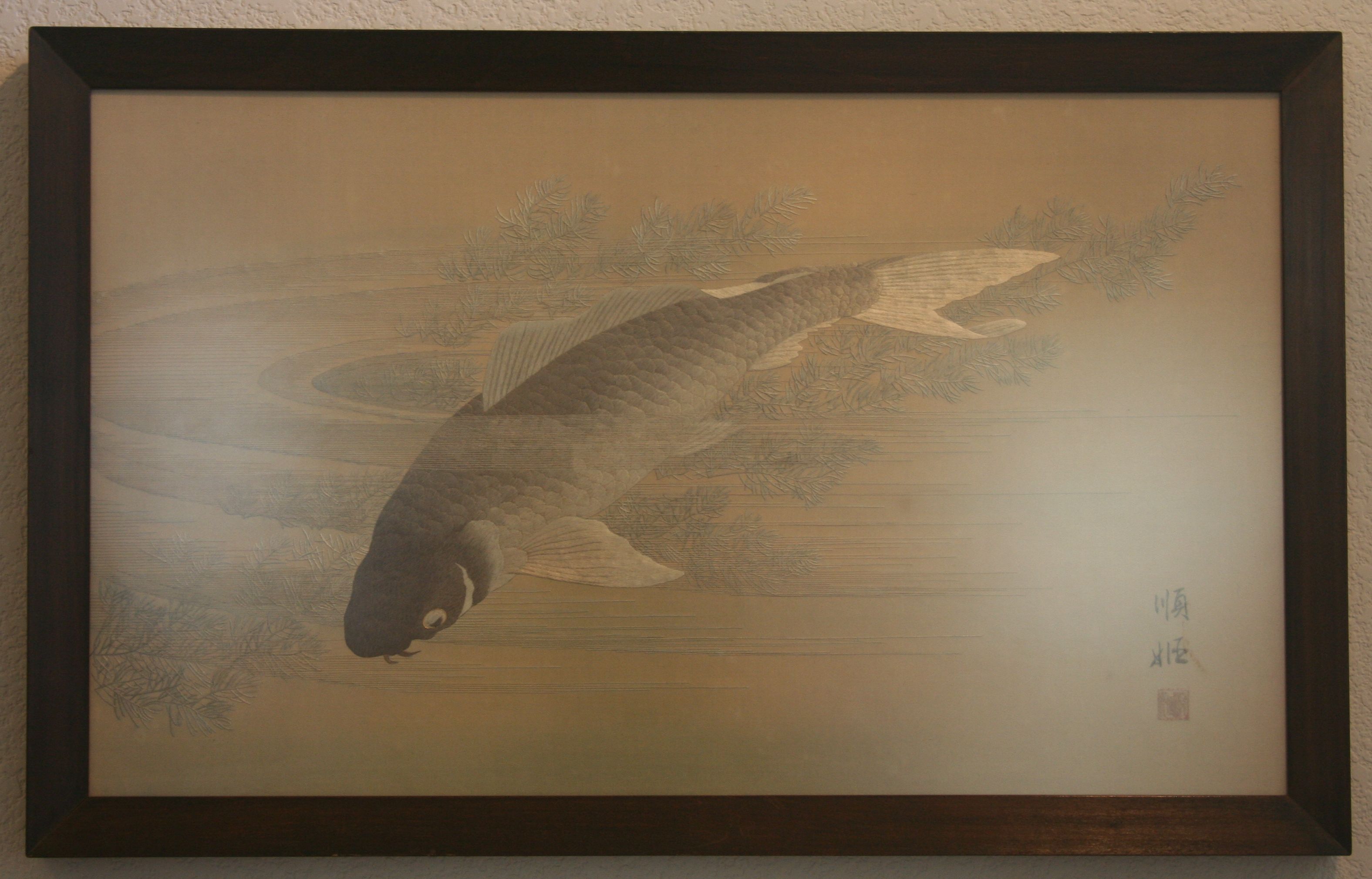 Finely embroidered Japanese Carp half immersed in pond, subtle shades of sage-green, silver and gray-brown, 14" x 24", brown wooden frame, under glass. Presumed to be silk.