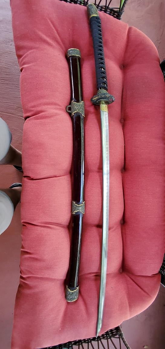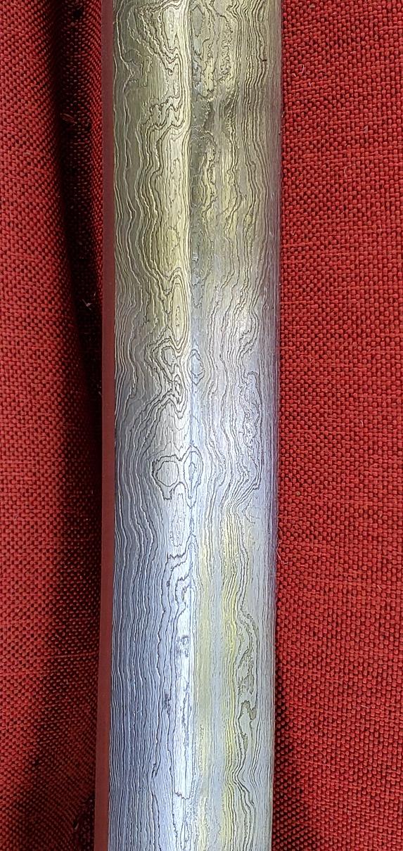 42'' Japanese Gunto probably from 19th century. Signature under the Tsuka. Full tang with one bamboo peg. Visible beautiful damascus pattern.