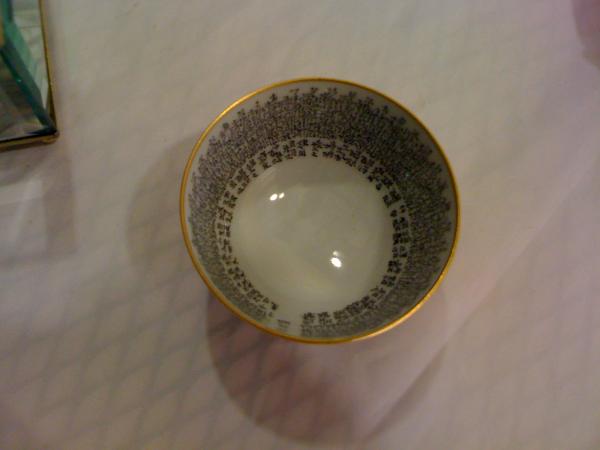 This bowl features hand painted japanese figures around the outside circumference of the bowl, each with a unique expression and apparel. The bowl has a gold tipped rim, and has intracately hand-written japanese wording surrounding the inside circumference of the bowl. It has a japanese identifier on the bottom of the bowl.