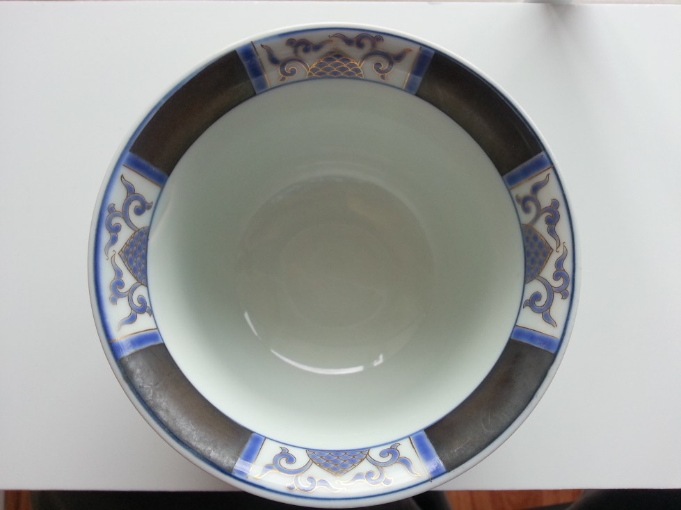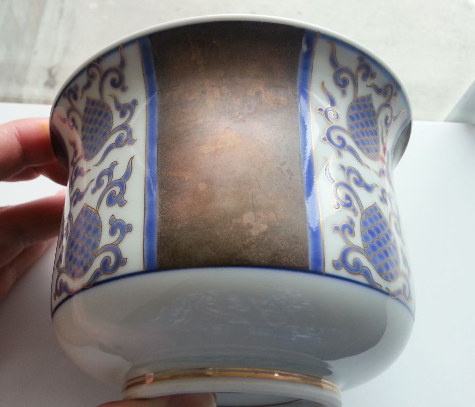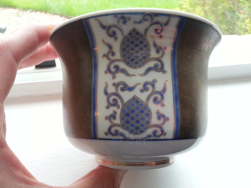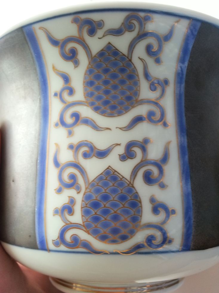 -Blue underglaze with gold gilt outlines, handpainted.