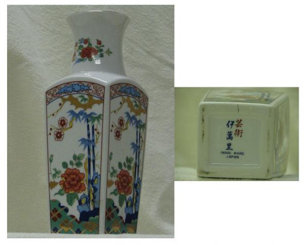 The vase is a clear blue-white, square in shape, tapering wider toward the top, ending in a curved arch. The Neck tapers gracefully to a circular lip. The sides are covered with Japanese stylized paintings of bamboo and blossoms in greens, blues and red-browns. The signatures on the bottom are clearly visible in black and red.