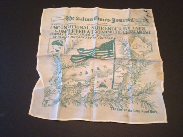 (1) silk scarf with silkscreen of The Selma Times Journal headline: Unconditional Surrender by Japs Completed at 20-minute Ceremony