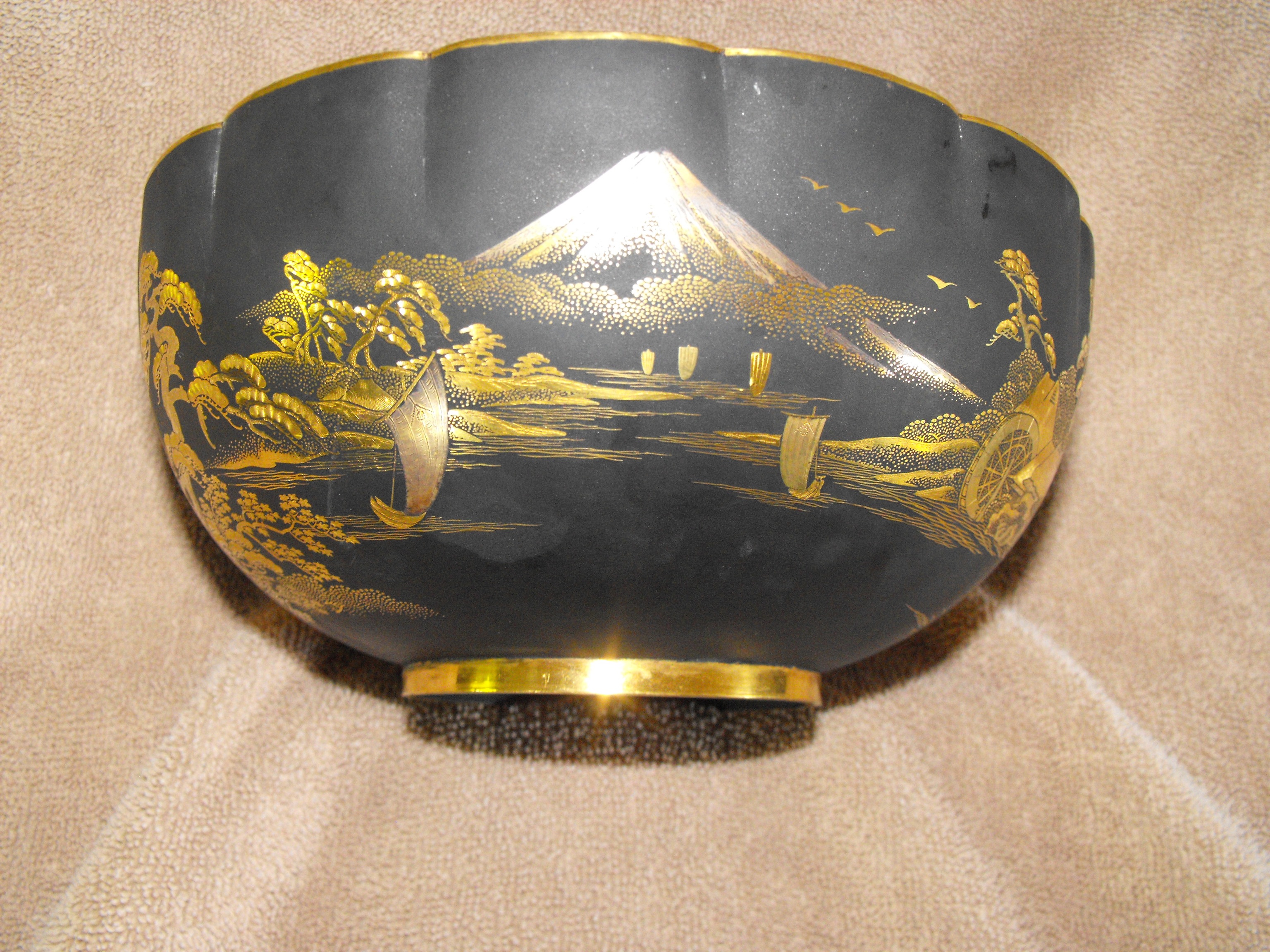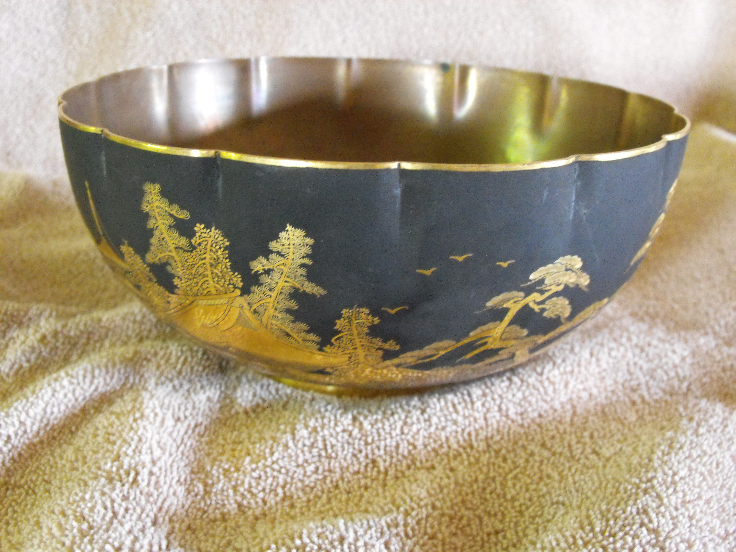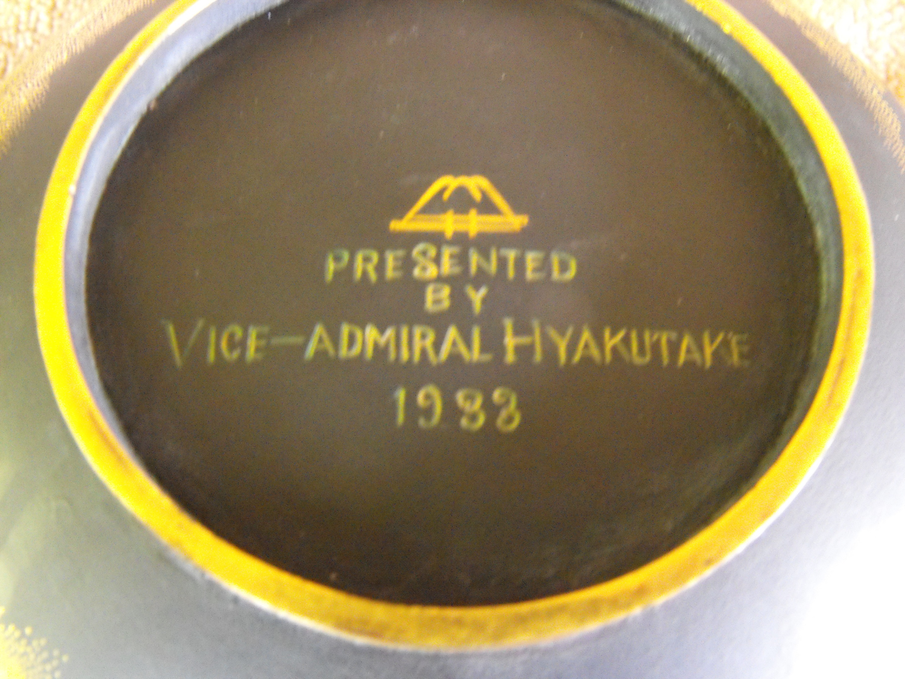 A japanese bowl decorated with various scenic motifs, the bottom is enscribed " Presented by Vice Admiral Hyakutake 1933". The bowl measures 3 1/4 inches high, 7 1/4 inches wide and the depth is 3 inches.  I cannot tell if the metal is gold, bronze or copper.  A magnet is not attracted. Gengo Hyakutake was a career officer in the Imperial Japanese Navy and this bowl was presented to the governor of California.  It has been in the family for 80 years.  I do not know if the age of the bowl is consistant with the enscribed date on the bottom or not. I also cannot determine if the symbol that looks like a mountain on back is a makers' mark.