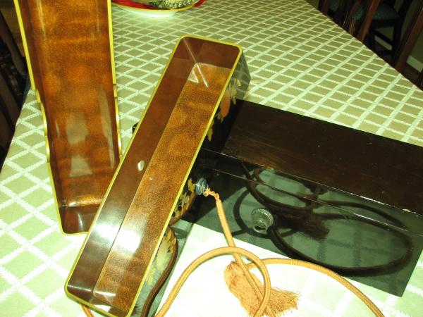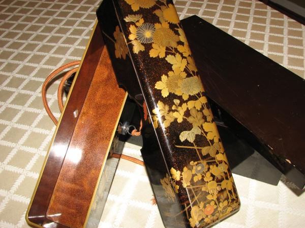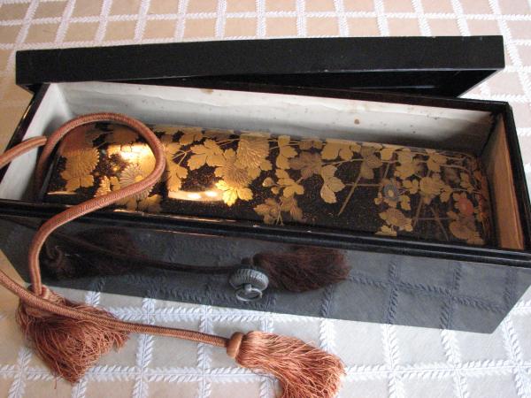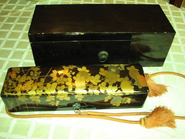 main box very good condition some cracking in gold leaf but all gold intact, inside has much gold dust in lacquer. large outer box good shape some small chips and ware show