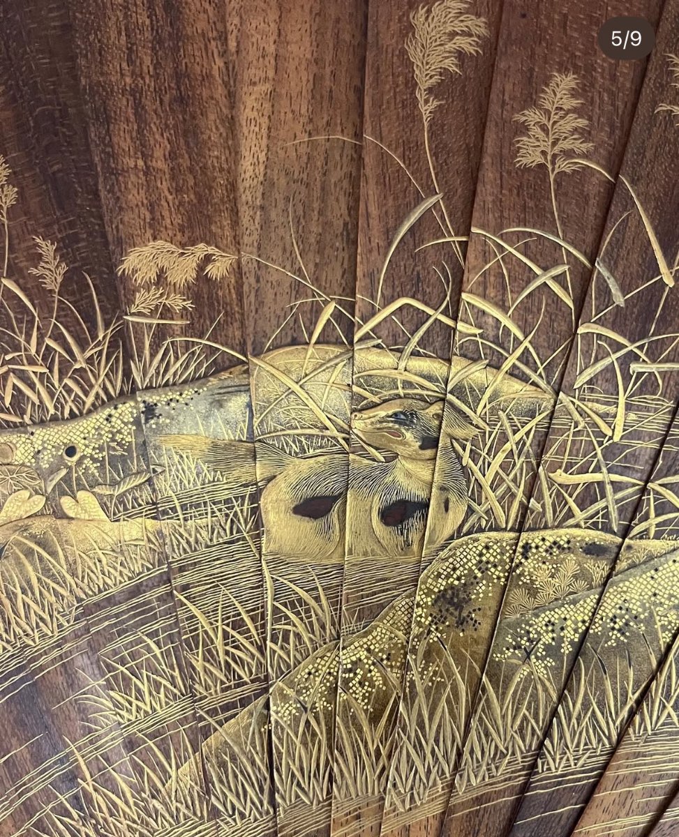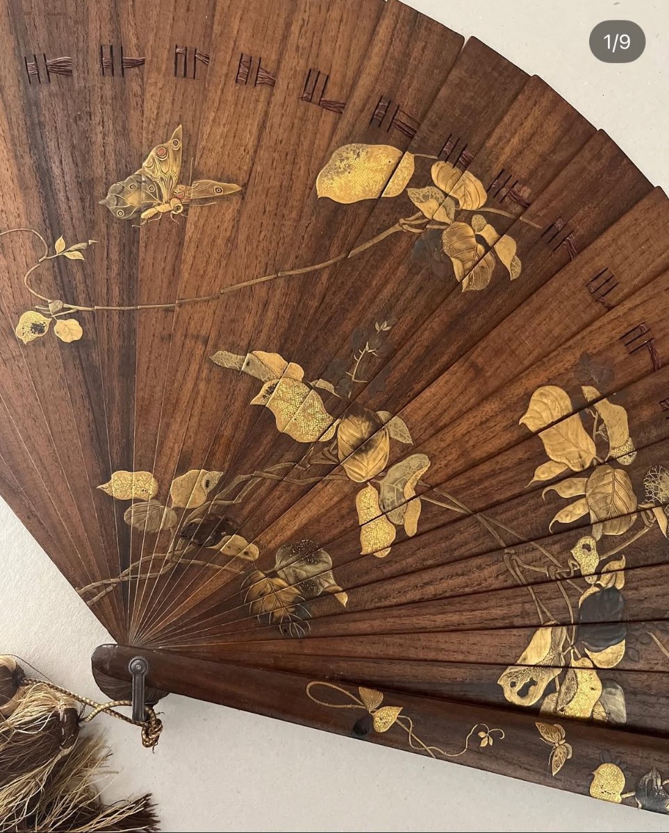 The market for Japanese lacquerware is currently stable, with a growing interest among collectors. Items from the Edo and Meiji periods are particularly sought after. This fan could be sold at auction houses specializing in Asian antiques or through online platforms dedicated to collectibles.