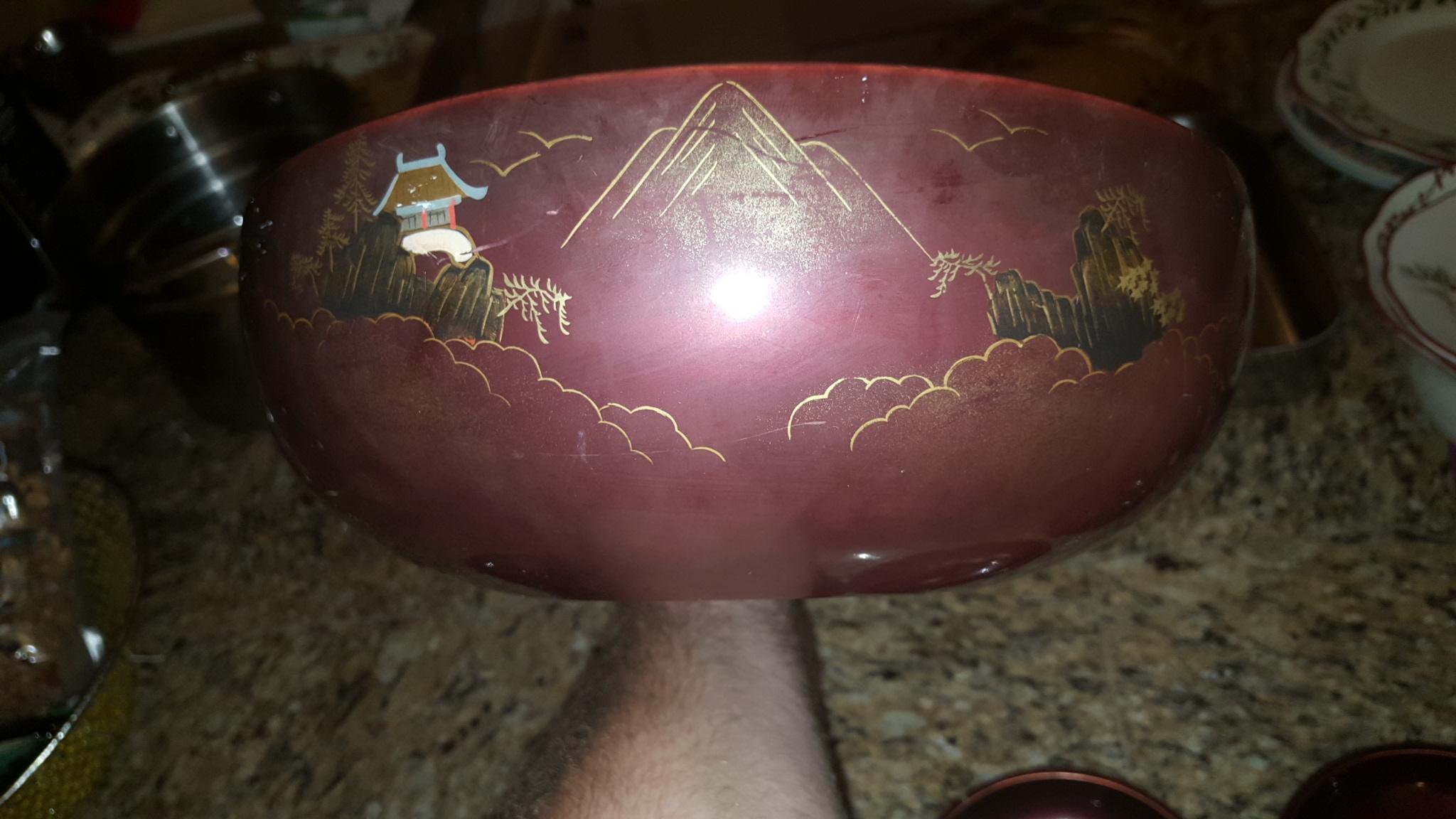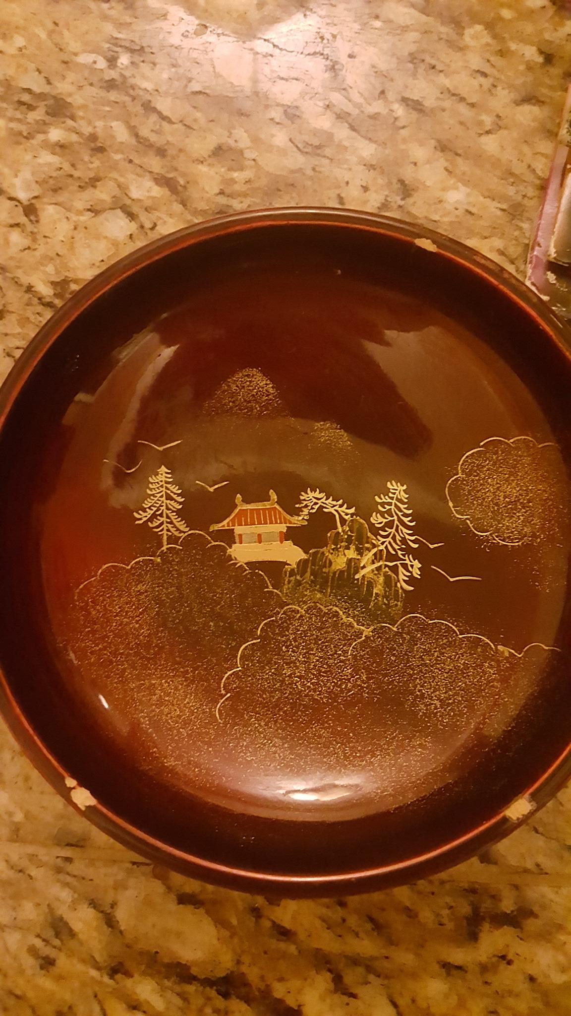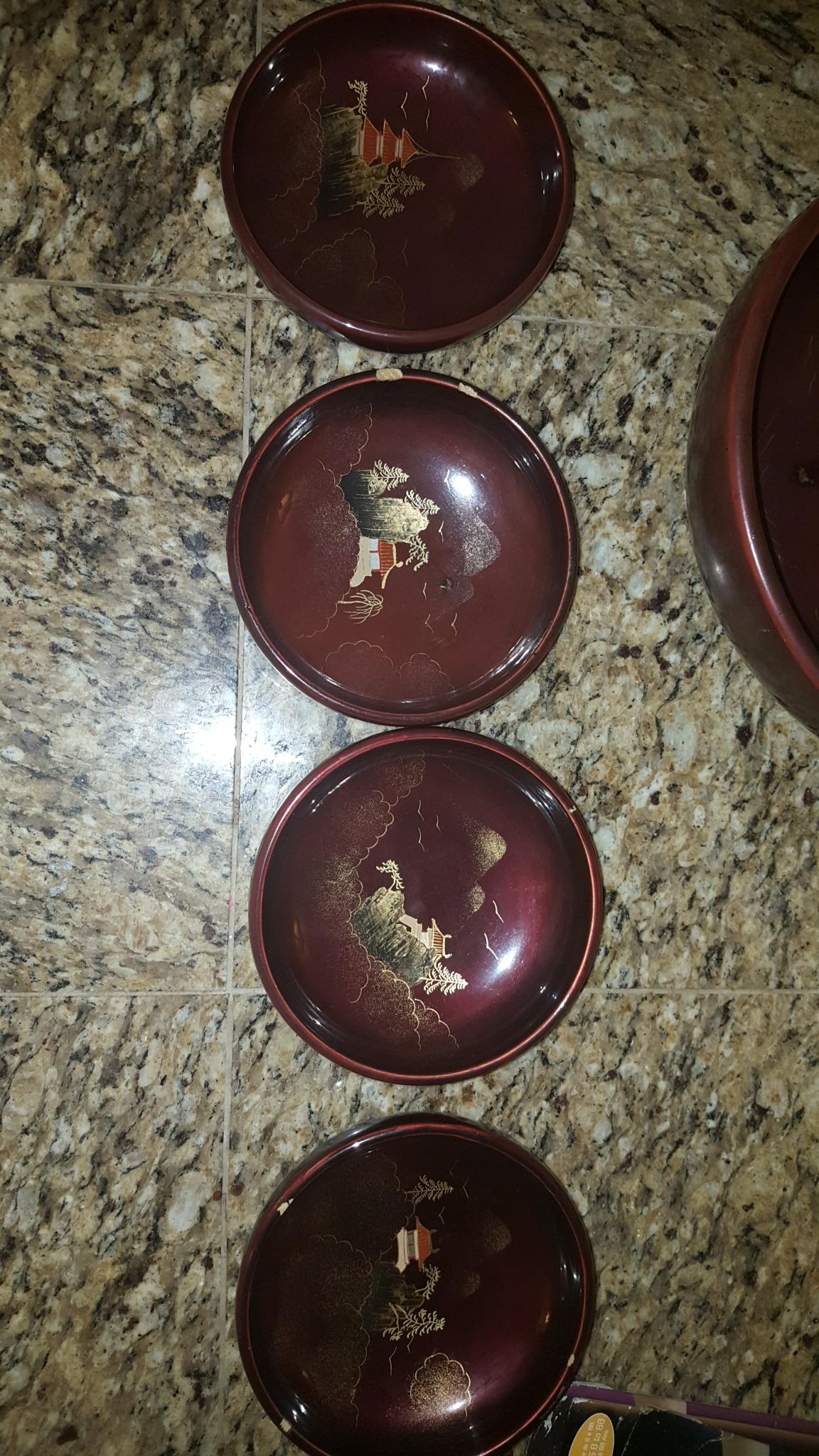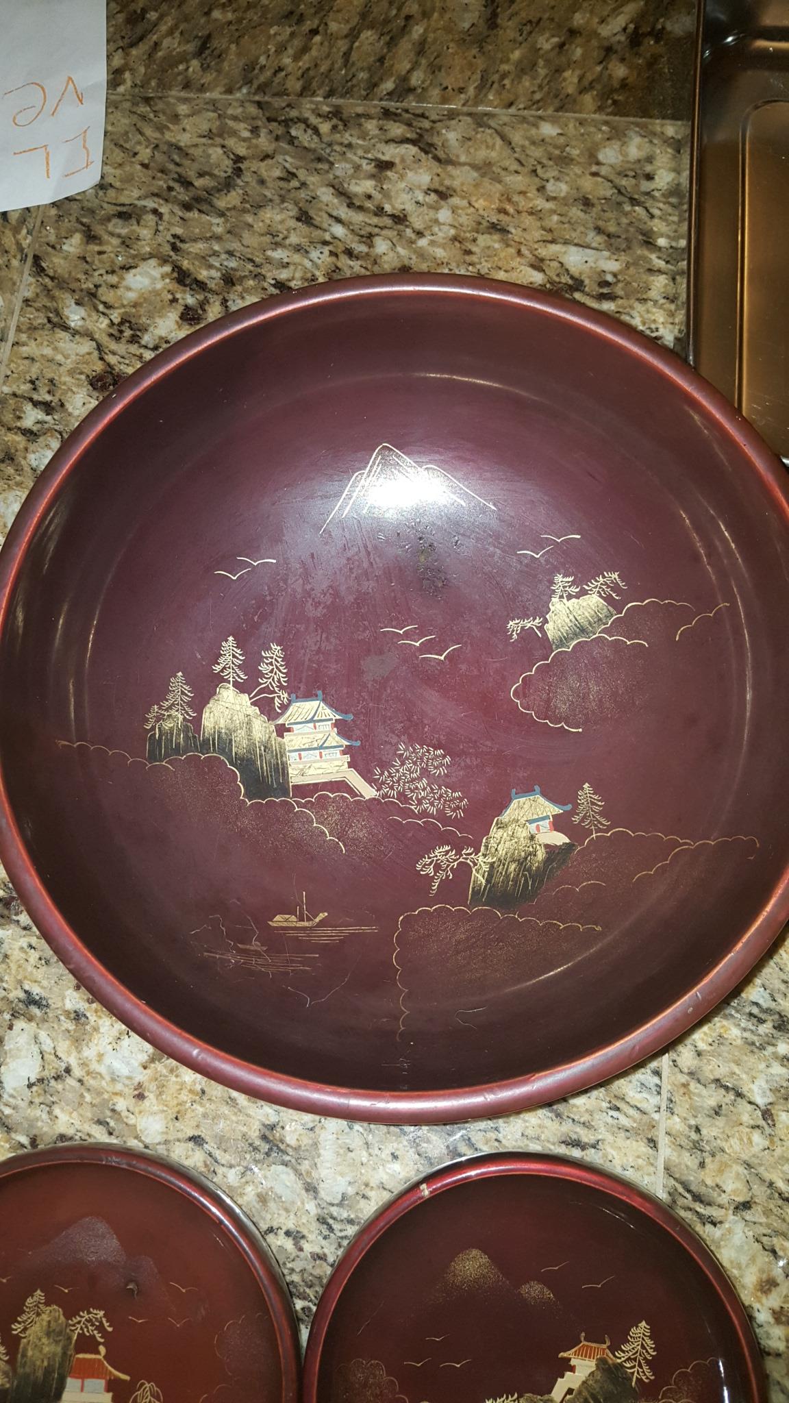 I acquired this 5-piece set of Japanese lacquerware through a job contract. I don't know if this set is complete but they do say "Made In Japan" and "NY" on the bottom of each. Maroon in color with oriental artwork in mainly gold and black. A few chips on top edge of small bowls but all artwork is perfectly visible. I know almost nothing about these and their value varies greatly so any help is much appreciated.