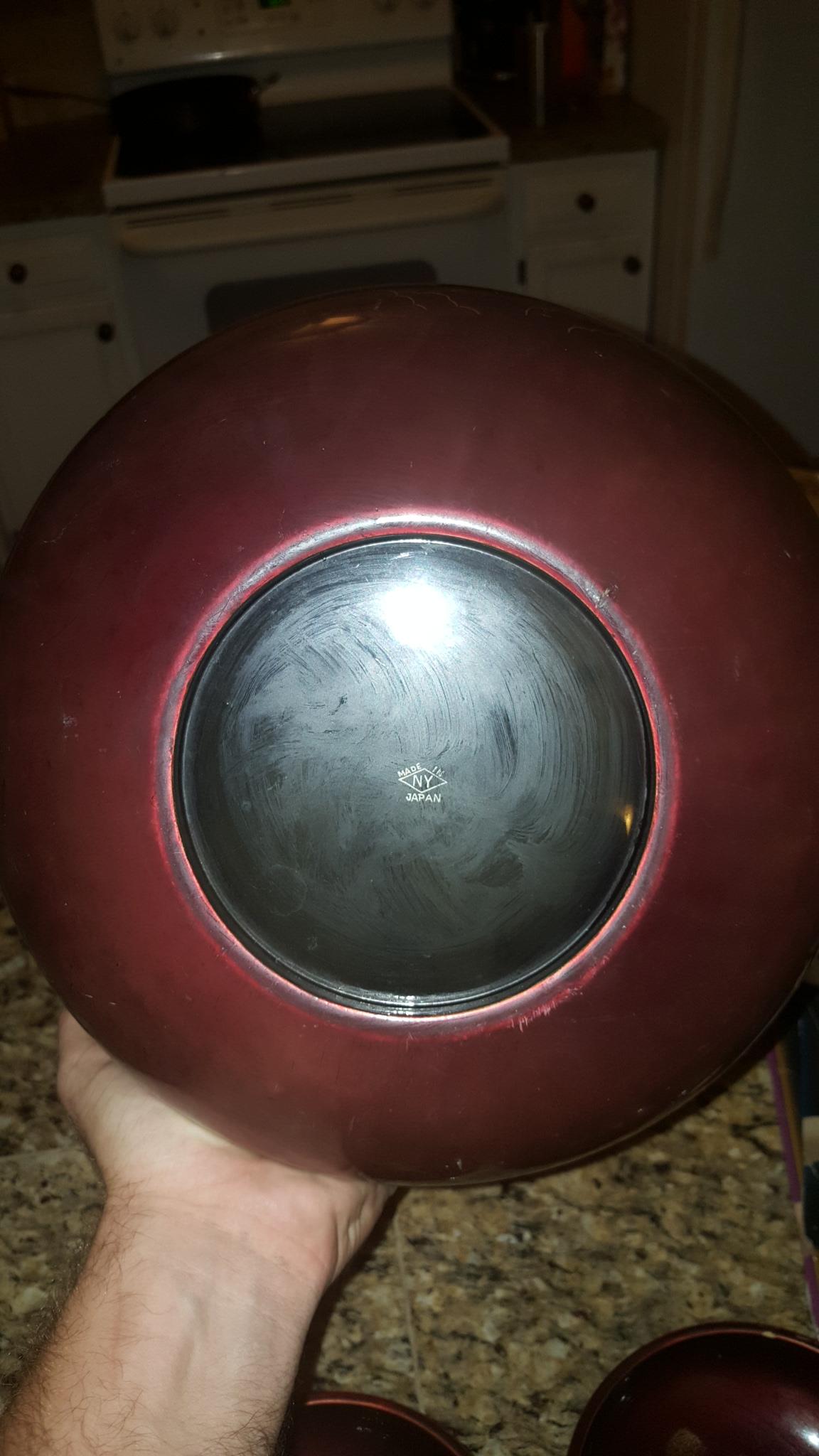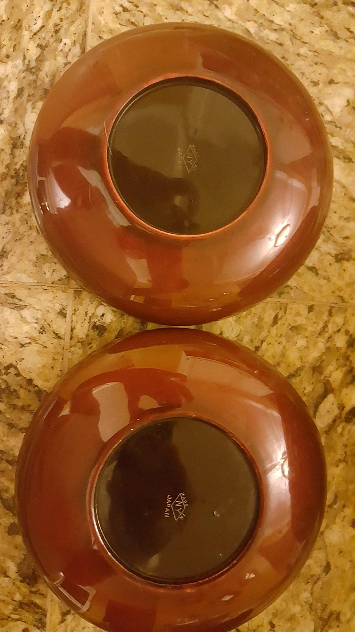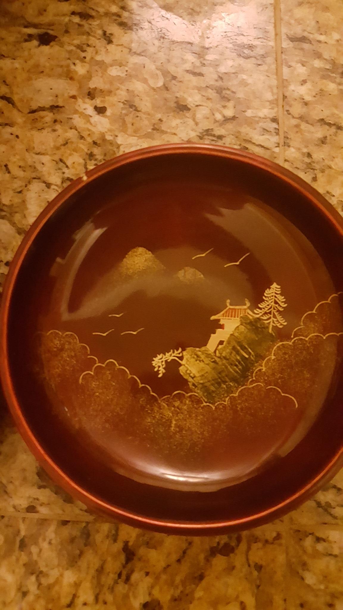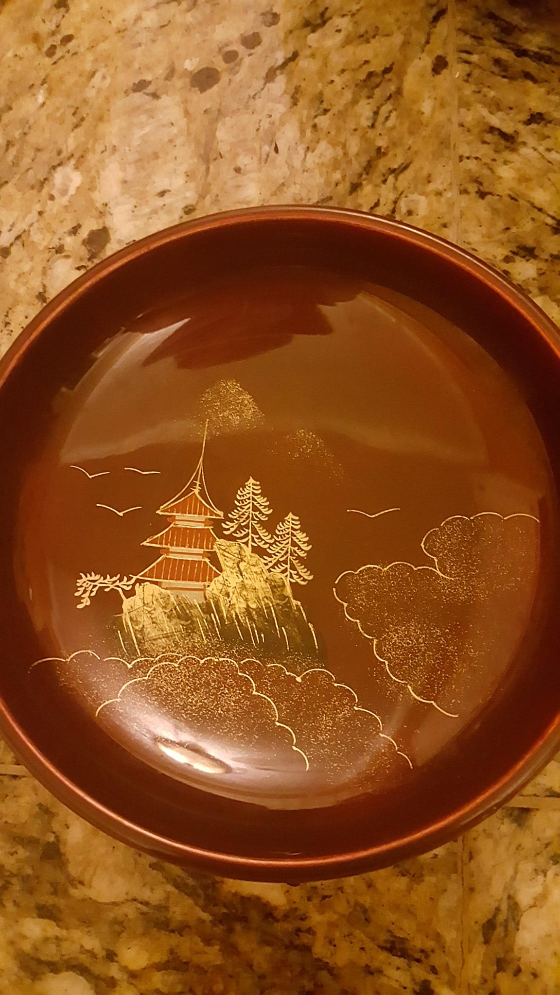 I acquired this 5-piece set of Japanese lacquerware through a job contract. I don't know if this set is complete but they do say "Made In Japan" and "NY" on the bottom of each. Maroon in color with oriental artwork in mainly gold and black. A few chips on top edge of small bowls but all artwork is perfectly visible. I know almost nothing about these and their value varies greatly so any help is much appreciated.