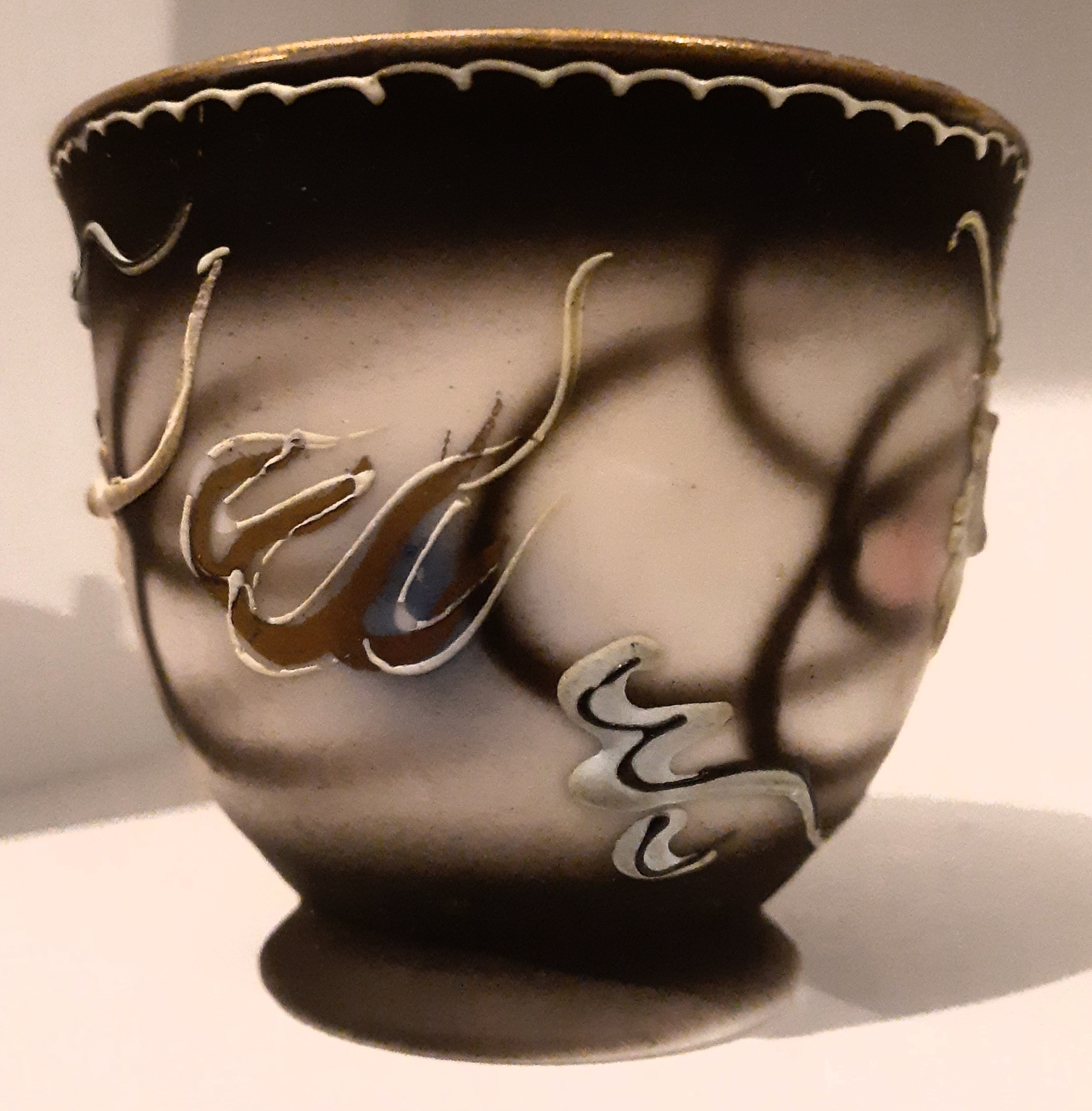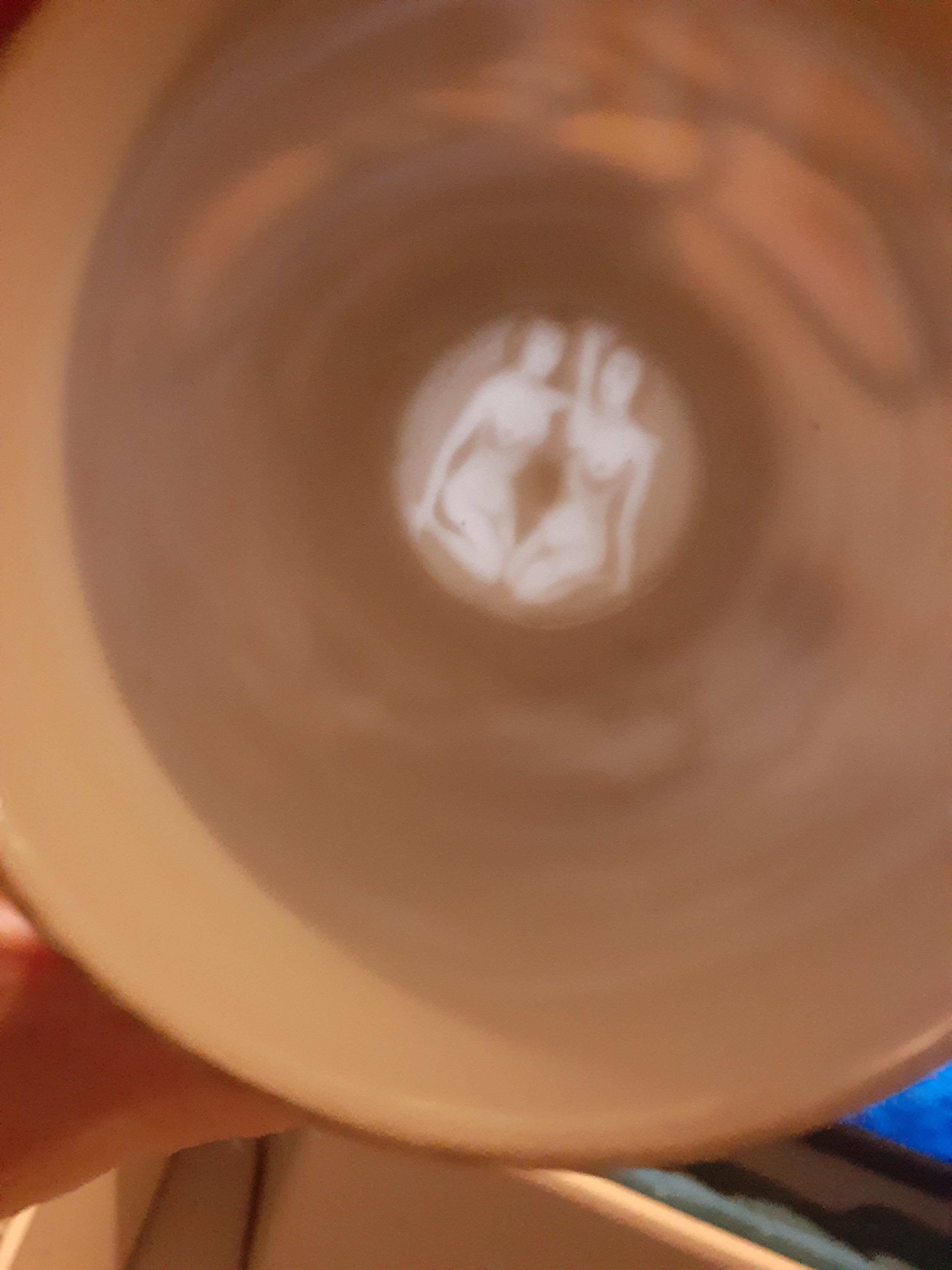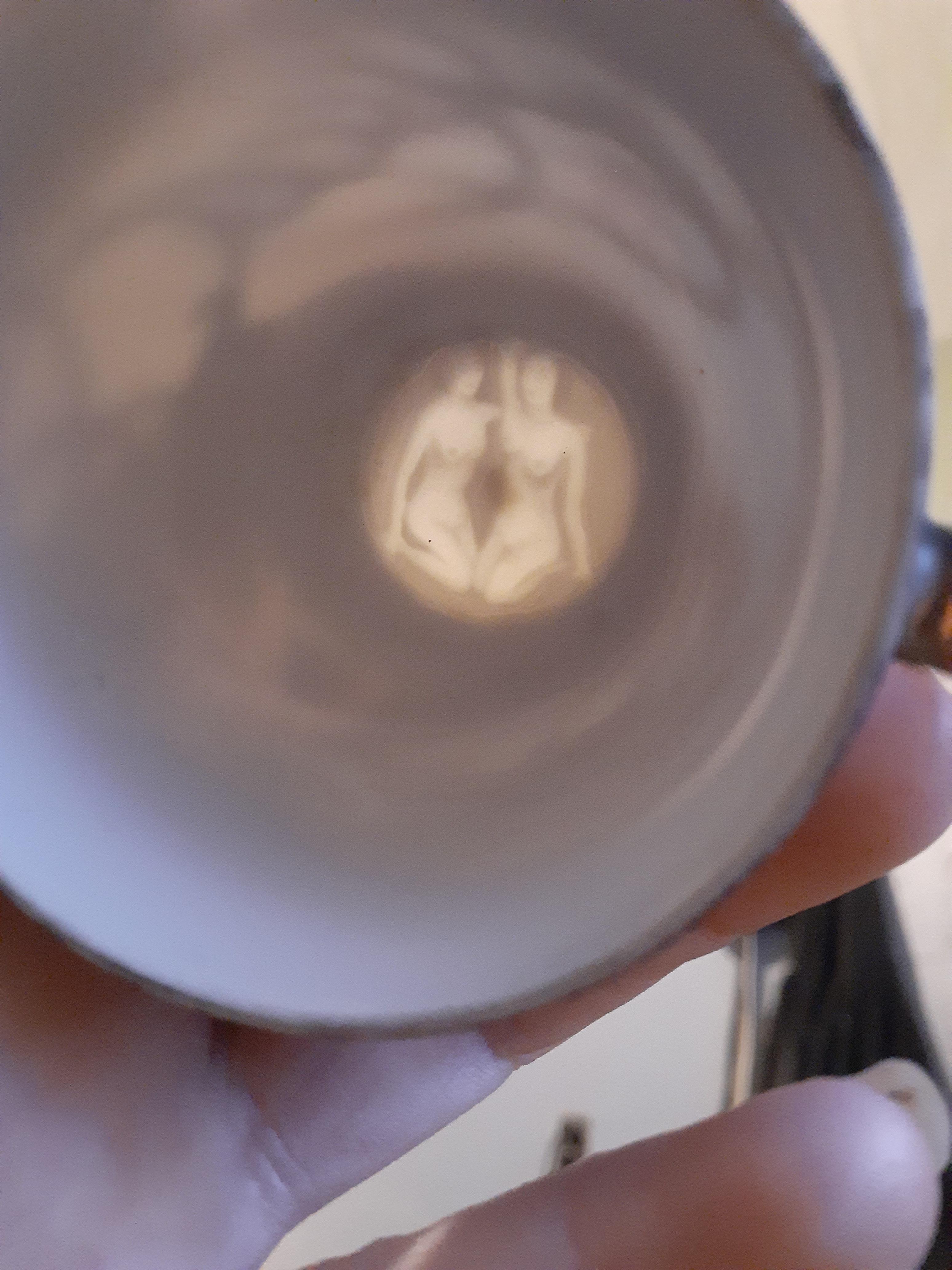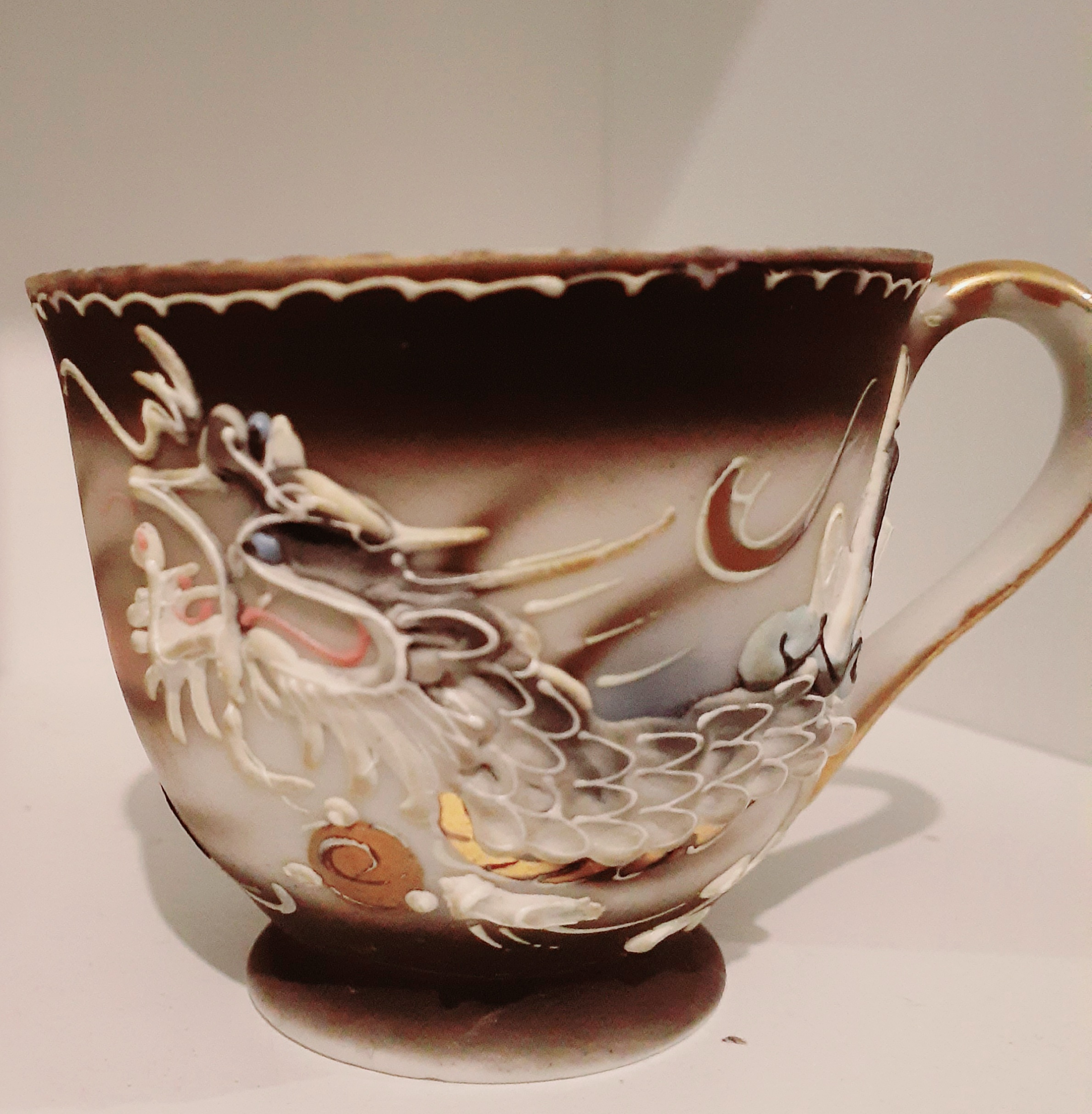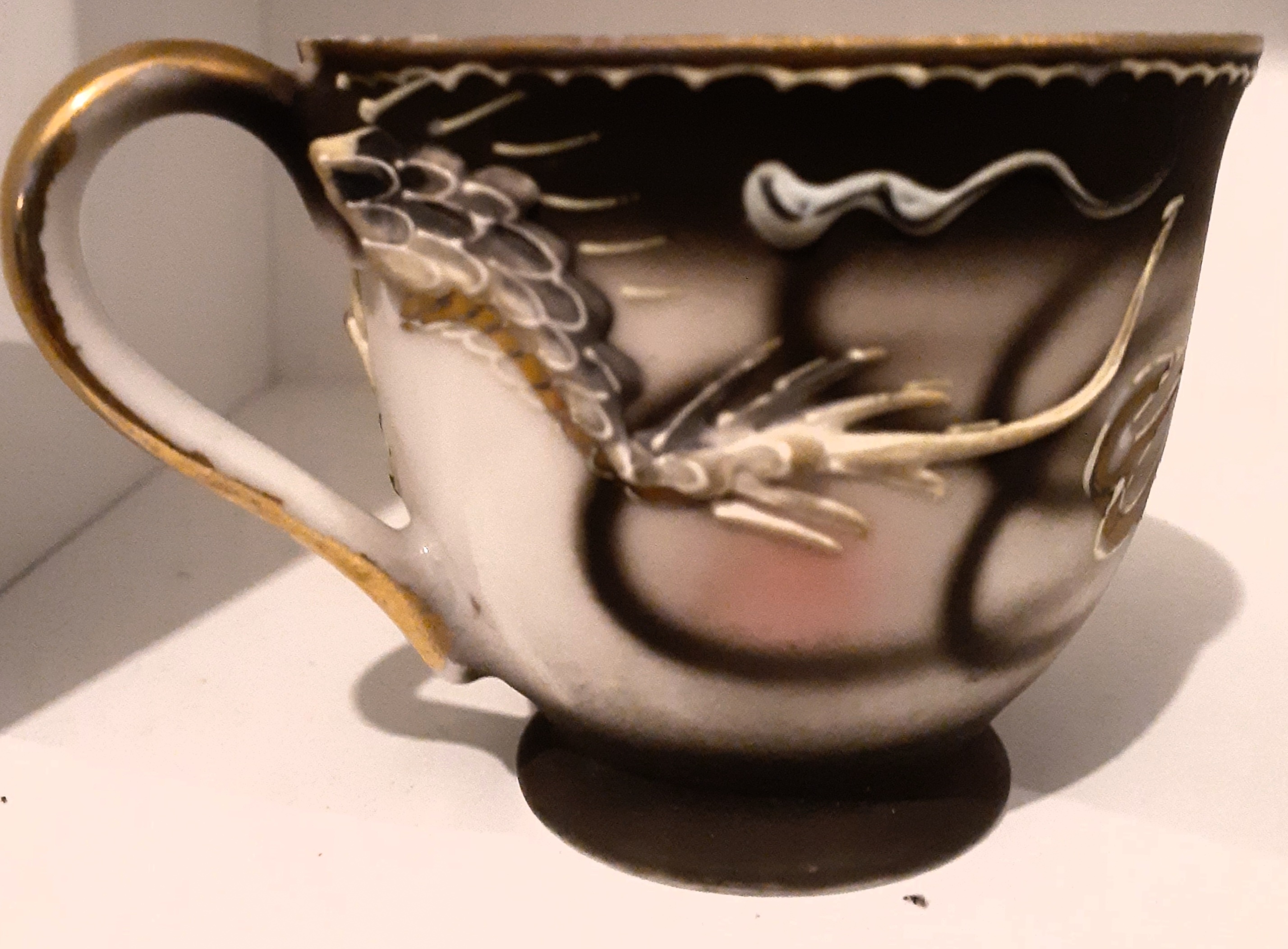 Japanese Moriage lithophane Dragonware Tea cup with 2 nude pin up style geisha girls at the bottom. No markings on the bottom just the lithophane.