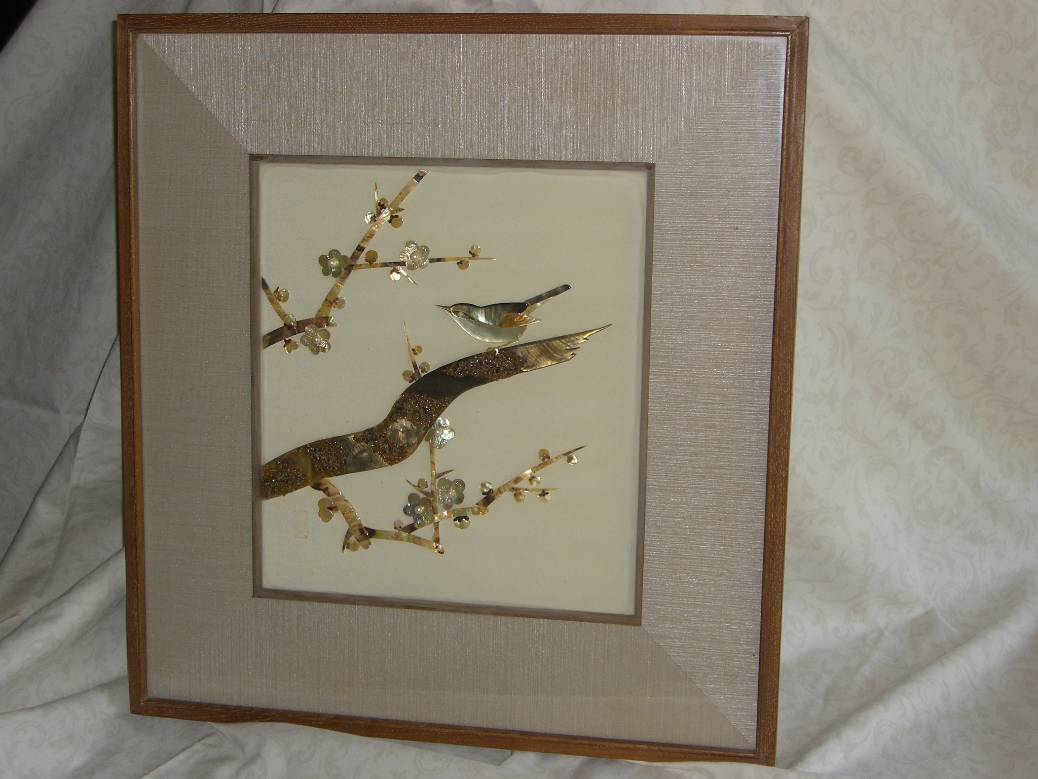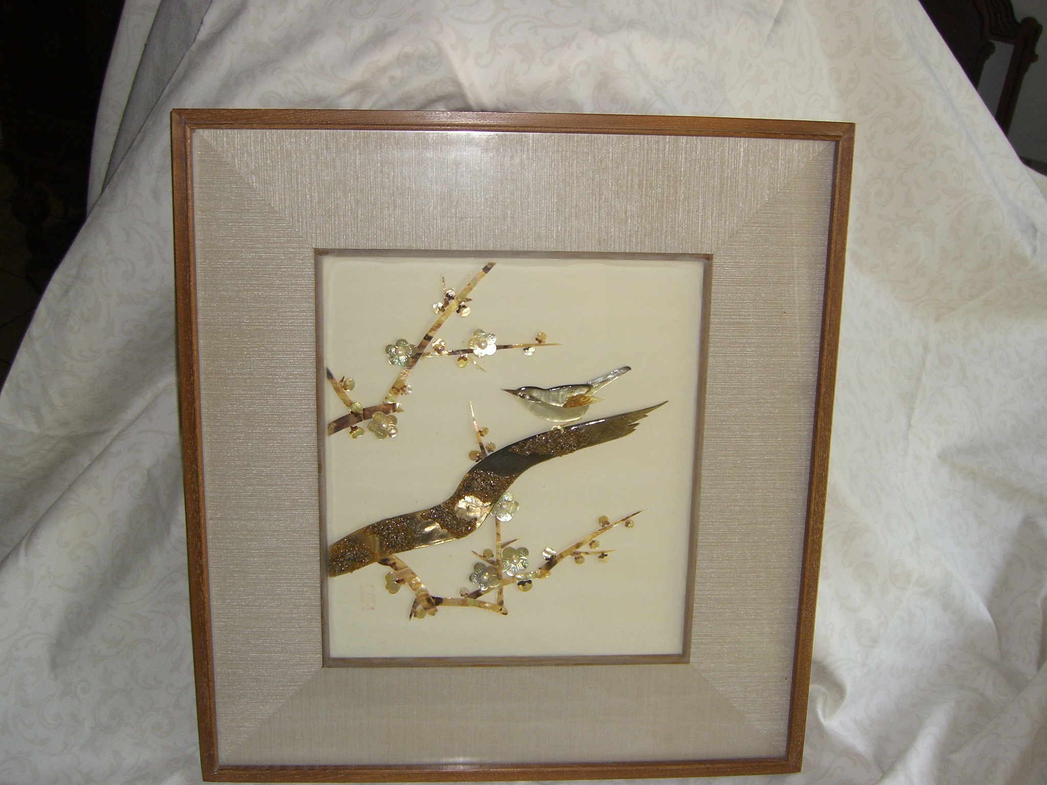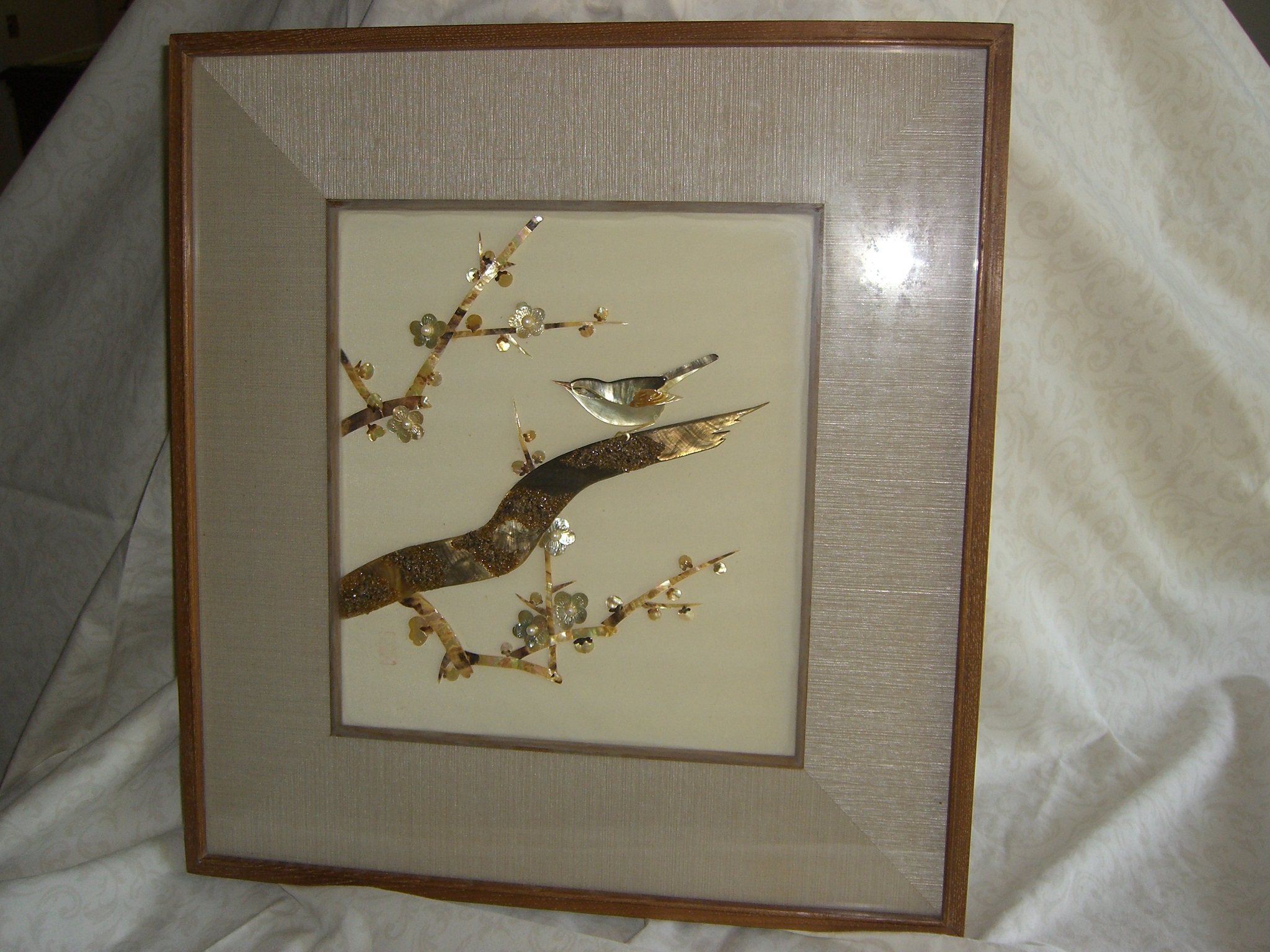 Purchased at Mikimoto Pearl Store, Japan, in 1967, mother of pearl framed picture of birds and flowers with seven real pearls attached to mother of pearl.  Red rectangle mark is located on lower left corner of picture.  We are desiring an appraised value for the framed unit.  It is in excellent condition.  Additional pictures are available.