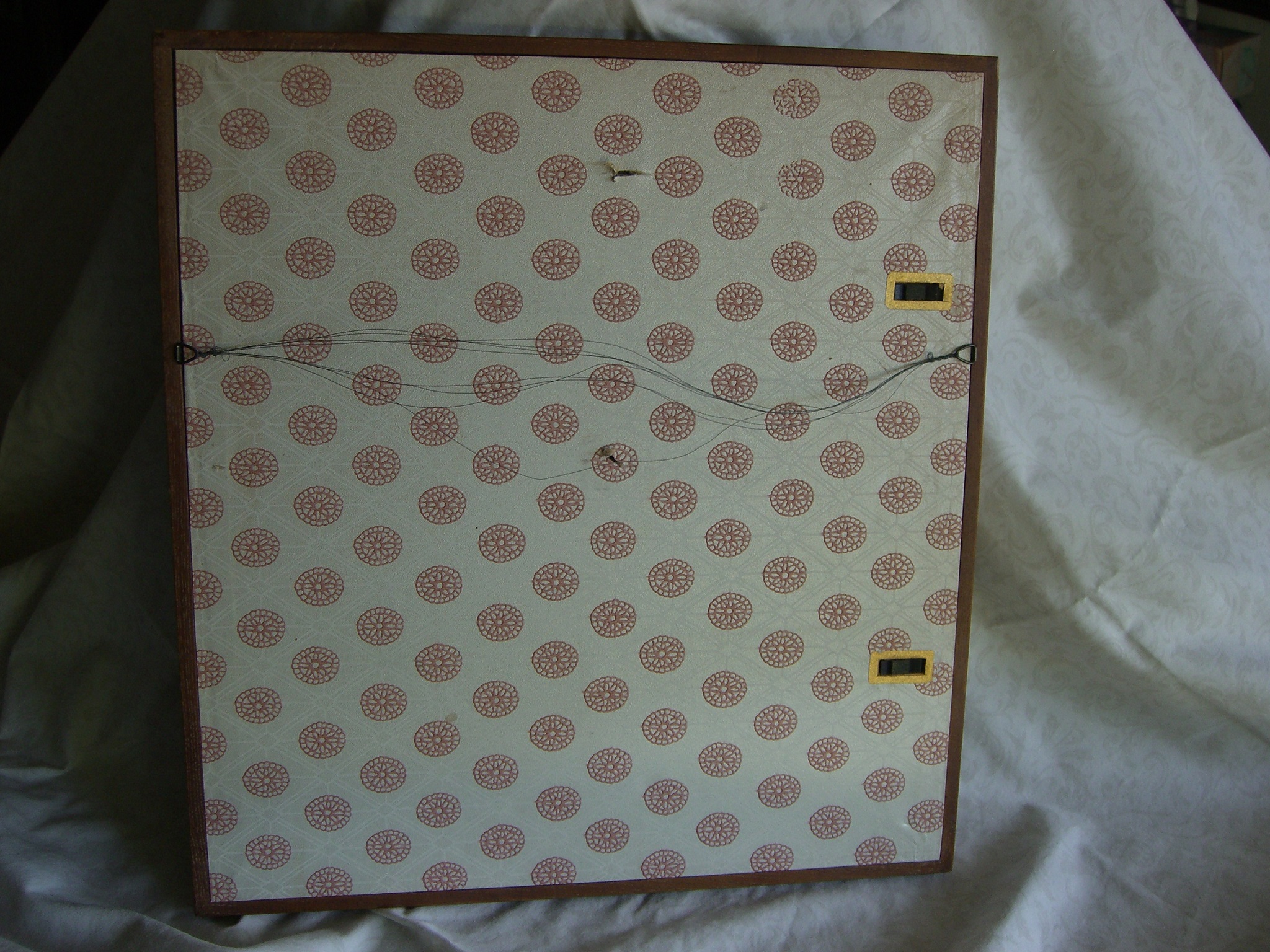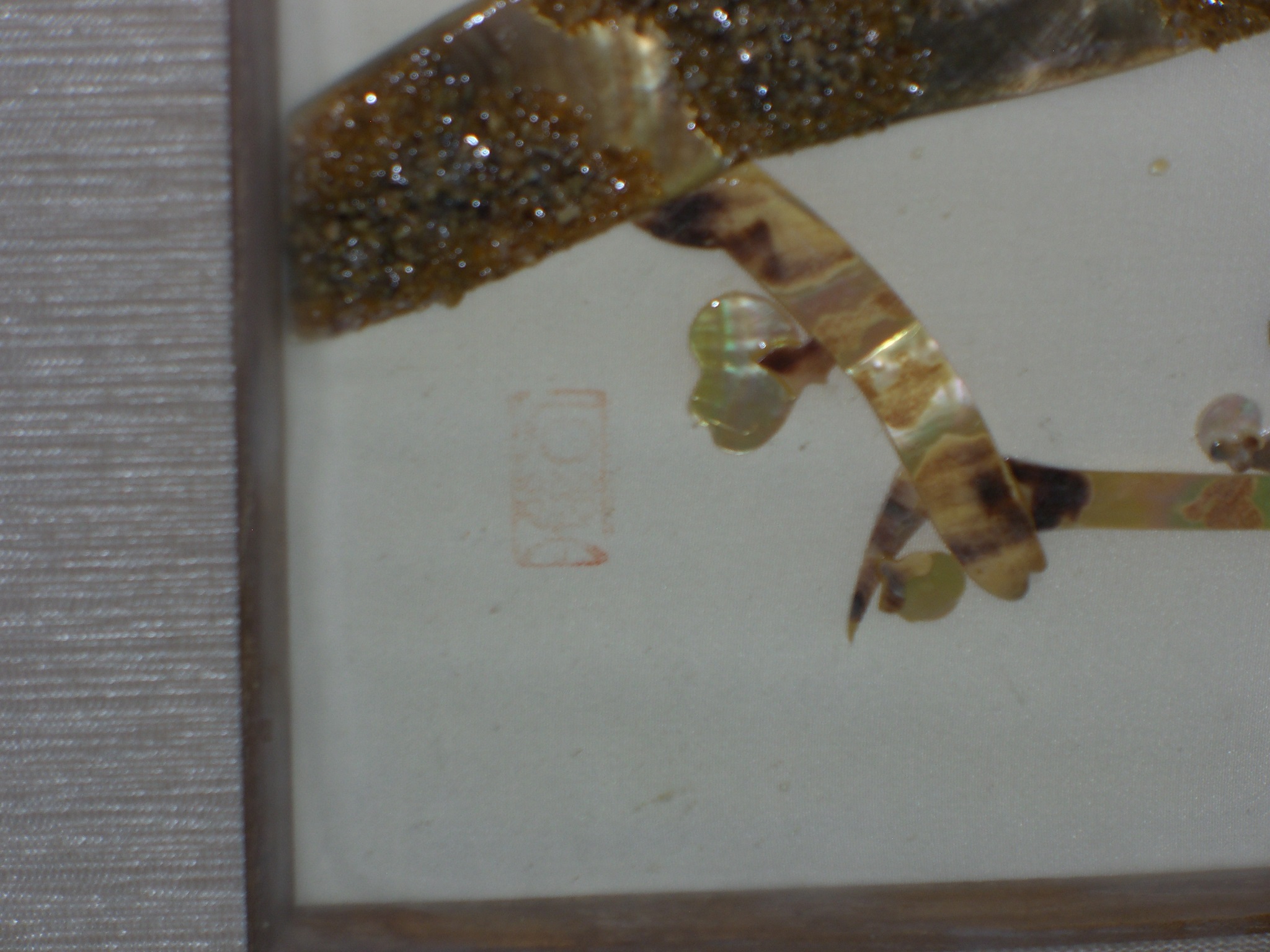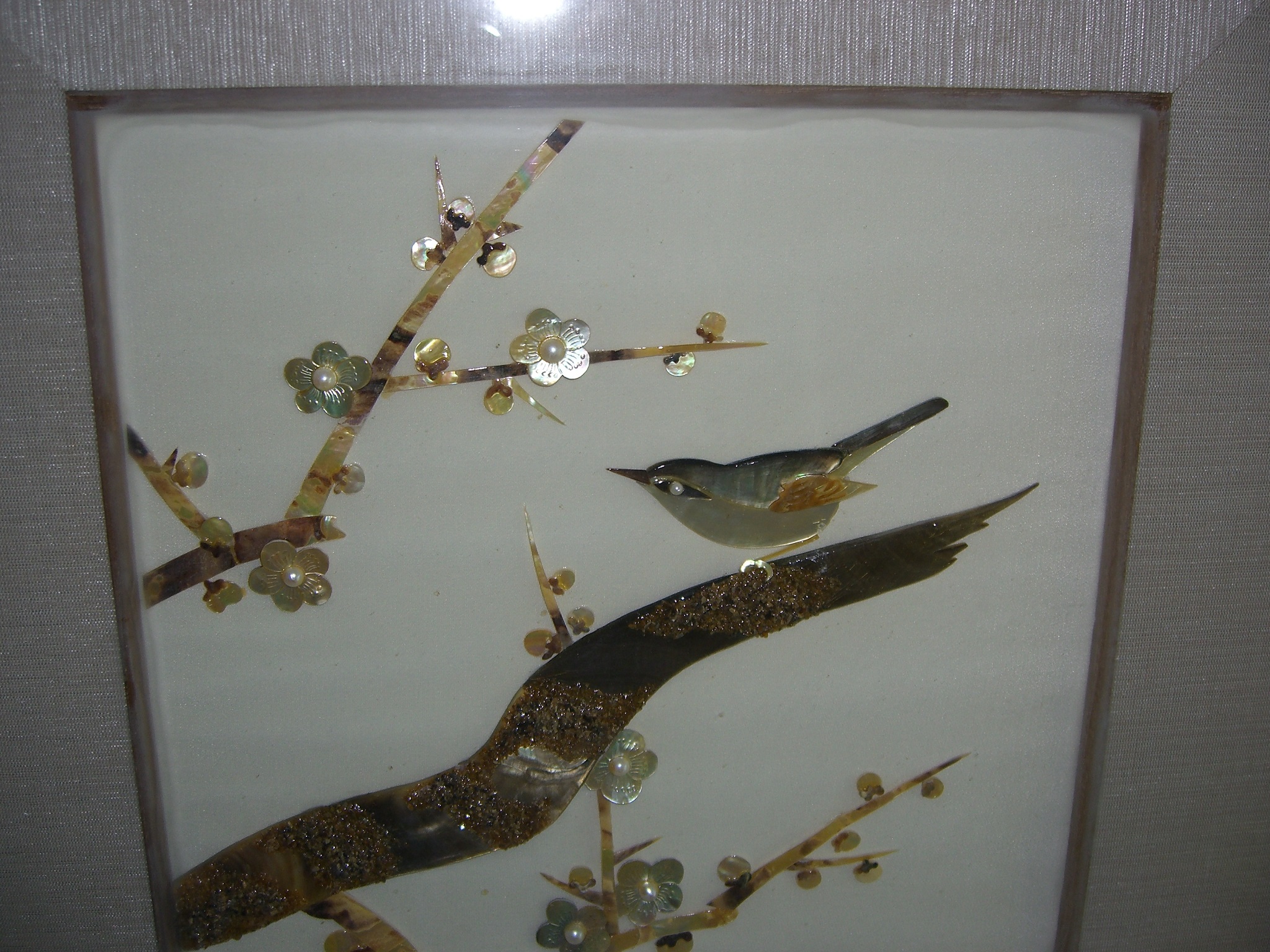 Purchased at Mikimoto Pearl Store, Japan, in 1967, mother of pearl framed picture of birds and flowers with seven real pearls attached to mother of pearl.  Red rectangle mark is located on lower left corner of picture.  We are desiring an appraised value for the framed unit.  It is in excellent condition.  Additional pictures are available.