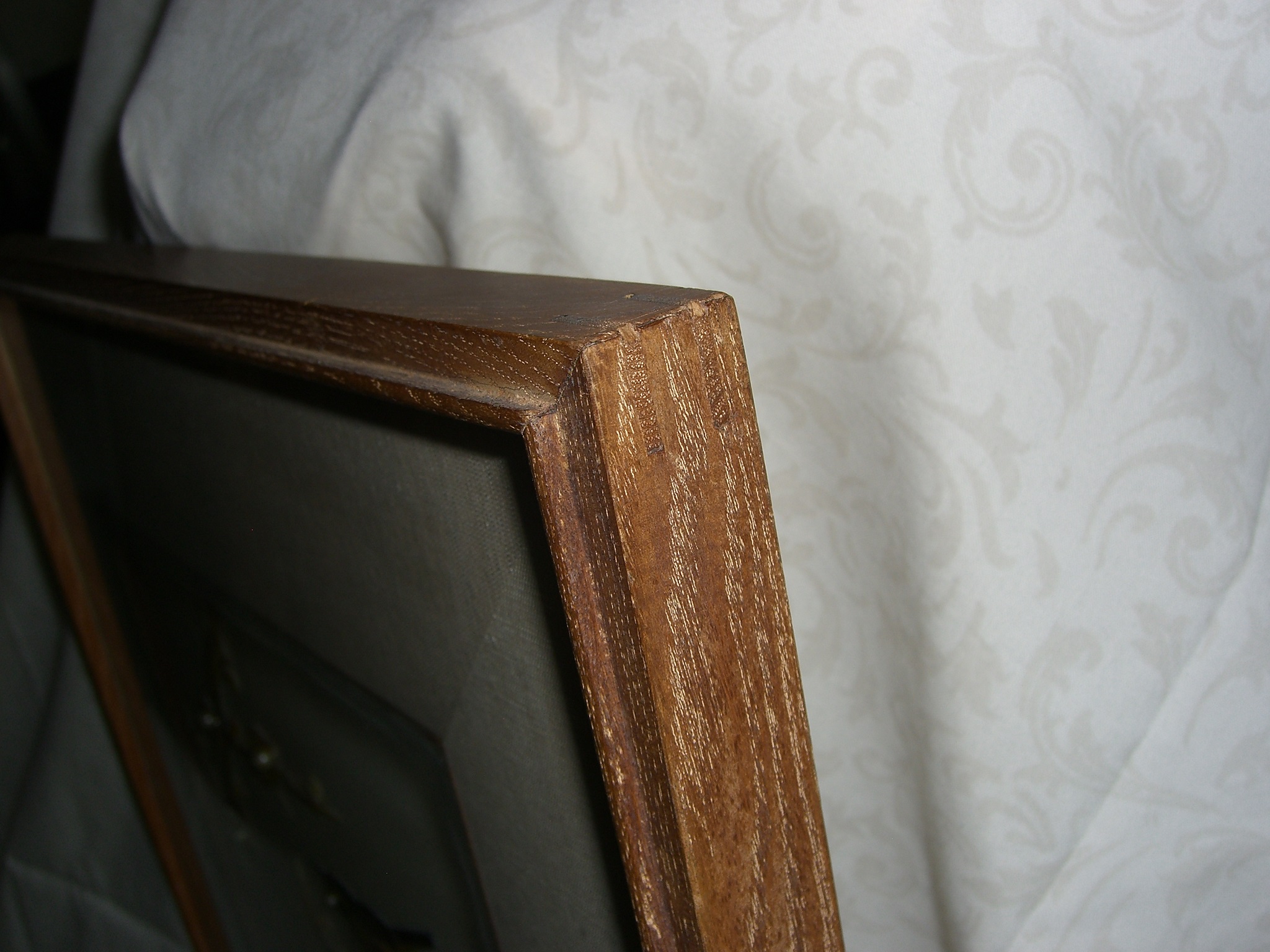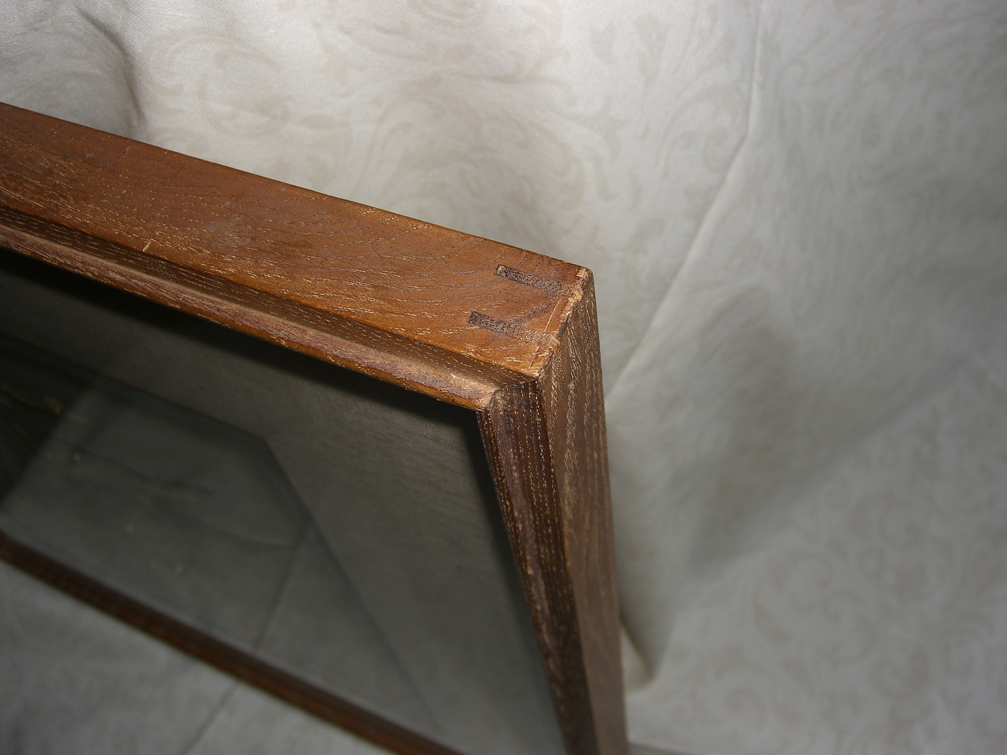 Medium Mother of Pearl, Real Pearls, appears teak wooden frame with biscuit joints in corners, frame matt appears to be silk, glass covers picture.
