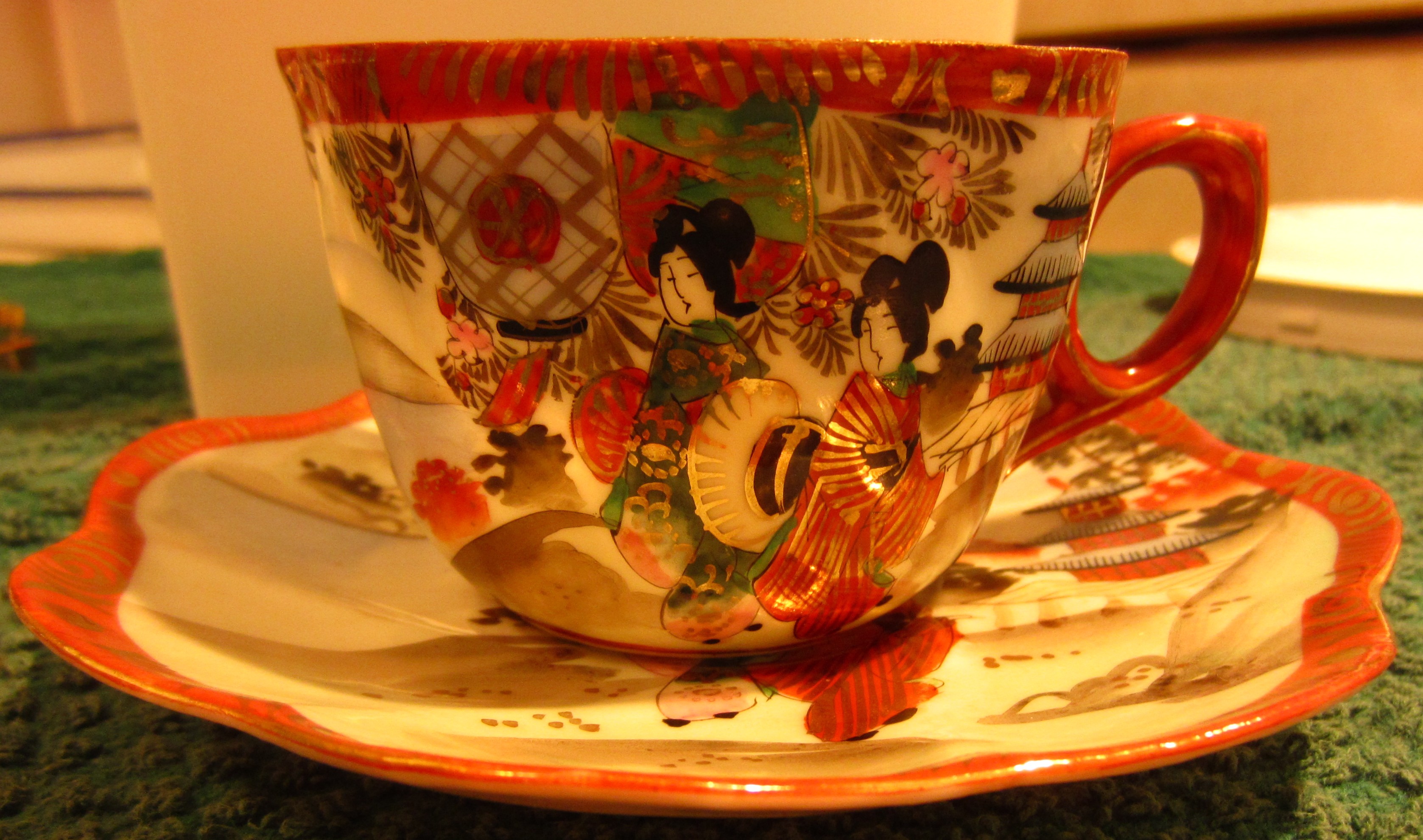 This is a matching moustache teacup and saucer with Japanese characters on the bottom of each.  The image is of two women in the countryside.  I found it in my forgotten things at my home in the Chicago area.