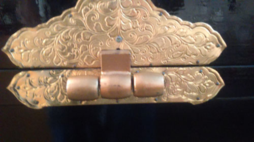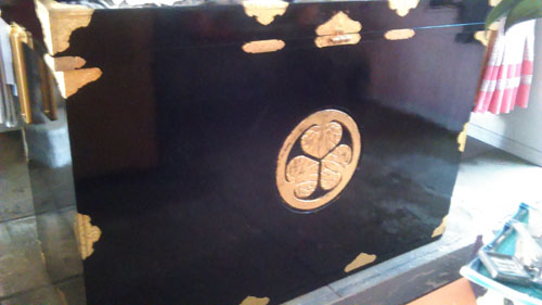 This was given to me. I was told that was in Beverly Hils Home. The box is quite large. It is 4ft tall and 6ft wide. The inside was once lined but it seems the lining was removed and the wood is exposed. I researched as much as I could. The symbol on the front is from the Tokagowa Family crest (hollyhuck flower). Back in the days it was a wedding gift. The bride would put all her belongings inside and then two men would move it with sticks to her new house where it was used to put sheets and linen.