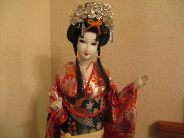 This is a tall (18") Japanese doll made of silk. She was purchased in Japan in the late 1960's.
