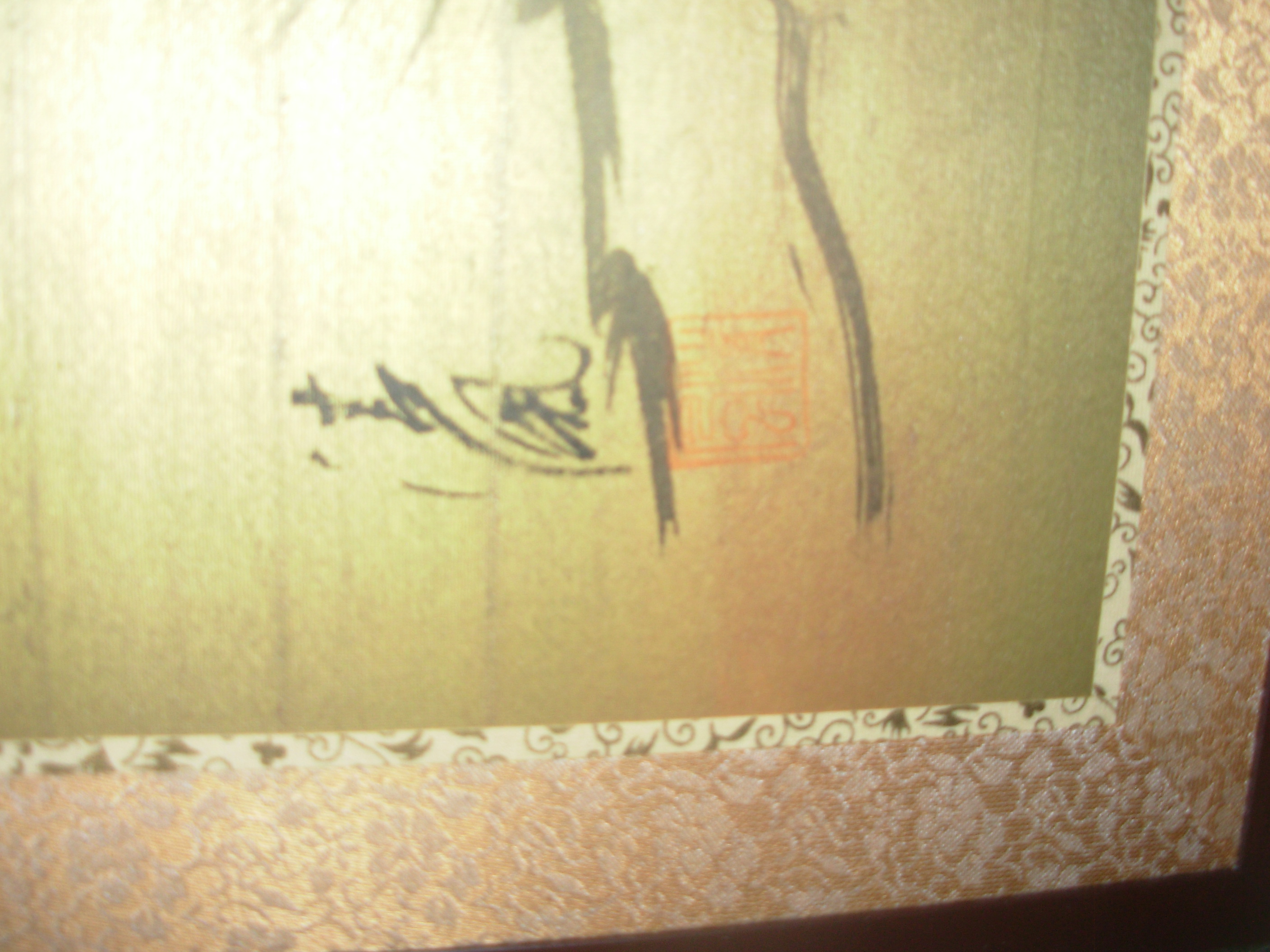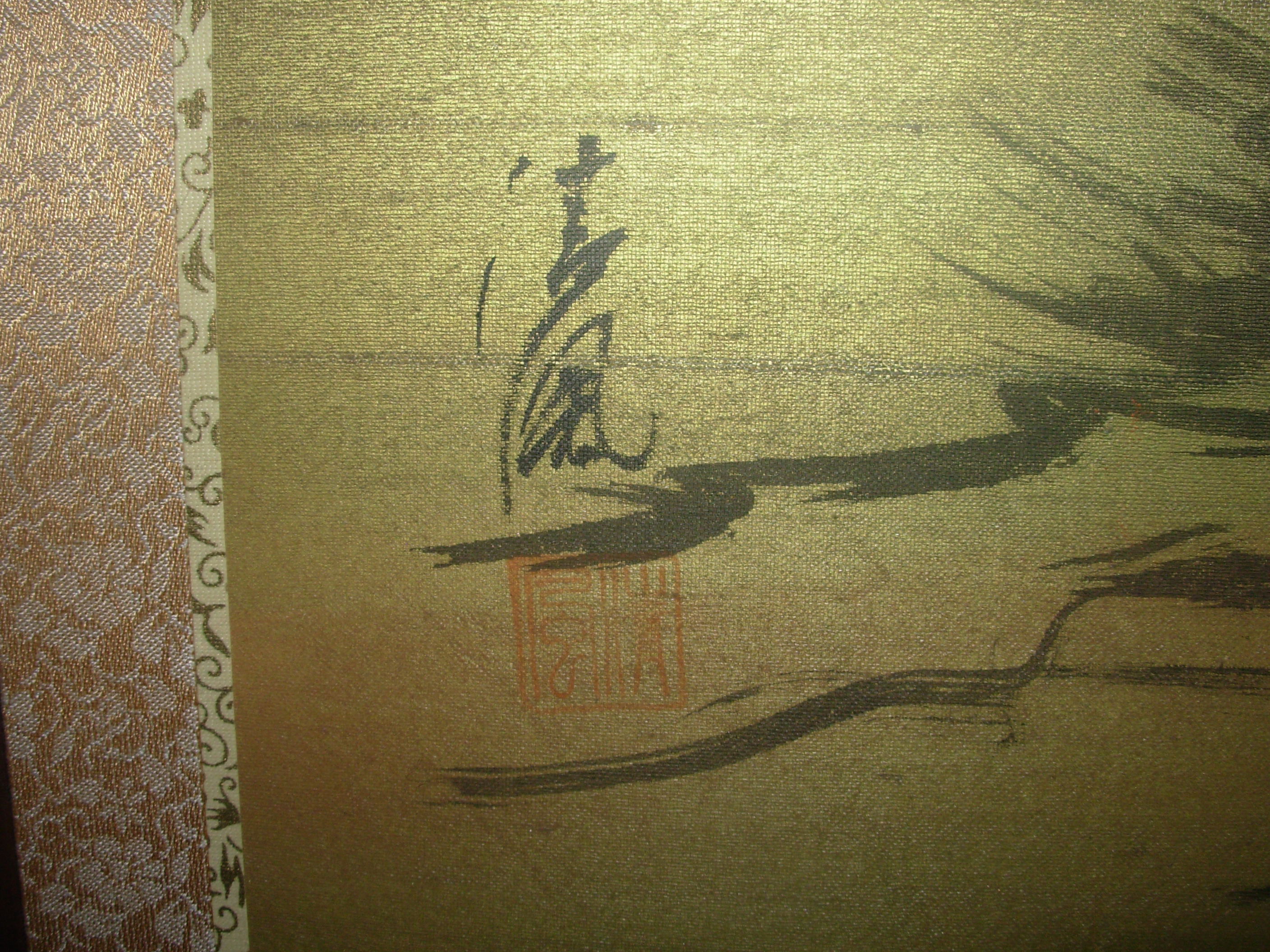 painting on a four panels of silk. the painting is a village in the mountains,next to a river with a bridge and a man crossing it.