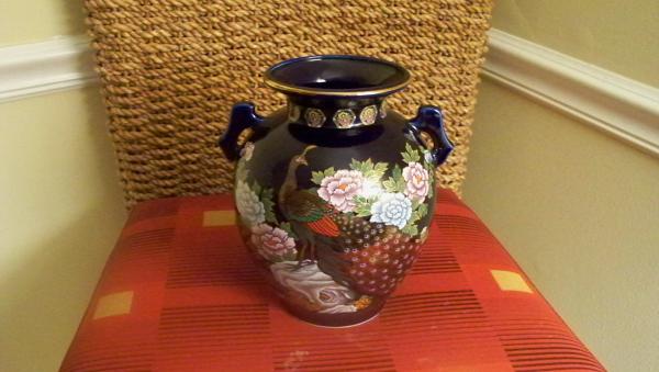 It is cobalt blue. It appears to have a gold trim at the mouth. It has two peacocks and multi-colour flowers. It has handles