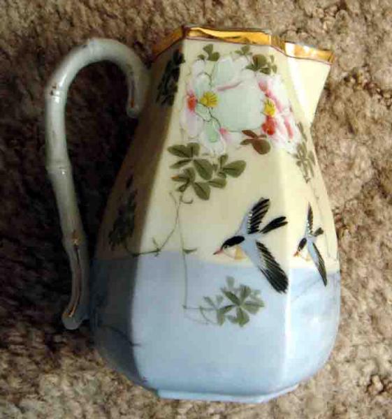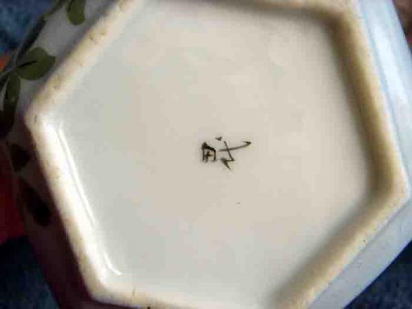 The only makers marks are the knaji in the photo. It has a crack visible in the photo of the single bird, runs from lip through the birds tail.