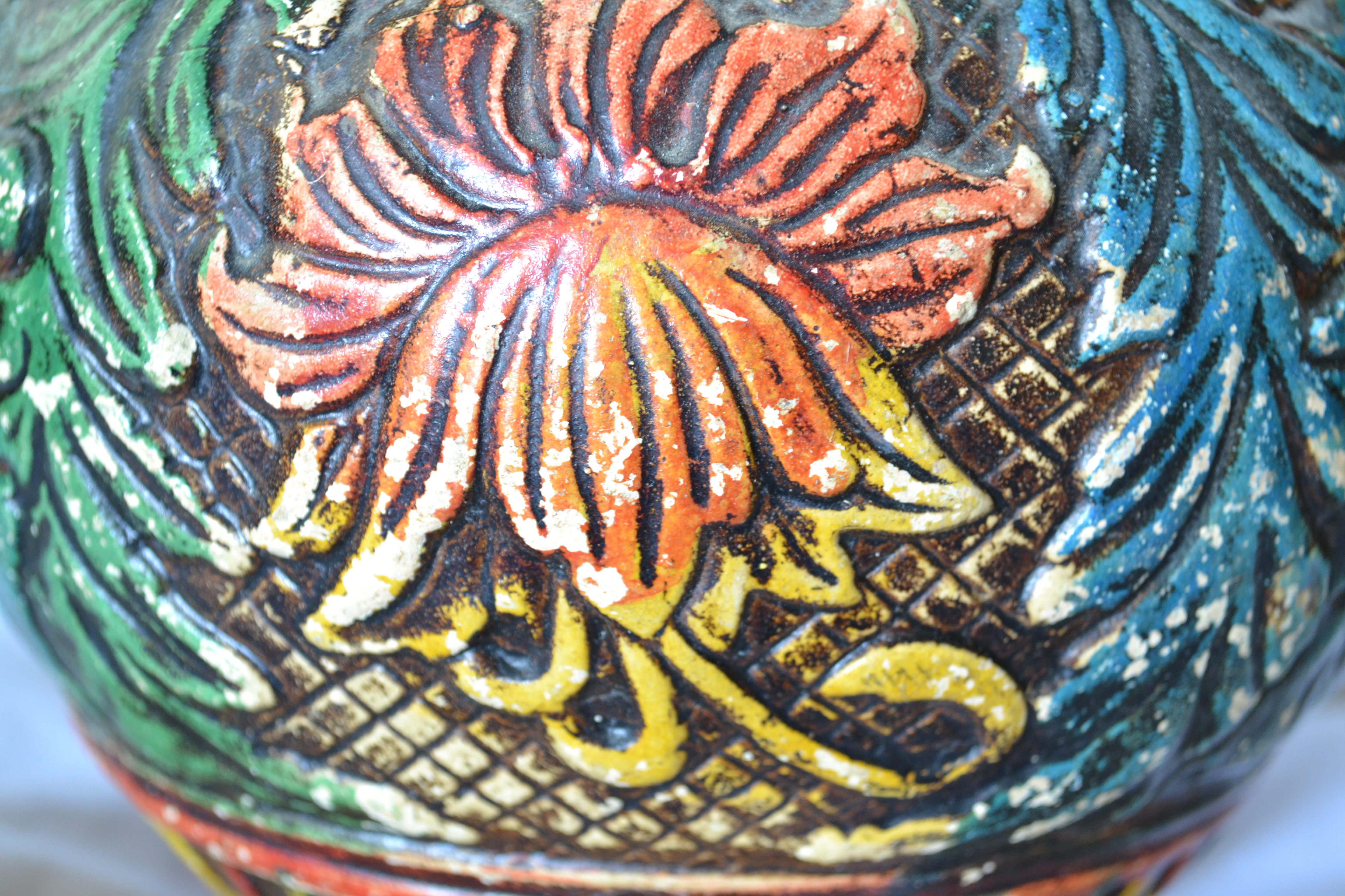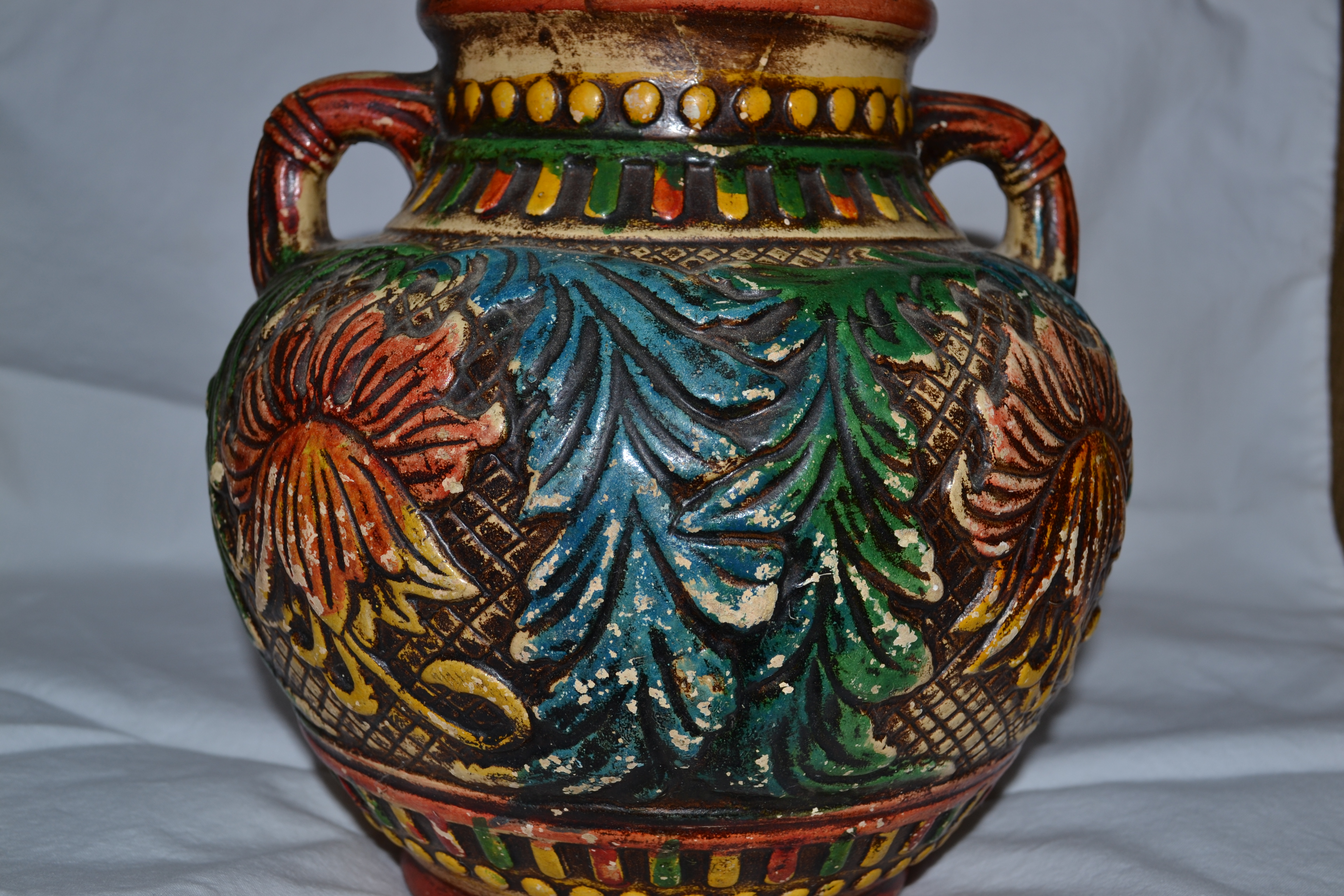 My uncle served in Japan during WWII and I think he may have purchasedd this for my grandmother there. It has no chips, but does have some rubbing off of the paint. The flowers, leaves, etc are raised.