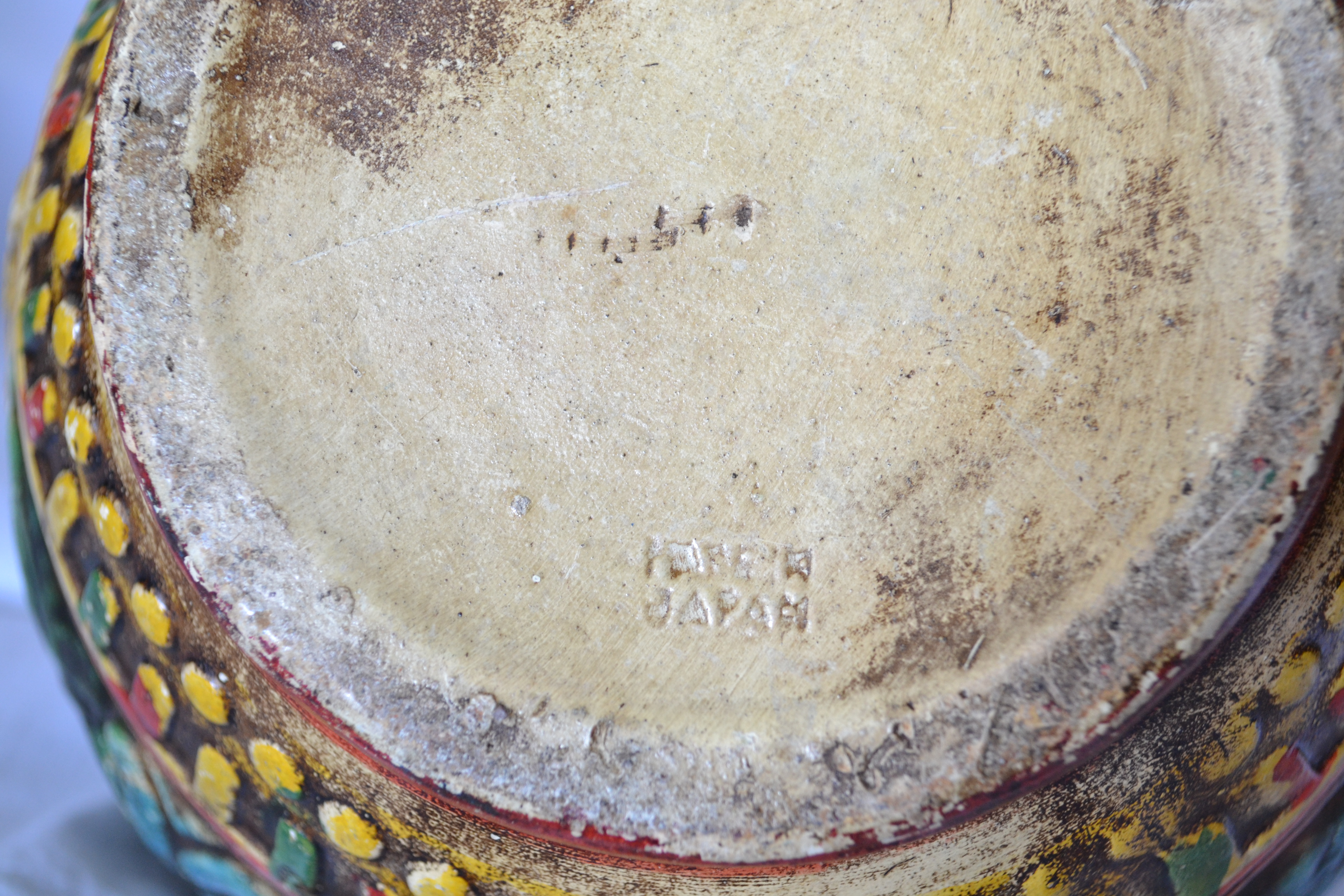 This colorful vase has been in my family since before I was born, it belonged to my grandmother. It is marked "JAPAN" on the bottom with another marking directly above that I cannot read. It also has some markings in the middle of the bottom that look like numbers, but I'm not sure.