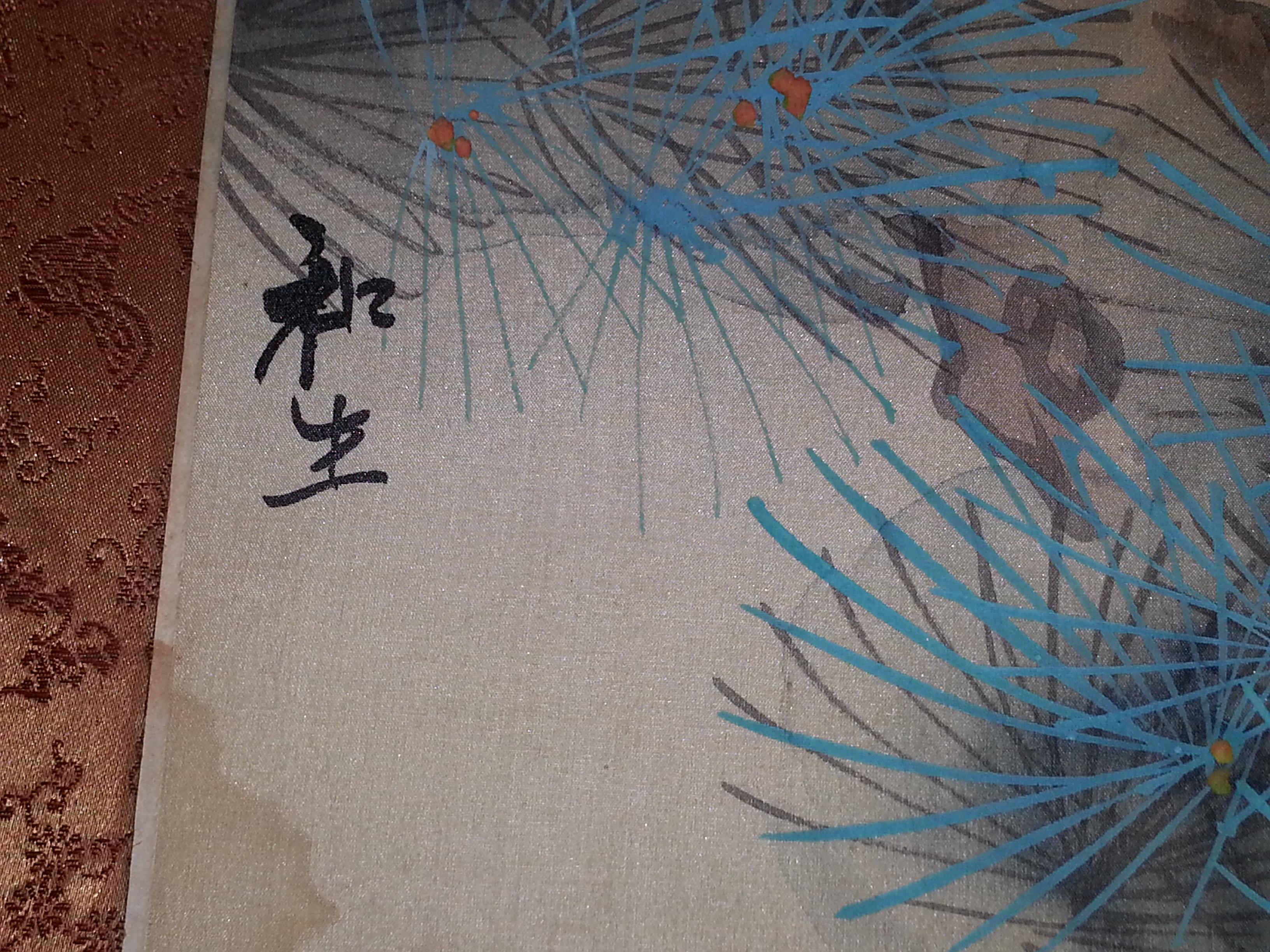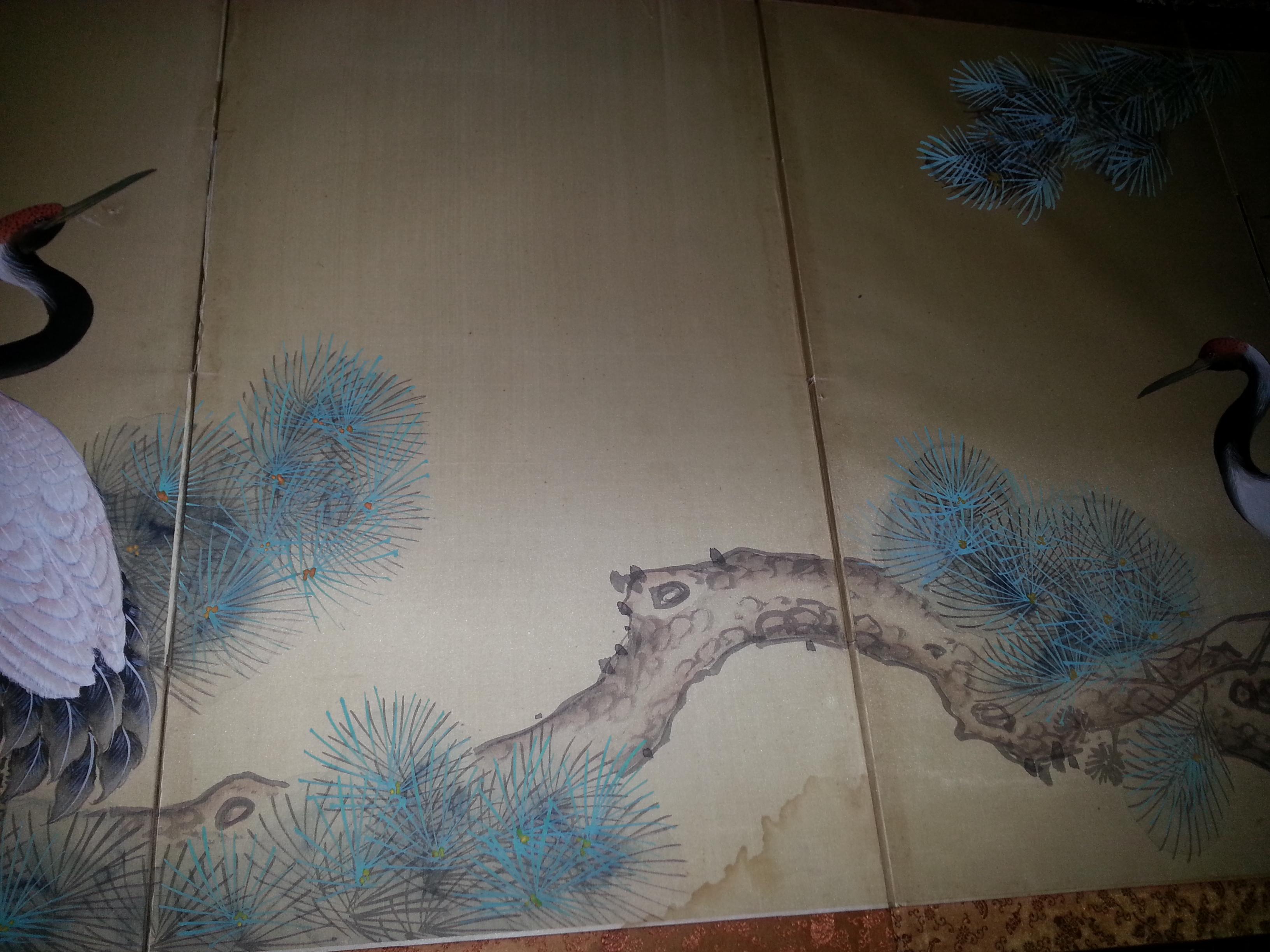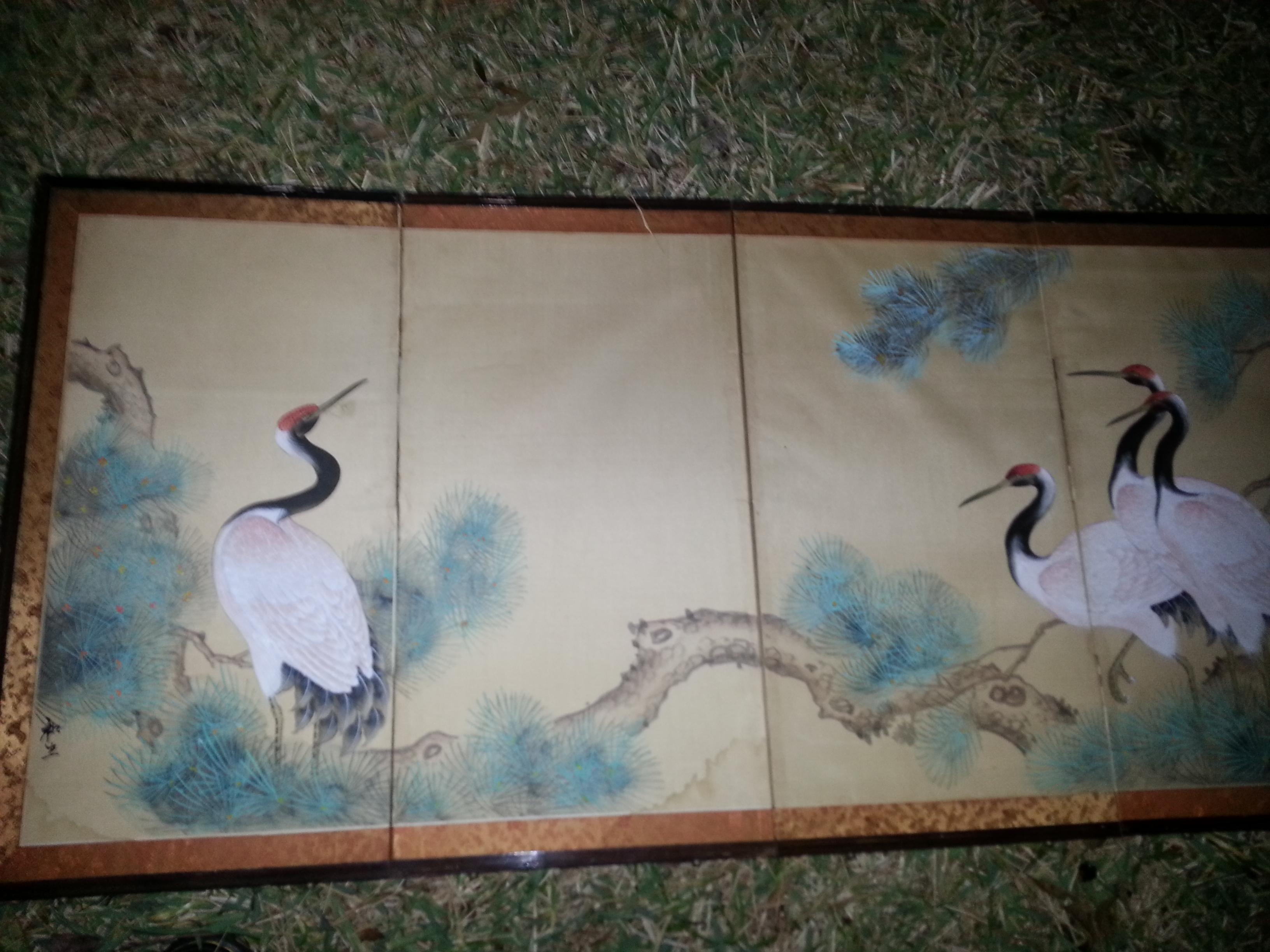 I know nothing about where to begin with Asian art. This is not the only piece that is in dire need of identifications. This is interesting in the way it folds into four sections and the painting folded up looks nice due to the hardware and subtle print on the back. There is an apparent signature on the left mid to upper portion of the piece. I don't read Japanese so I am making a vague educated guess that is what it seems to be. This is in very good condition but has a few flaws, none are noteworthy and are able to be seen if looked like hard enough. The hardware is not too detailed but it is ornate to a limited degree. The hardware appears to be brass and is original. I do not know what medium this was done in. Your assistance in the identification of this is as always much appreciated. Any information you can share I will be ever so grateful for.