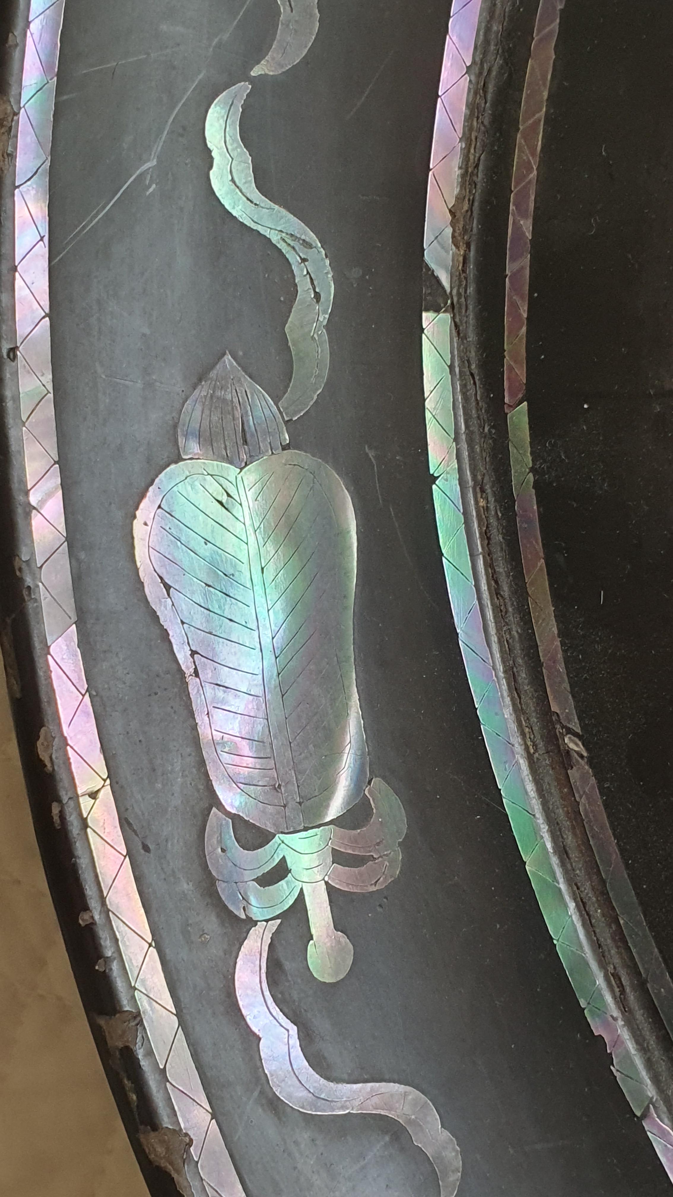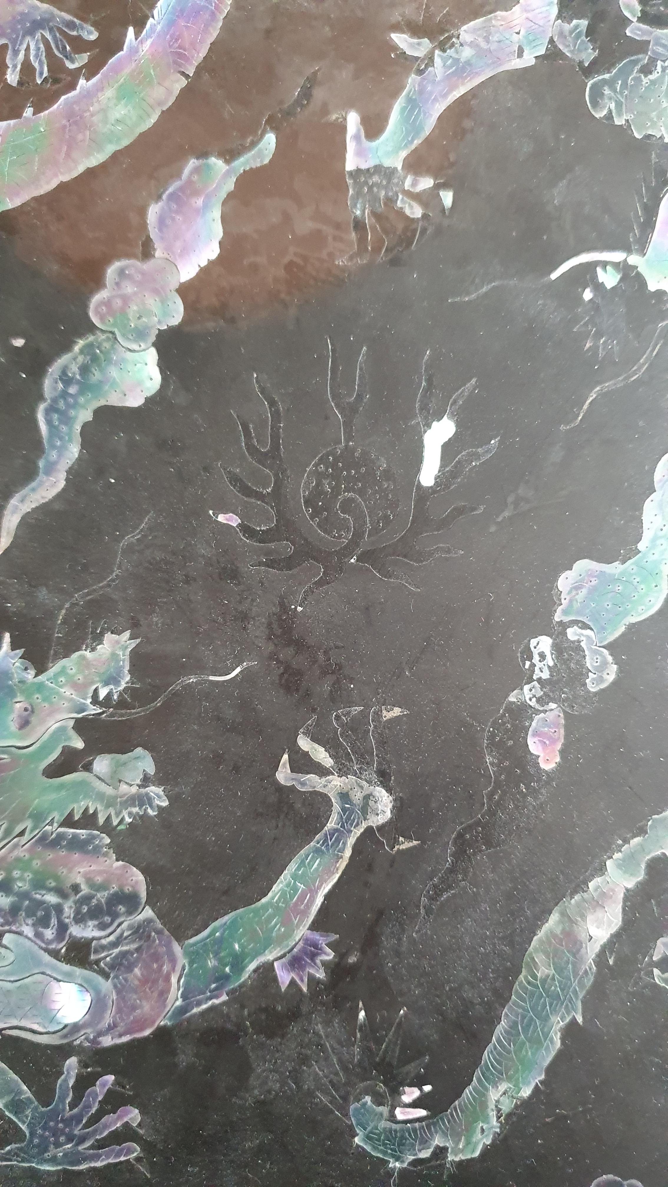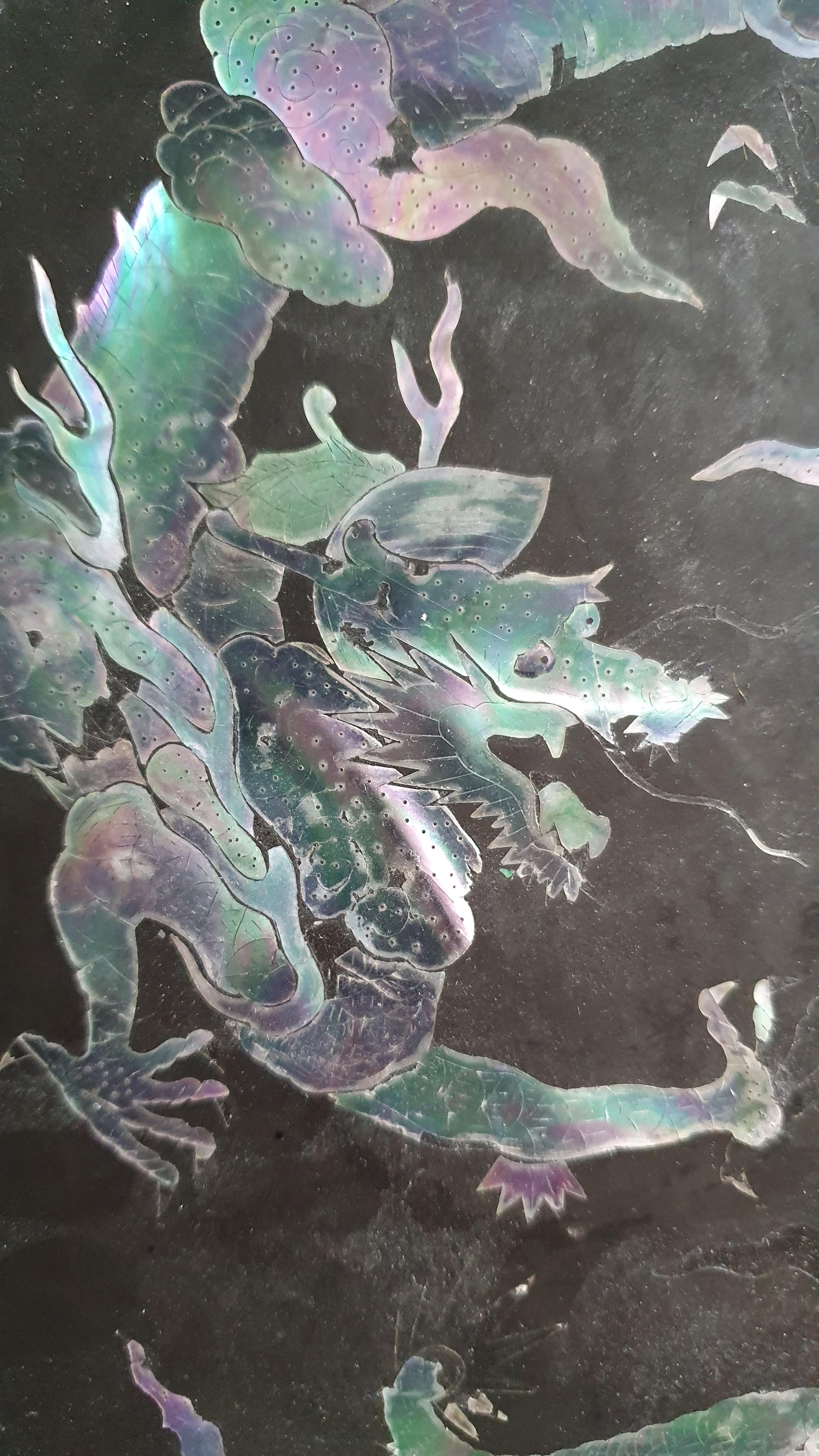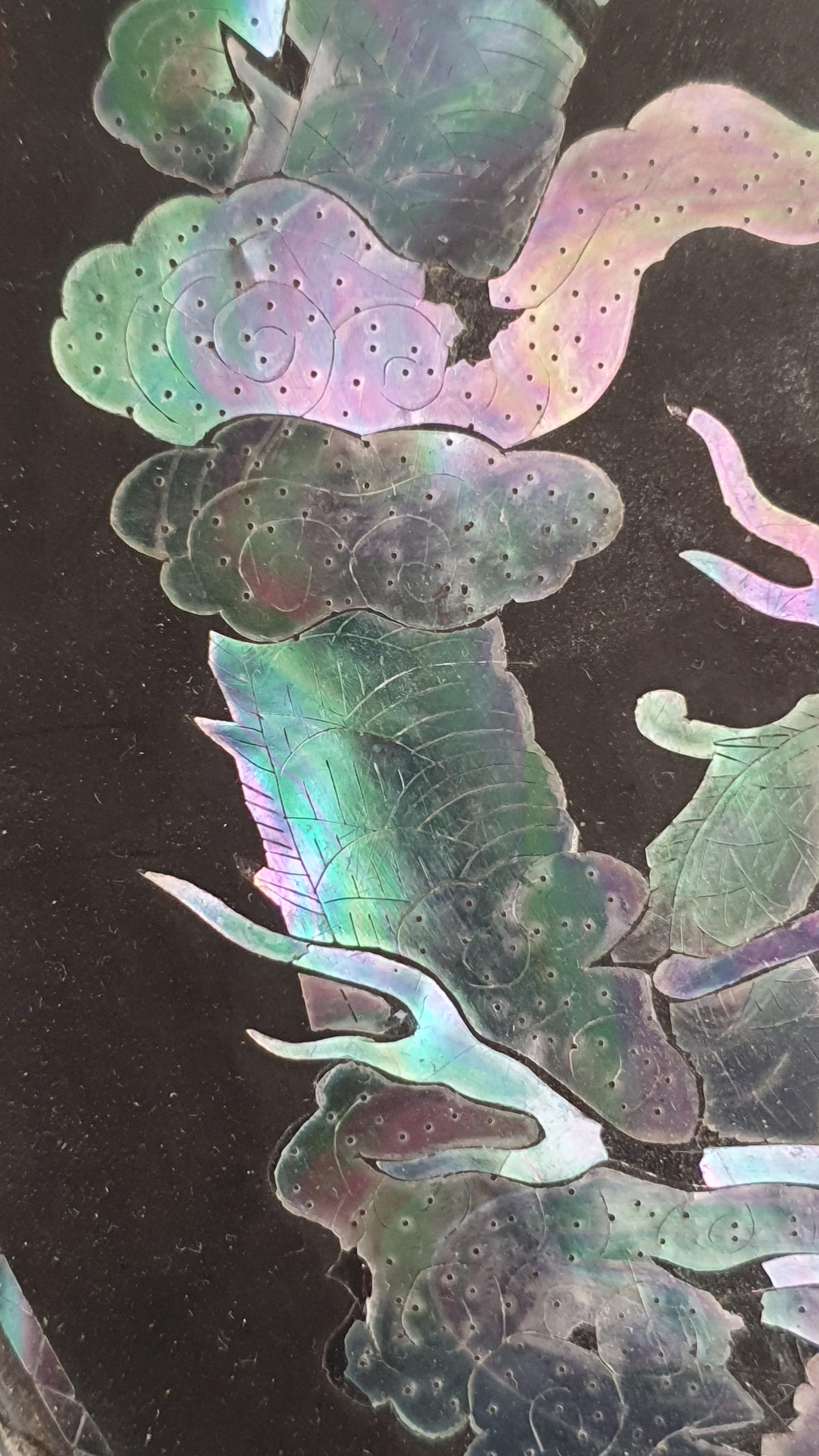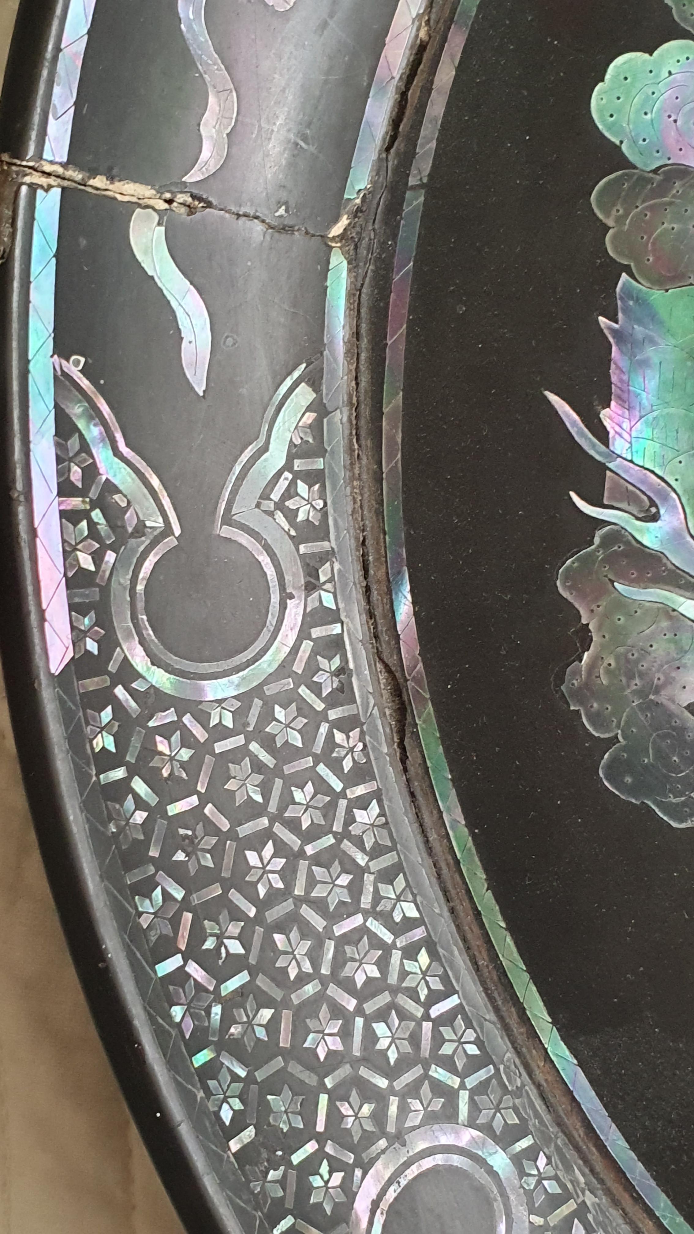 Black lacquerware tray measuring approx. 35cm across, with two mother-of-pearl five toed dragons with flaming pearl in the centre. Daiper pattern around the rim as well as auspicious symbols?